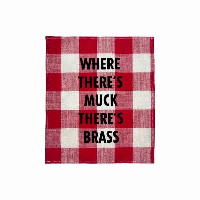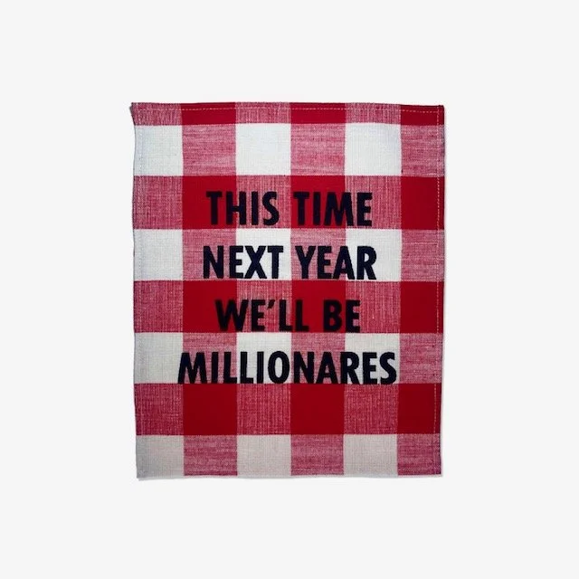 “THIS TIME NEXT YEAR” and “WHERE THERE’S MUCK” come in the form of 30 x 25 cm gingham linen, hand screen printed in Corbin’s Bethnal Green studio. Available to buy from corbinshaw.com at 6:00 pm (BST) on Friday 8th July 2022.