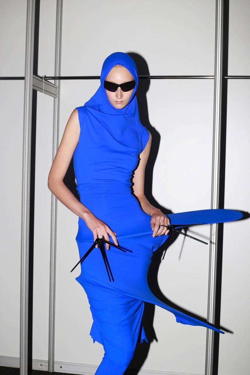 ONRUSHW23FH: Well Onrush was built by us two, Albert Sanchez and Sebastian Cameras, in 2020. It was actually right after Spain's lockdown. We were both living in London before that and had the chance to intern at David Koma, allowing ourselves to grow in the design scopes and how the industry and a fashion studio works. If we would have to introduce what ONRUSHW23FH is, we would say it is an experimental project which developed into a high-quality design brand. Always keeping in mind that for us it all started as a way of having fun and showing our own perspective of the world and society, using design as a tool. Since the presentation of ONRUSH the brand has had a positive acceptance from the audience and the fashion industry, hence growing little by little and being able to move from a lot of projects in Spain, which were our starting point, and expand to international markets and fashion capitals such as Los Angeles, New York, London and Paris.