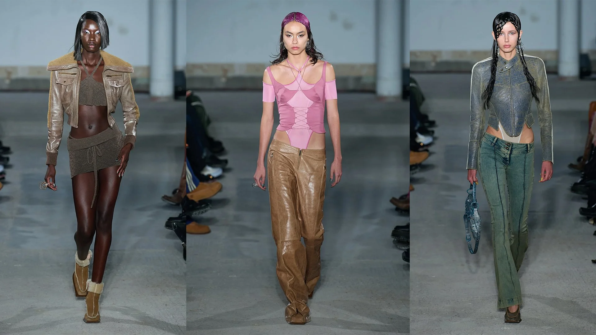 Tik Tok may have been a driving force in reigniting the Y2K trends for Gen-Z, but the South London design duo Charlotte Knowles and Alexander Arsenault behind KNWLS have just cemented the era’s staples with their own signature. Against a concrete backdrop and heavy techno beat, models donned sheer body suits and reworked suede corsetry. Earthy tones and acid washed denim were a constant throughout the collection as well as exposed waists skimmed only by the strap of a high-rise thong. The front row which included the Drag Race UK favourite, Bimini Bon Boulash and Vogue’s Julia Hobbs was reflective of the collection’s energy: bold and daring.
