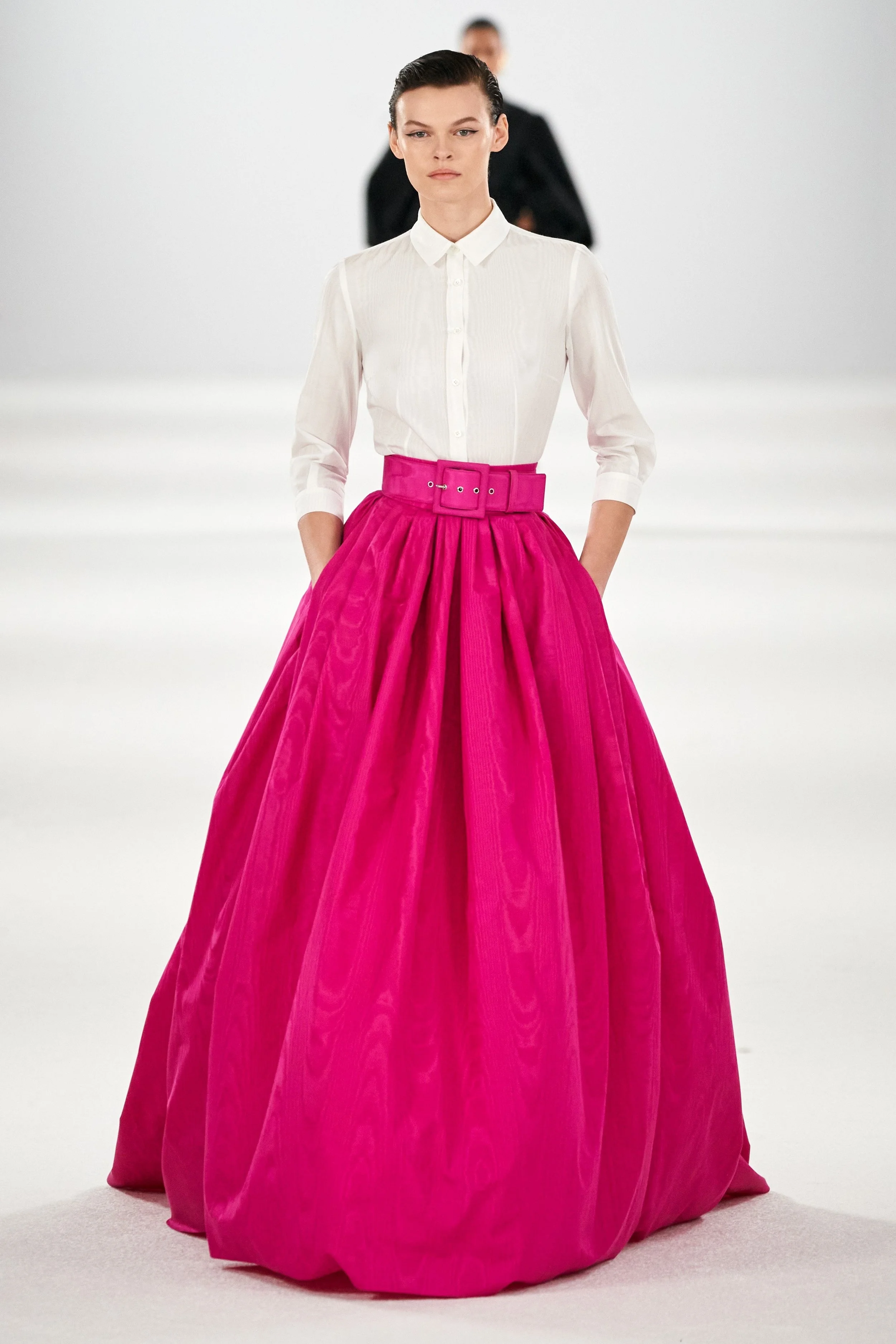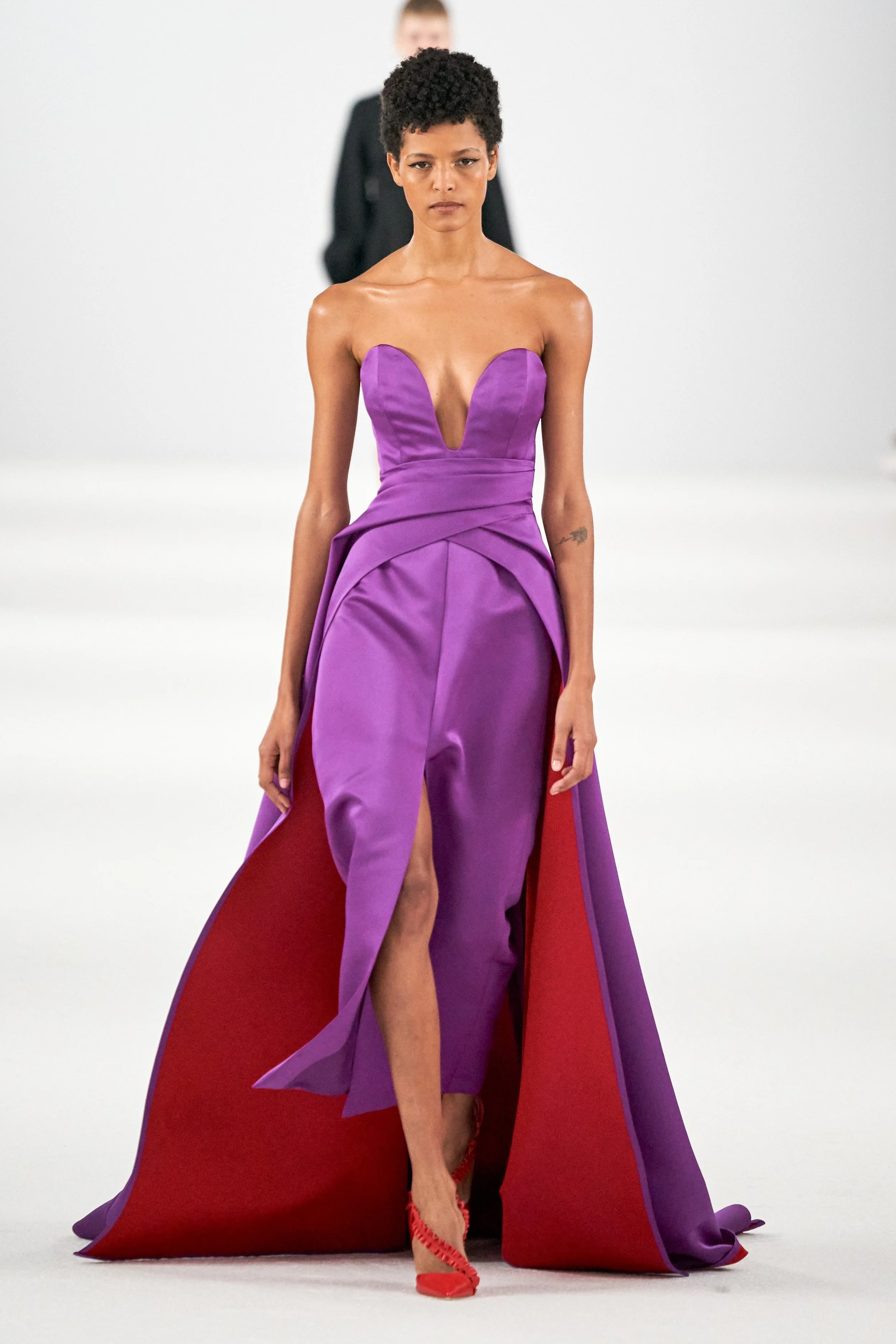 They settled in for a collection in which Gordon delivered the fire with mostly firm control, interrupted by occasional full-on flights of fancy. To display loyalty, he quickly showed two takes on a house signature, the hallowed white shirt: a big-sleeved beauty over skinny black pants and a trim, classic version paired to a fuchsia ball skirt. Those looks established a key element: judicious use of volume. Gordon invoked it deftly if not discreetly, sometimes as the main event, as in a demonstrative frothy ball gown, but more often as a pronounced detail on an otherwise silhouette – a billowing sleeve on a lean suit or giant pouf on a sleek cocktail dress. Where he didn’t hold back an iota: with color, which came in vibrant marigold looks as well as euphoric combinations, particularly multiple shades of reds, pinks and purples.