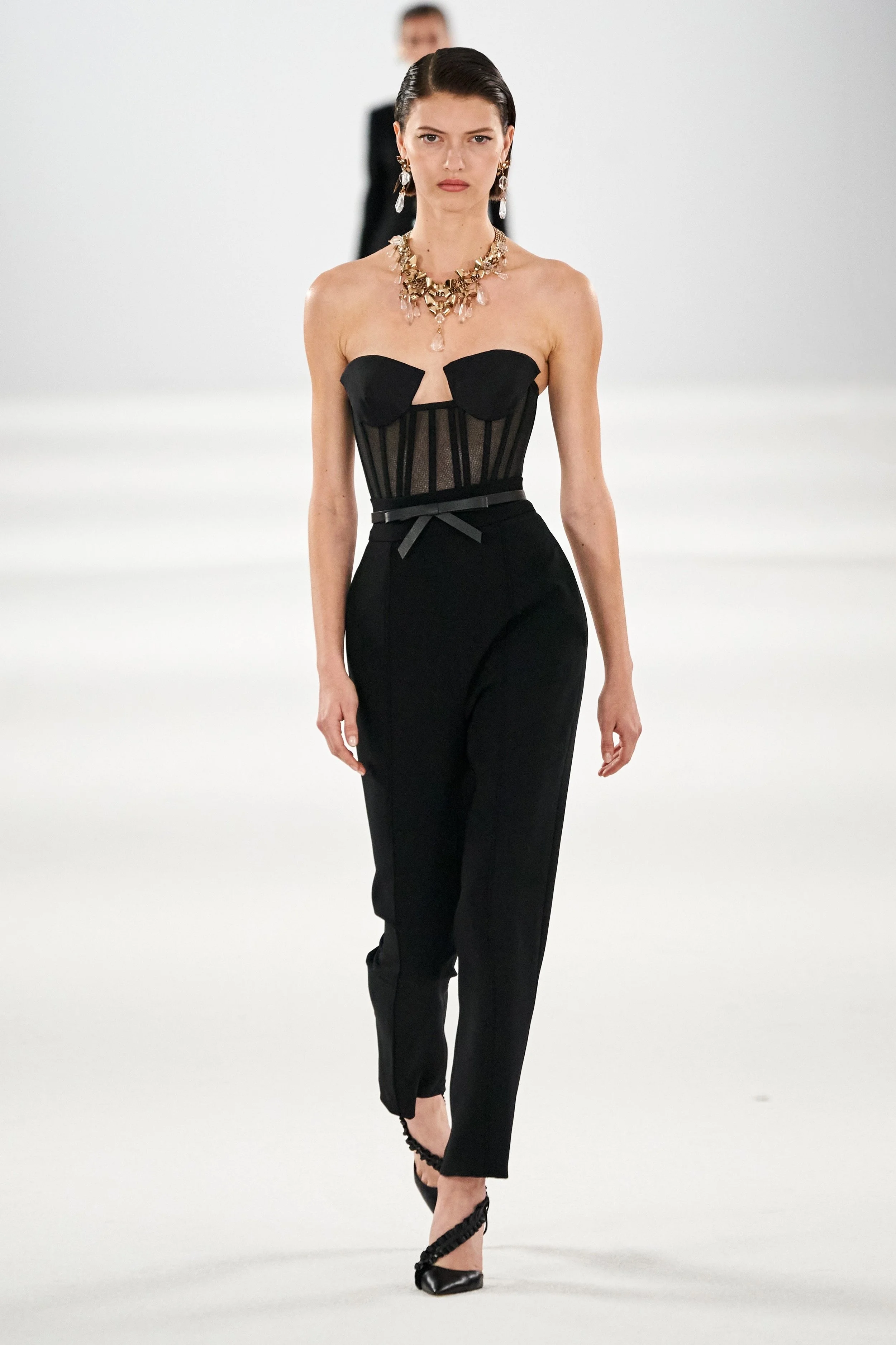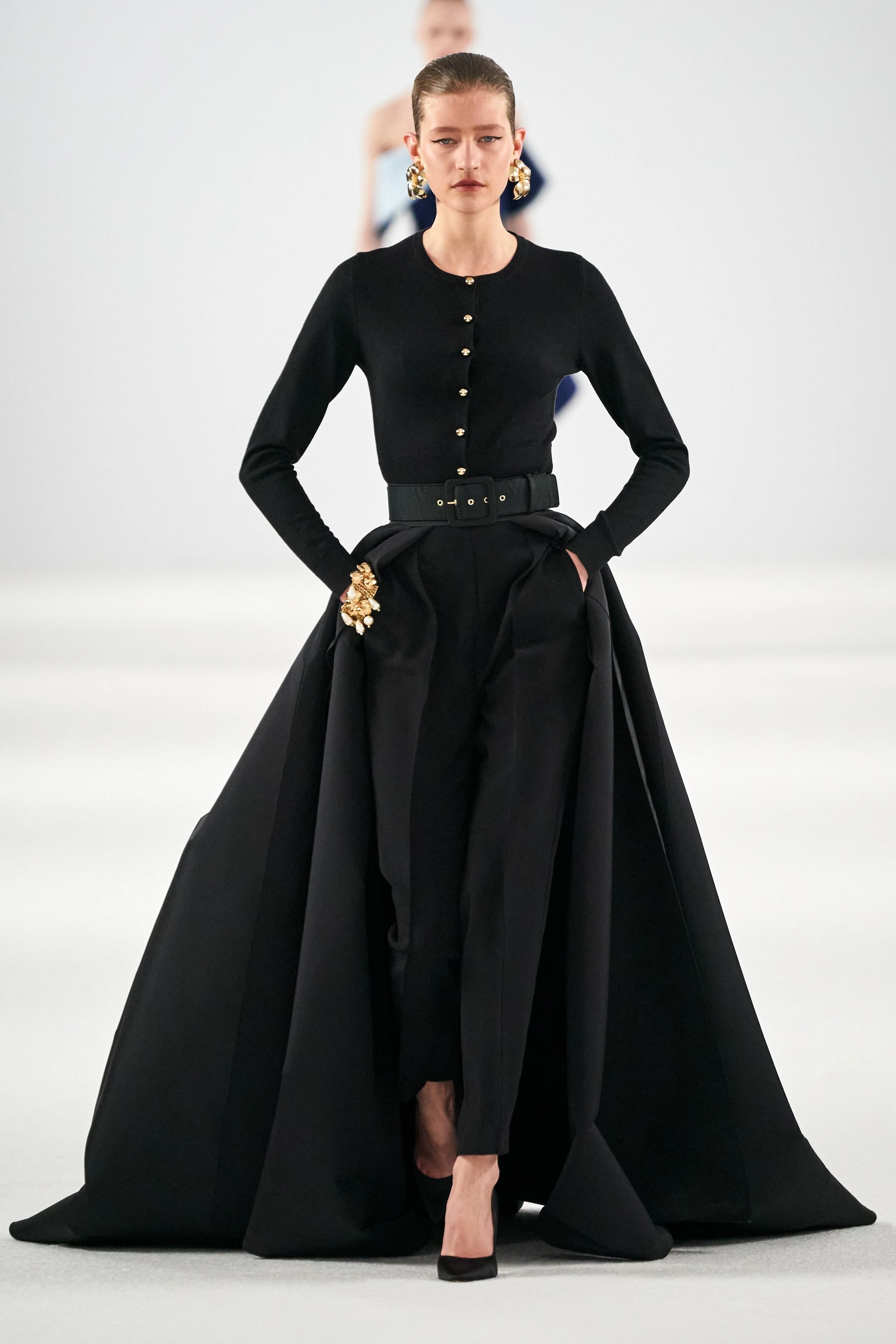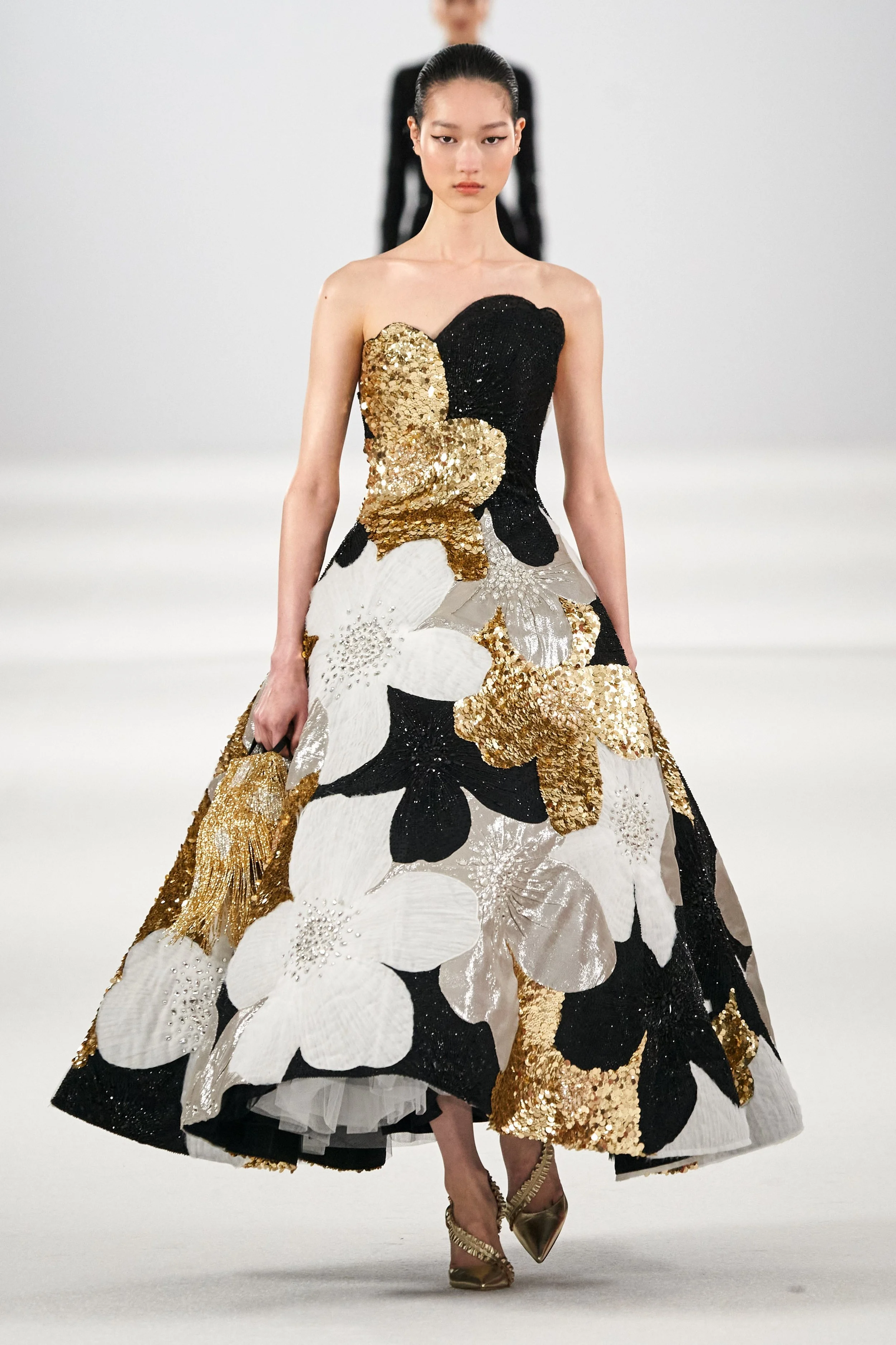 Either way, these are clothes for women loved getting dressed. They’re ready to shed the shackles of COVID hell and get decked out and out of the house. Read: nothing casual here. For that matter, there were few day clothes at all, though one can argue for the versatility of little tweed lovelies done up with elaborate jeweled trim. Other looks weren’t versatile at all. For big events only (perhaps, for example, one major soiree upcoming on March 27th in Los Angeles), the ballgown in a montage of giant black, white and gold flowers – a dream.