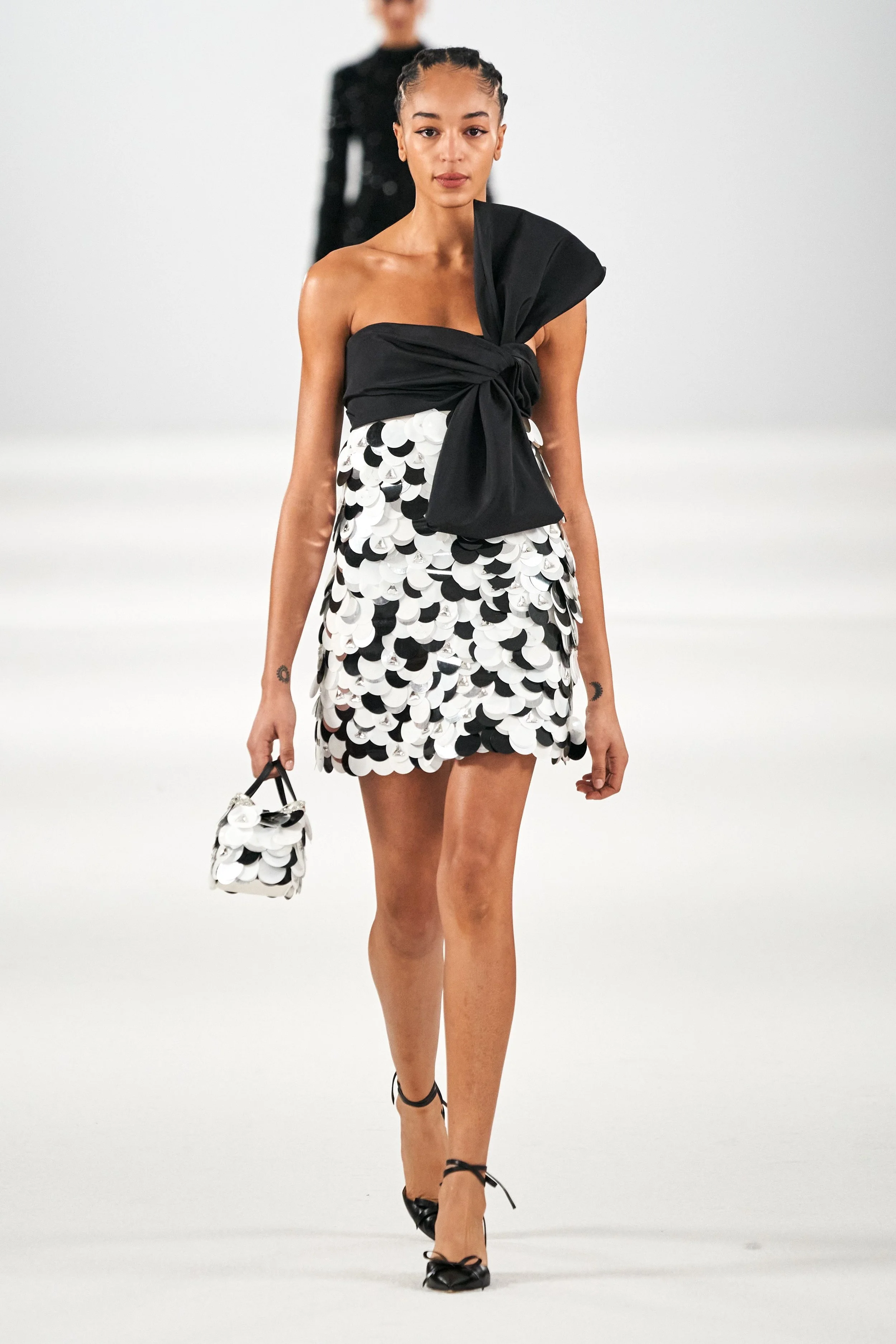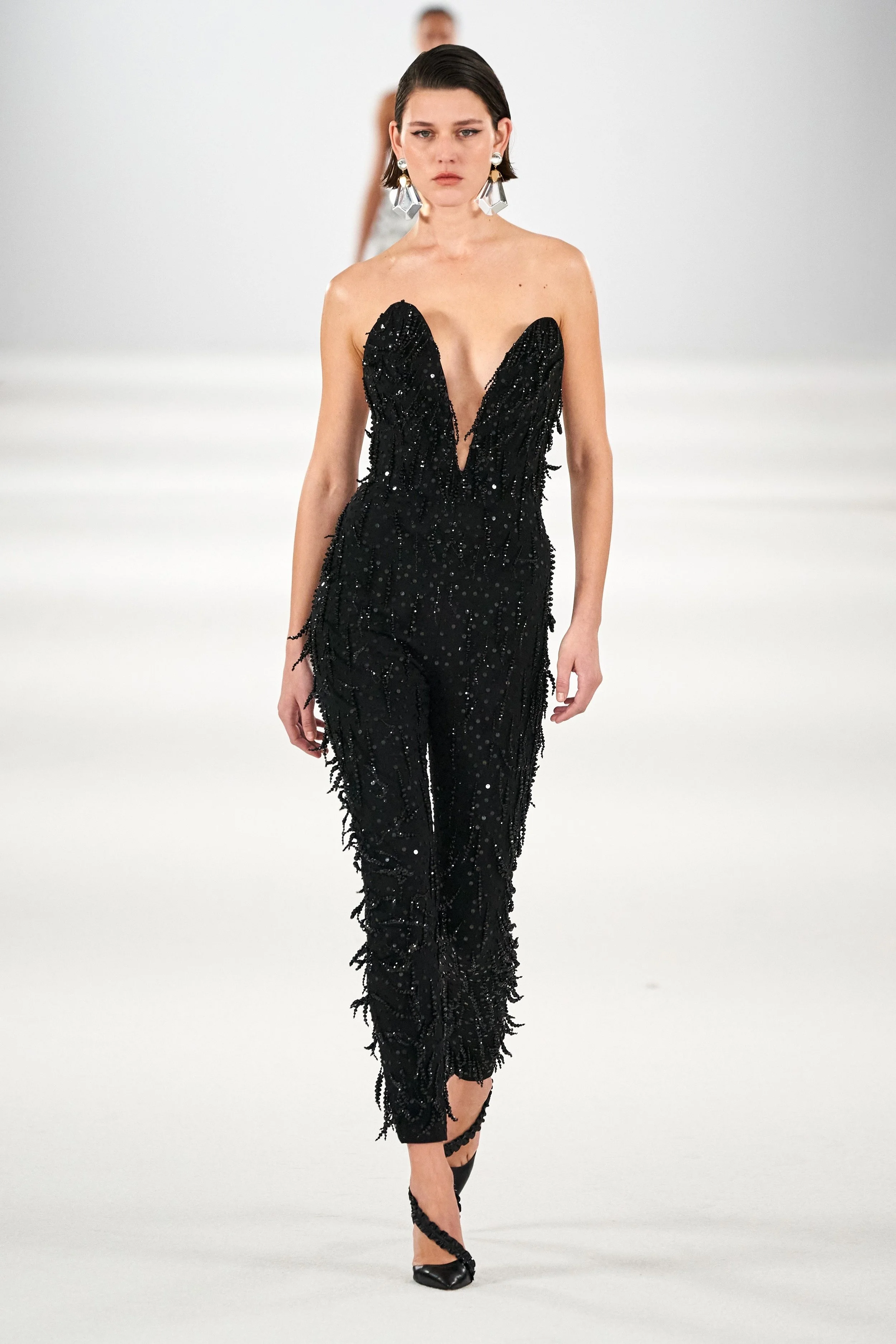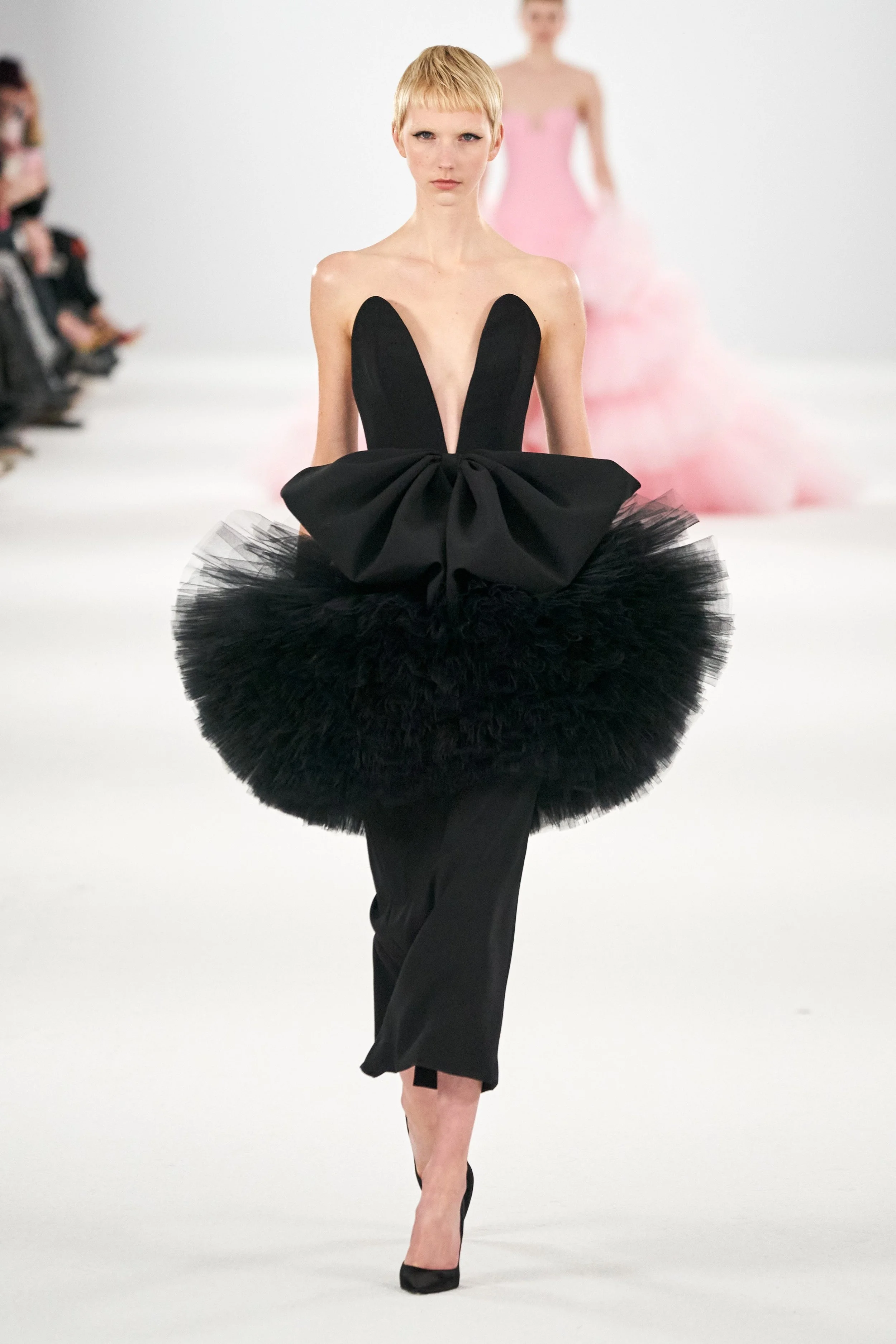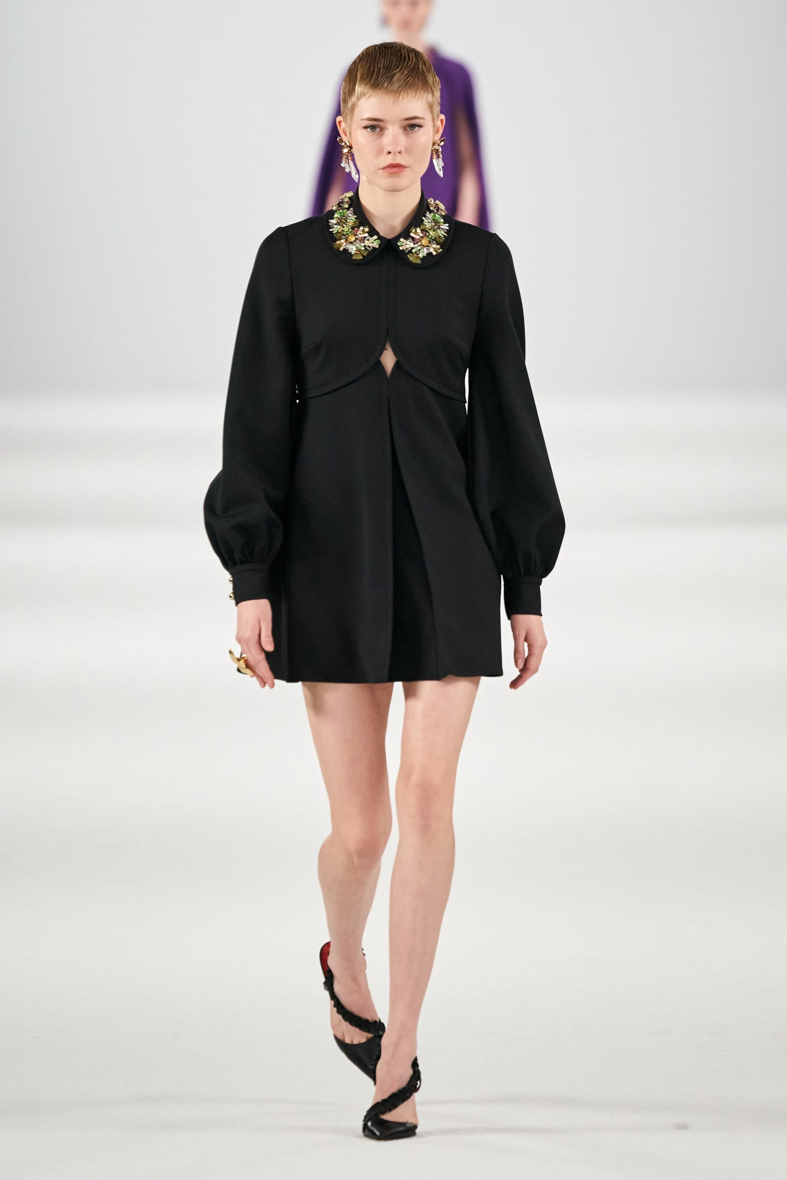 Either way, these are clothes for women loved getting dressed. They’re ready to shed the shackles of COVID hell and get decked out and out of the house. Read: nothing casual here. For that matter, there were few day clothes at all, though one can argue for the versatility of little tweed lovelies done up with elaborate jeweled trim. Other looks weren’t versatile at all. For big events only (perhaps, for example, one major soiree upcoming on March 27th in Los Angeles), the ballgown in a montage of giant black, white and gold flowers – a dream.