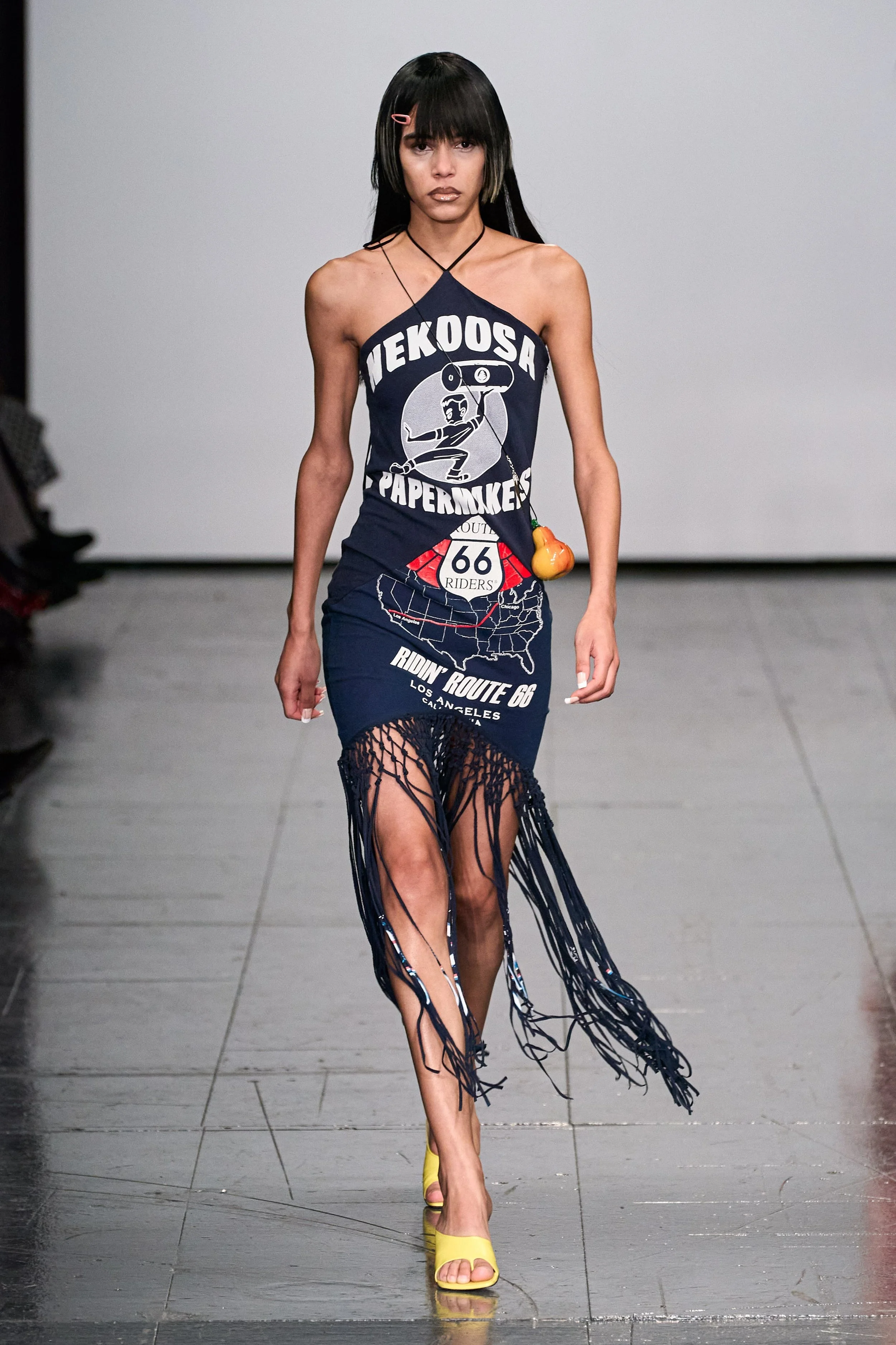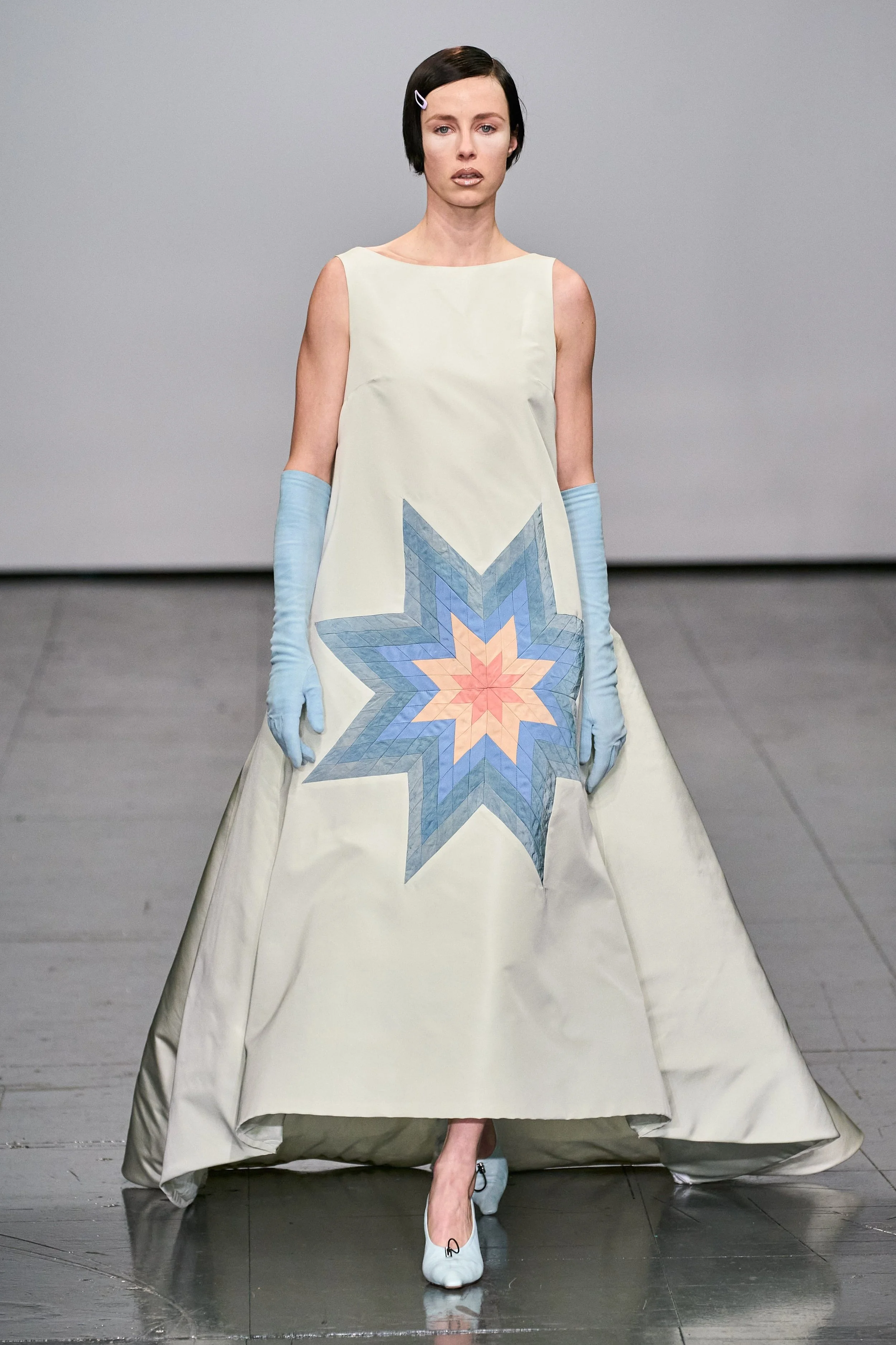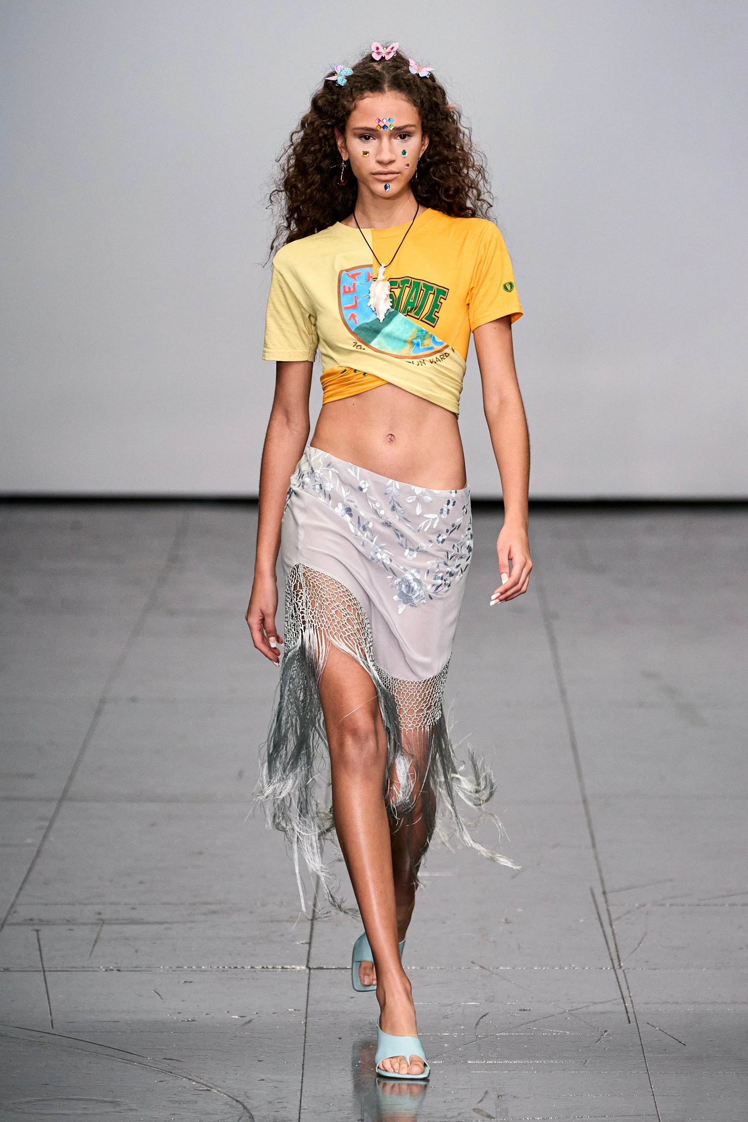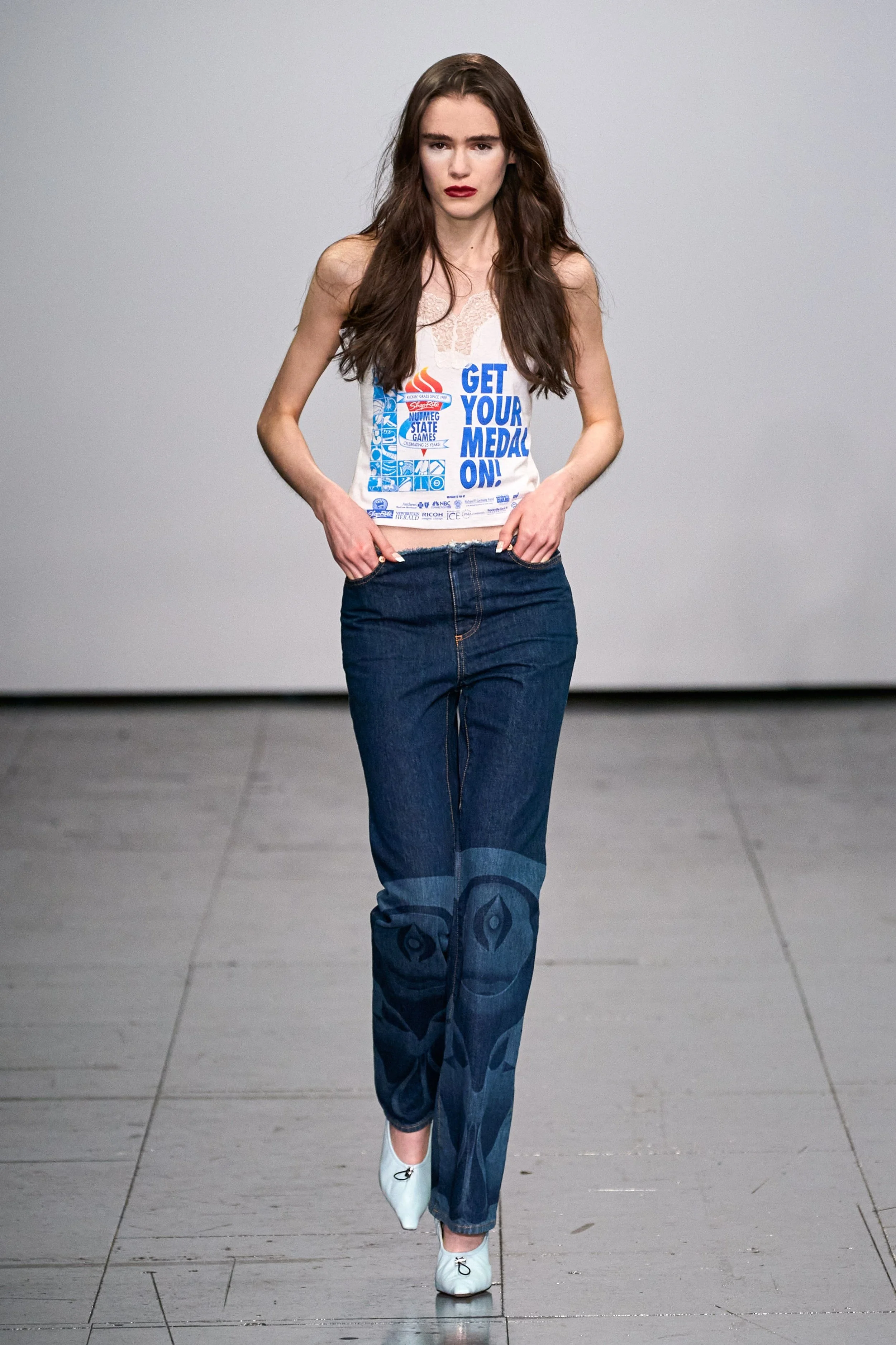 Showing on Friday, each look defined a powerful archetype, fueled by his American roots. There was The Career Girl, a portrayal of Anne Hathaway’s role of Andy Sachs in The Devil Wears Prada, representing the layers of confidence through reconstructed Polish Military blankets. Then there was The America’s Next Top Model Girl mirroring the models’ uniforms - a bootcut jean, white camisole and stilettos, worn throughout the iconic Tyra Banks show. The technique behind each look is deeply unique to his way of creating, which is utilising deadstock, upcycling as much as possible, whilst crafting silhouettes that are exceedingly fun to wear. As each model strolled down the runway, a layered sense of the American Girl and its TV/cinema portrayal, moulded and sculpted through media, and embraced by all of us in the 21st century.