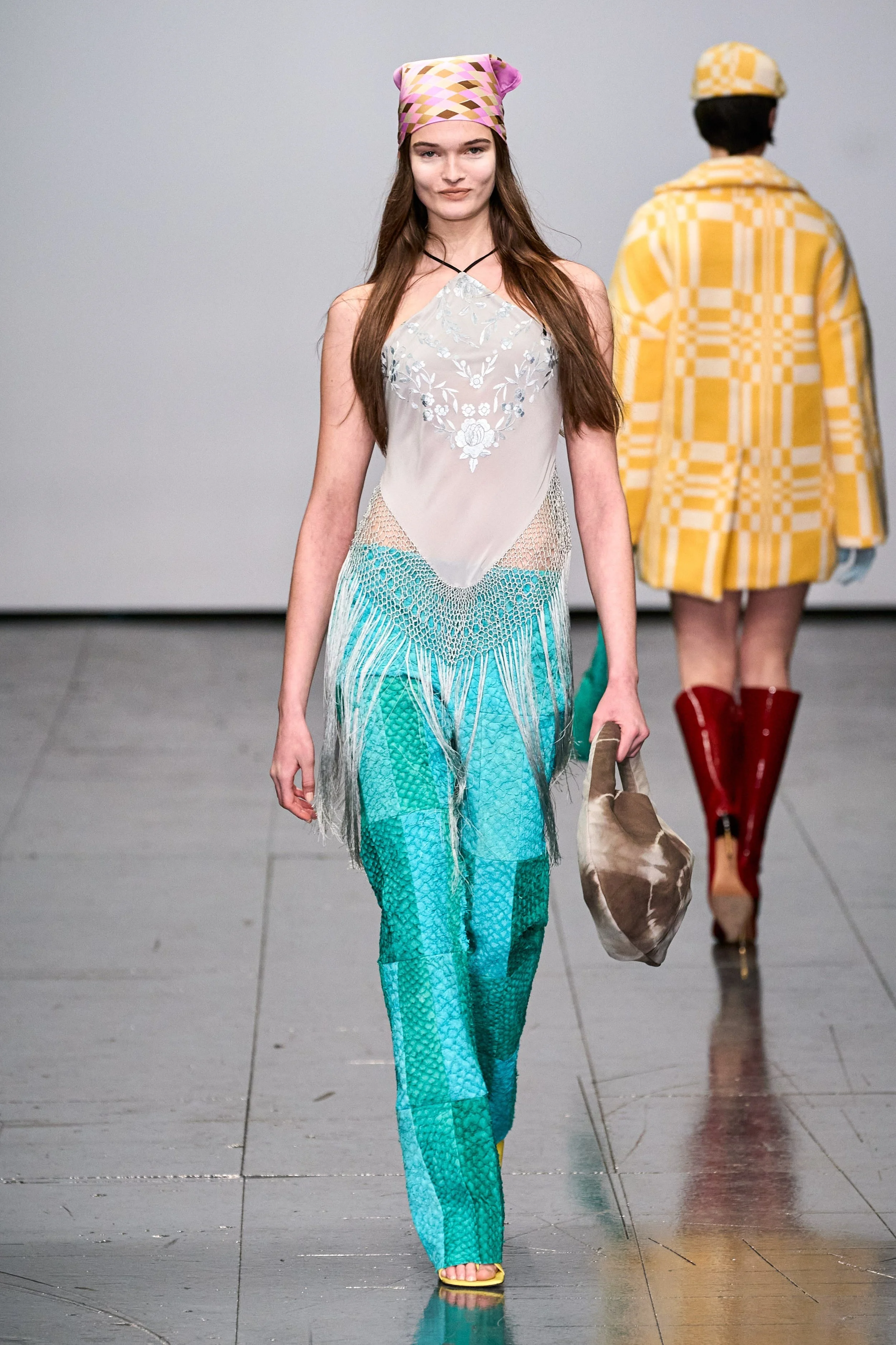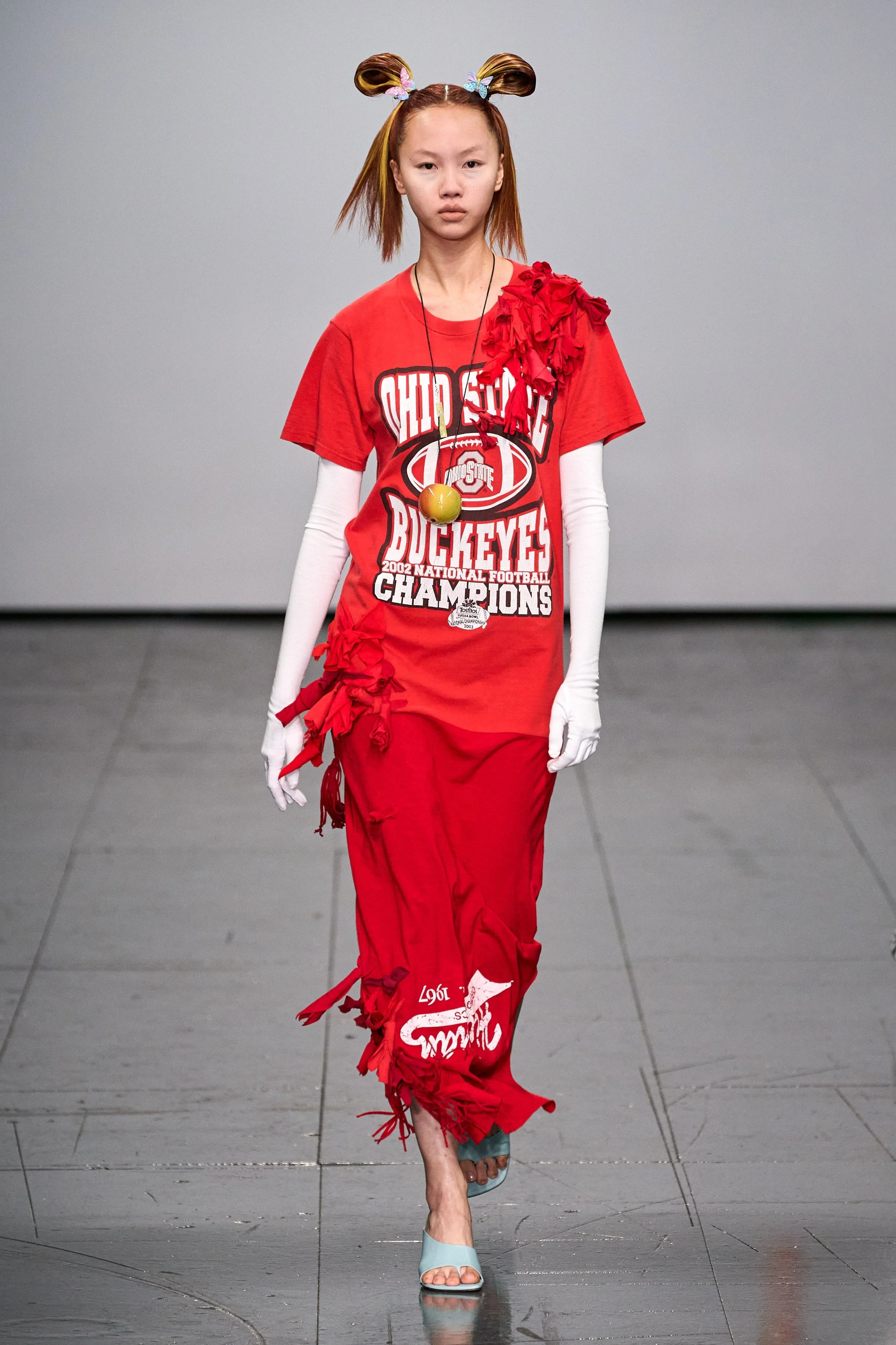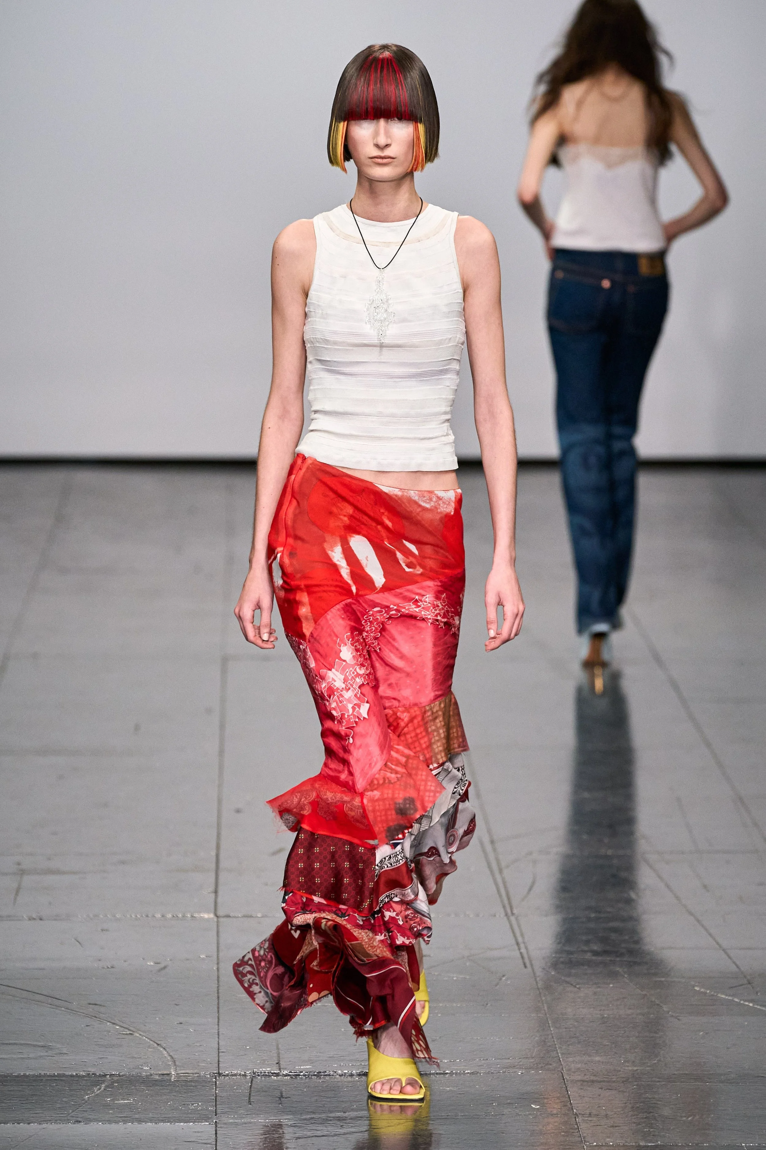 Showing on Friday, each look defined a powerful archetype, fueled by his American roots. There was The Career Girl, a portrayal of Anne Hathaway’s role of Andy Sachs in The Devil Wears Prada, representing the layers of confidence through reconstructed Polish Military blankets. Then there was The America’s Next Top Model Girl mirroring the models’ uniforms - a bootcut jean, white camisole and stilettos, worn throughout the iconic Tyra Banks show. The technique behind each look is deeply unique to his way of creating, which is utilising deadstock, upcycling as much as possible, whilst crafting silhouettes that are exceedingly fun to wear. As each model strolled down the runway, a layered sense of the American Girl and its TV/cinema portrayal, moulded and sculpted through media, and embraced by all of us in the 21st century.