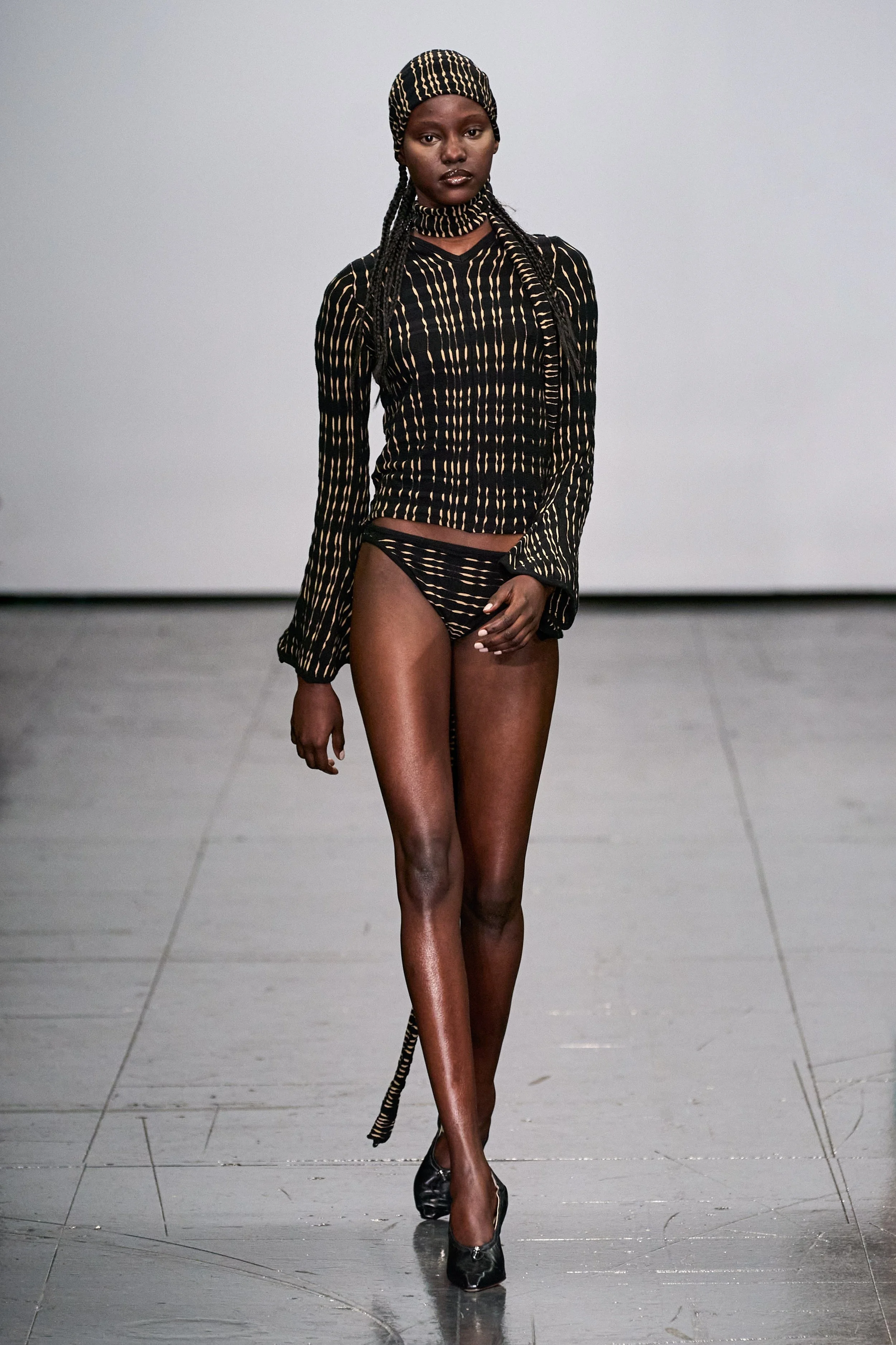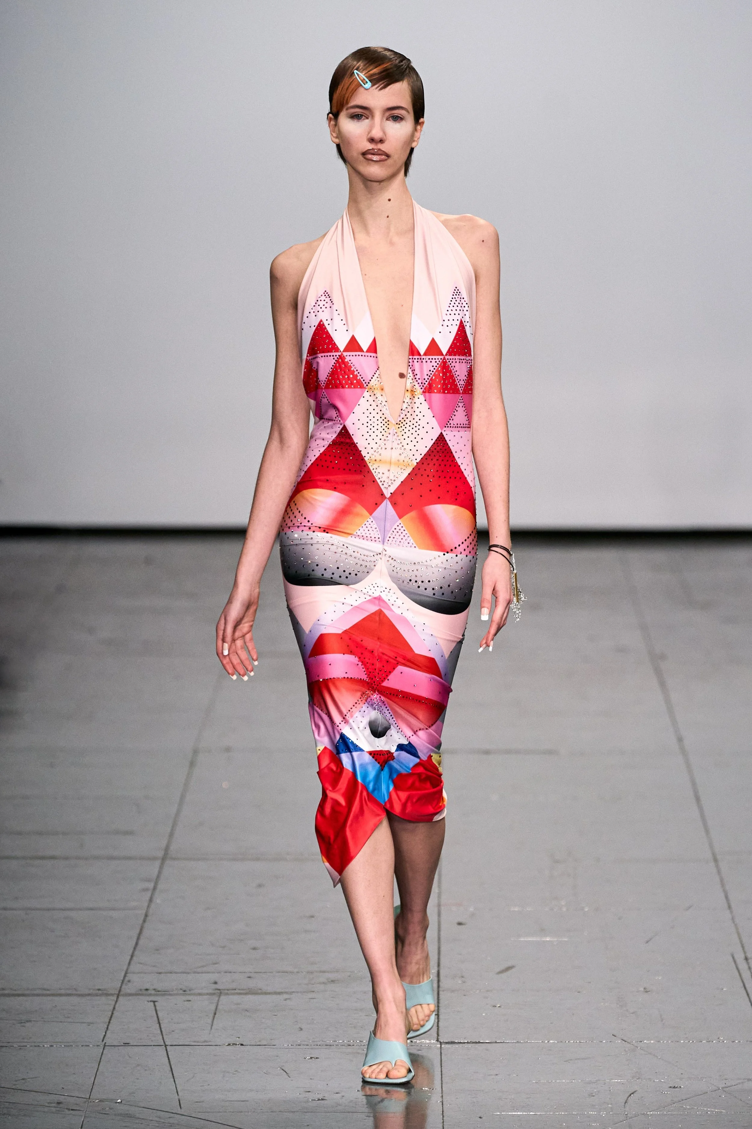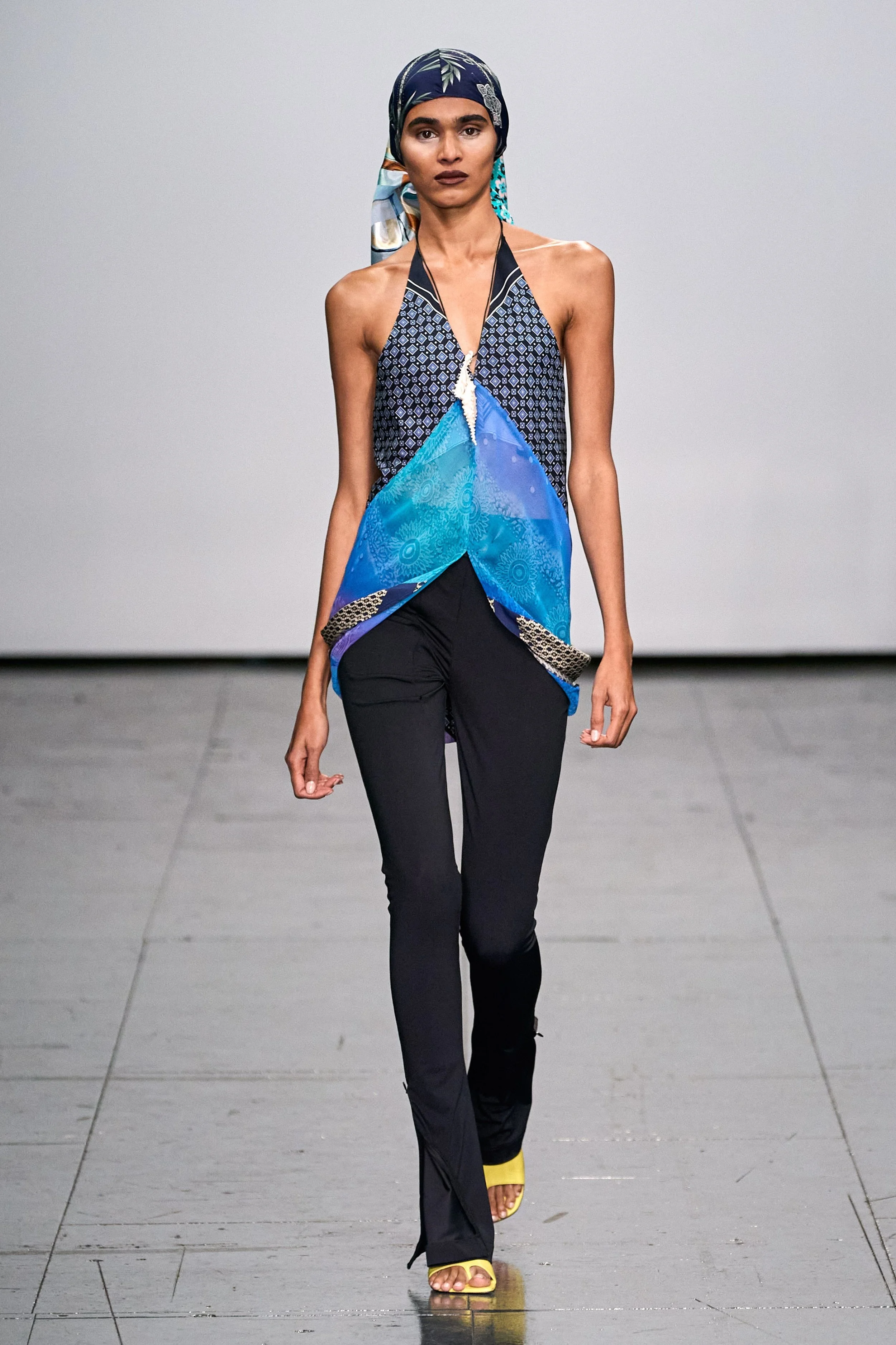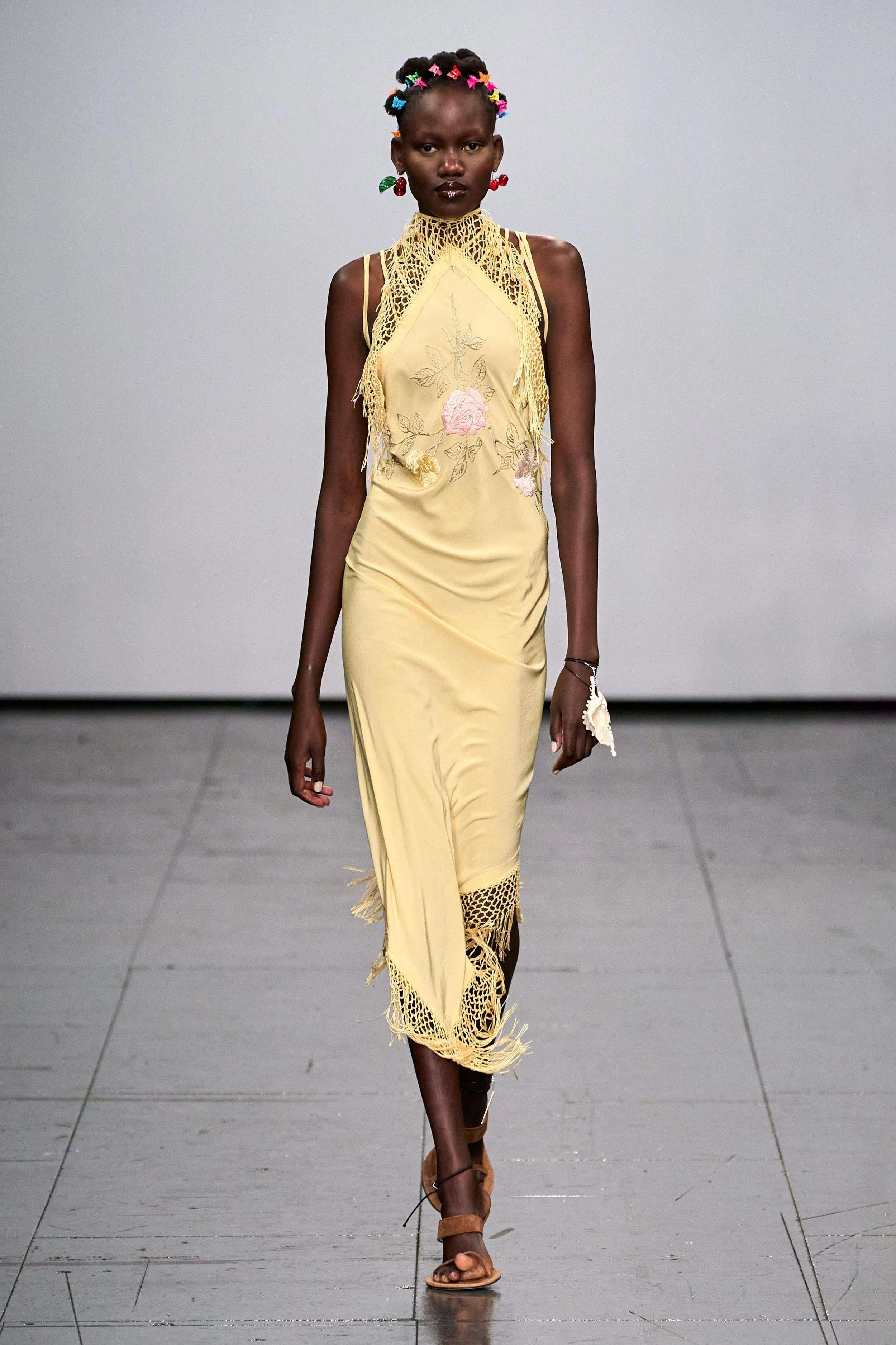 Showing on Friday, each look defined a powerful archetype, fueled by his American roots. There was The Career Girl, a portrayal of Anne Hathaway’s role of Andy Sachs in The Devil Wears Prada, representing the layers of confidence through reconstructed Polish Military blankets. Then there was The America’s Next Top Model Girl mirroring the models’ uniforms - a bootcut jean, white camisole and stilettos, worn throughout the iconic Tyra Banks show. The technique behind each look is deeply unique to his way of creating, which is utilising deadstock, upcycling as much as possible, whilst crafting silhouettes that are exceedingly fun to wear. As each model strolled down the runway, a layered sense of the American Girl and its TV/cinema portrayal, moulded and sculpted through media, and embraced by all of us in the 21st century.