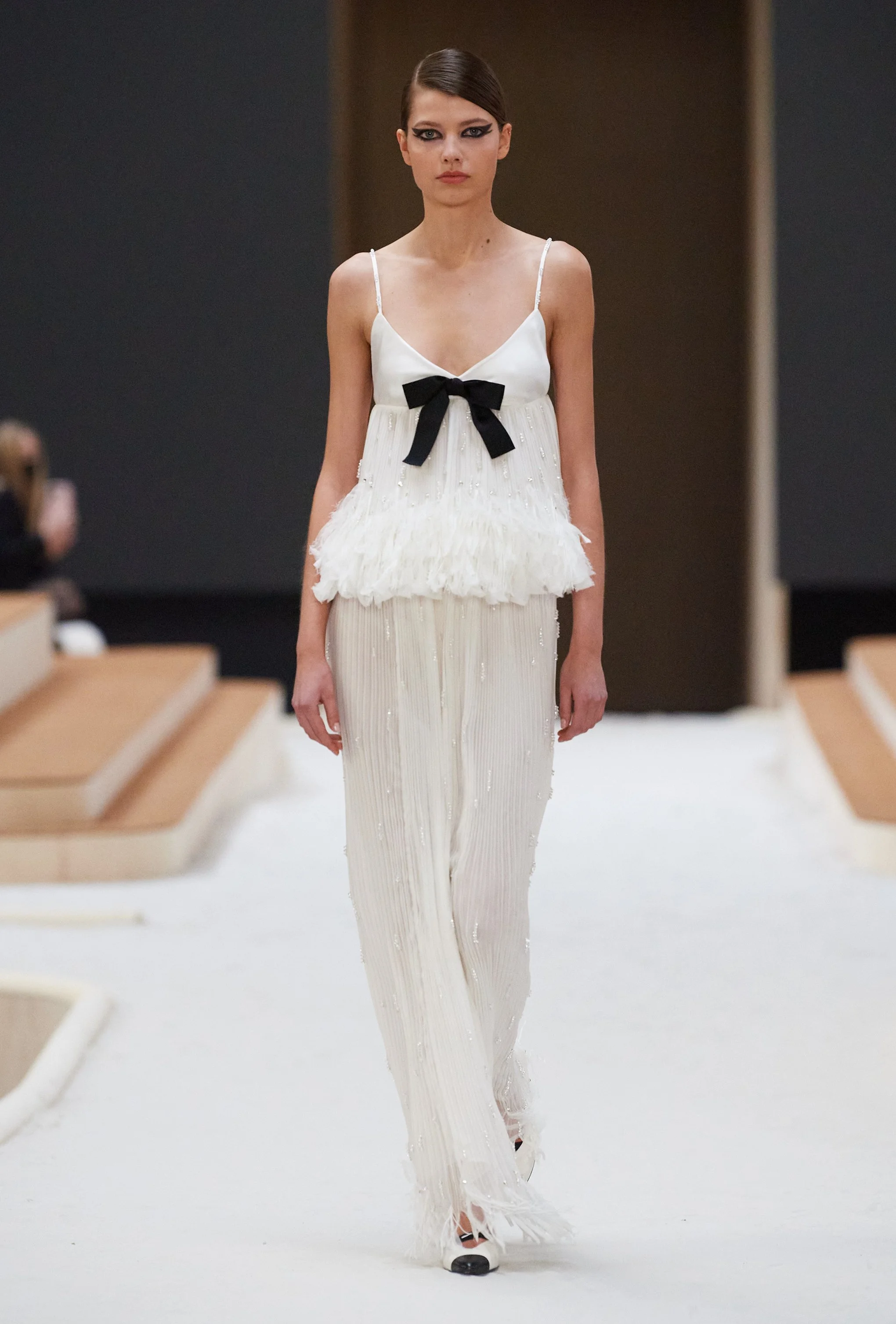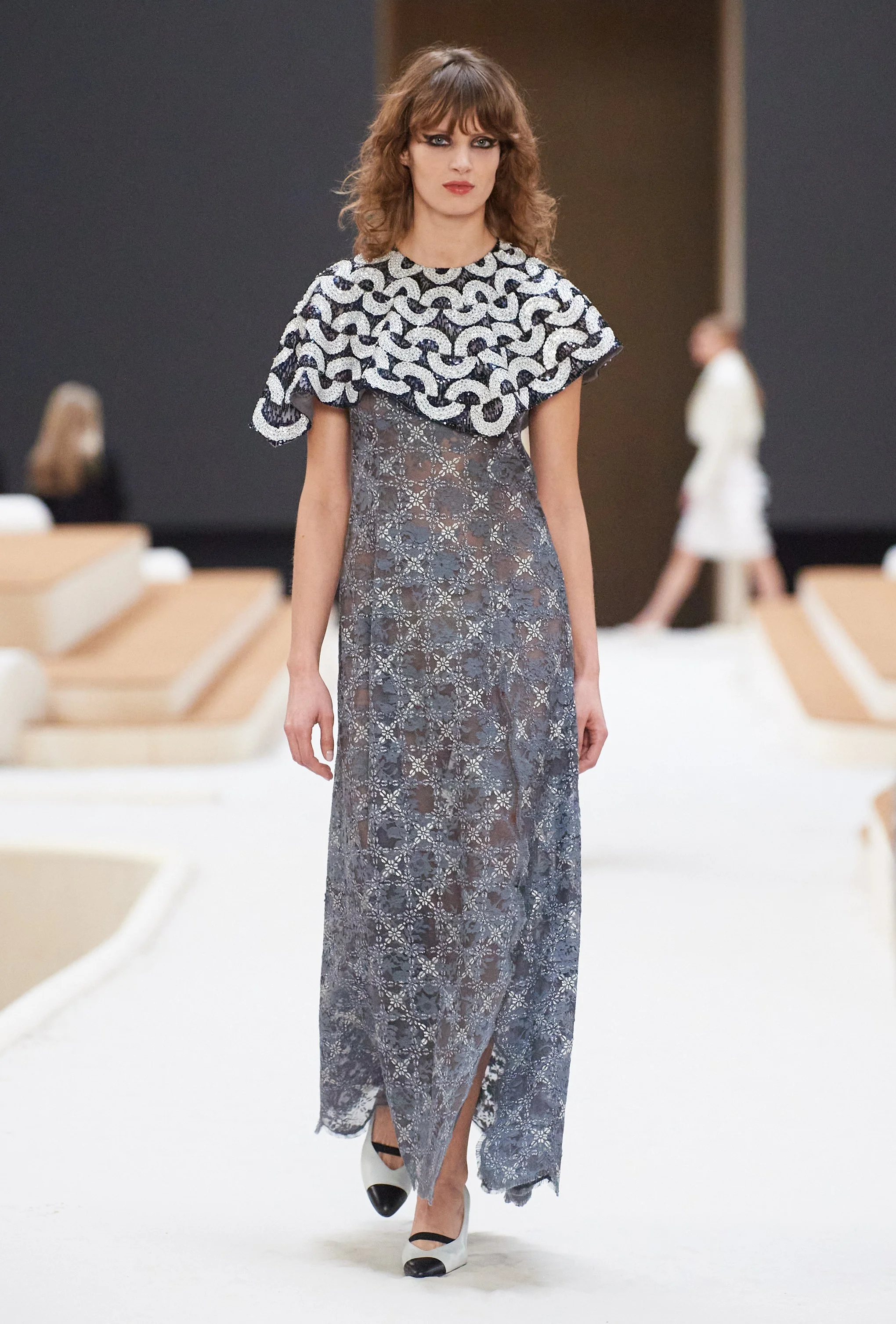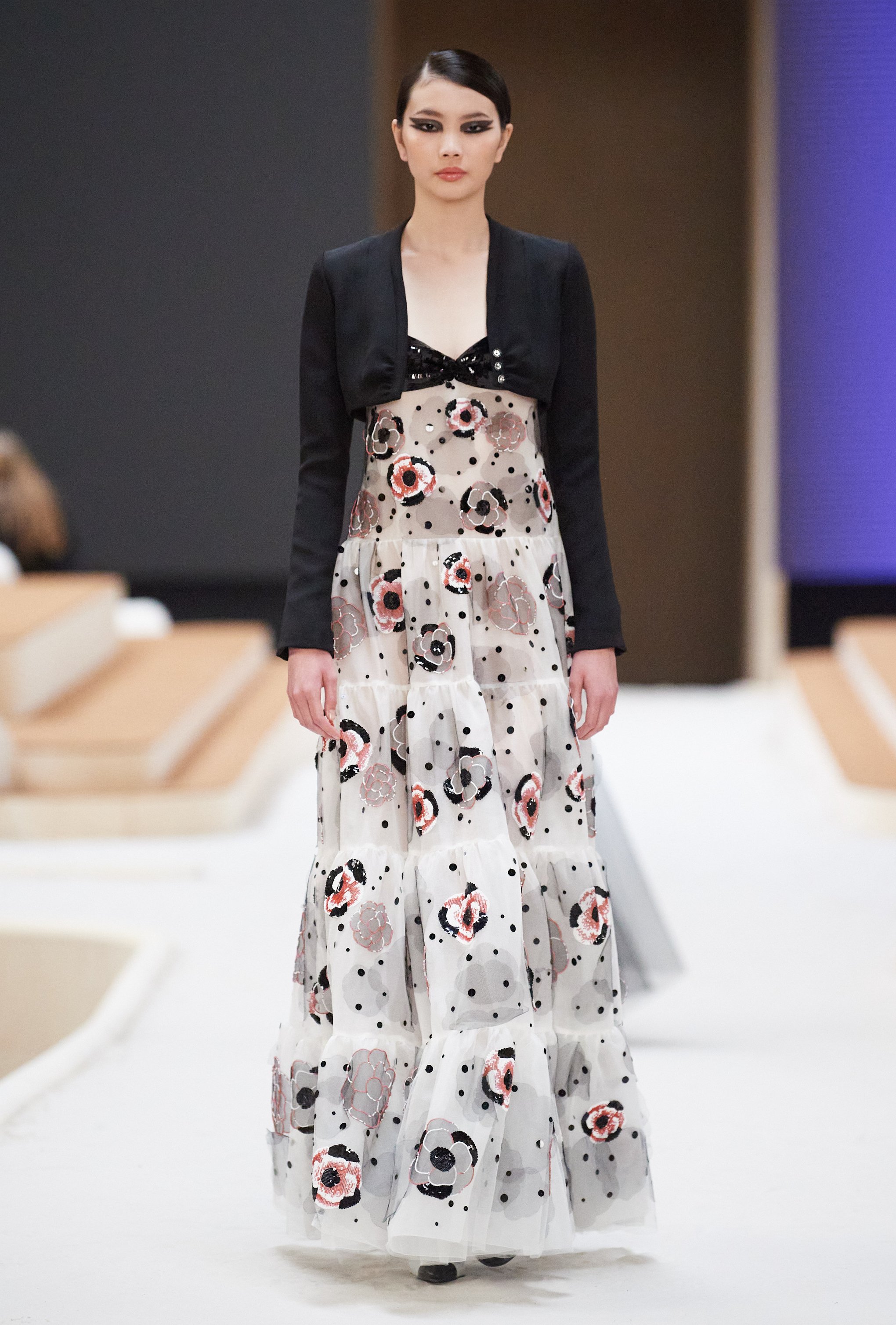 Charlotte Casiraghi opened the show on horseback, bringing a fresh reiteration on the classic Chanel tweed jacket with a black embroidered sequin version of it. Viard put emphasis on the shape and curve of the top half of the body with exquisitely constructed hourglass jackets with attention to the lapels, some of them beaded, others crystallised, bringing a sense of understated feminine sensuality with its light enclosures. Reimagined Mary Janes from the 1920s and 1980s were given a new approach in the classic two-tone cream and black Chanel combination. Towards the end, the collection became more and more compelling where sharp slits in white chiffon and silk on the lower half of the body met meticulously electric beaded sequins and embroidered intricate camellias and daisies.