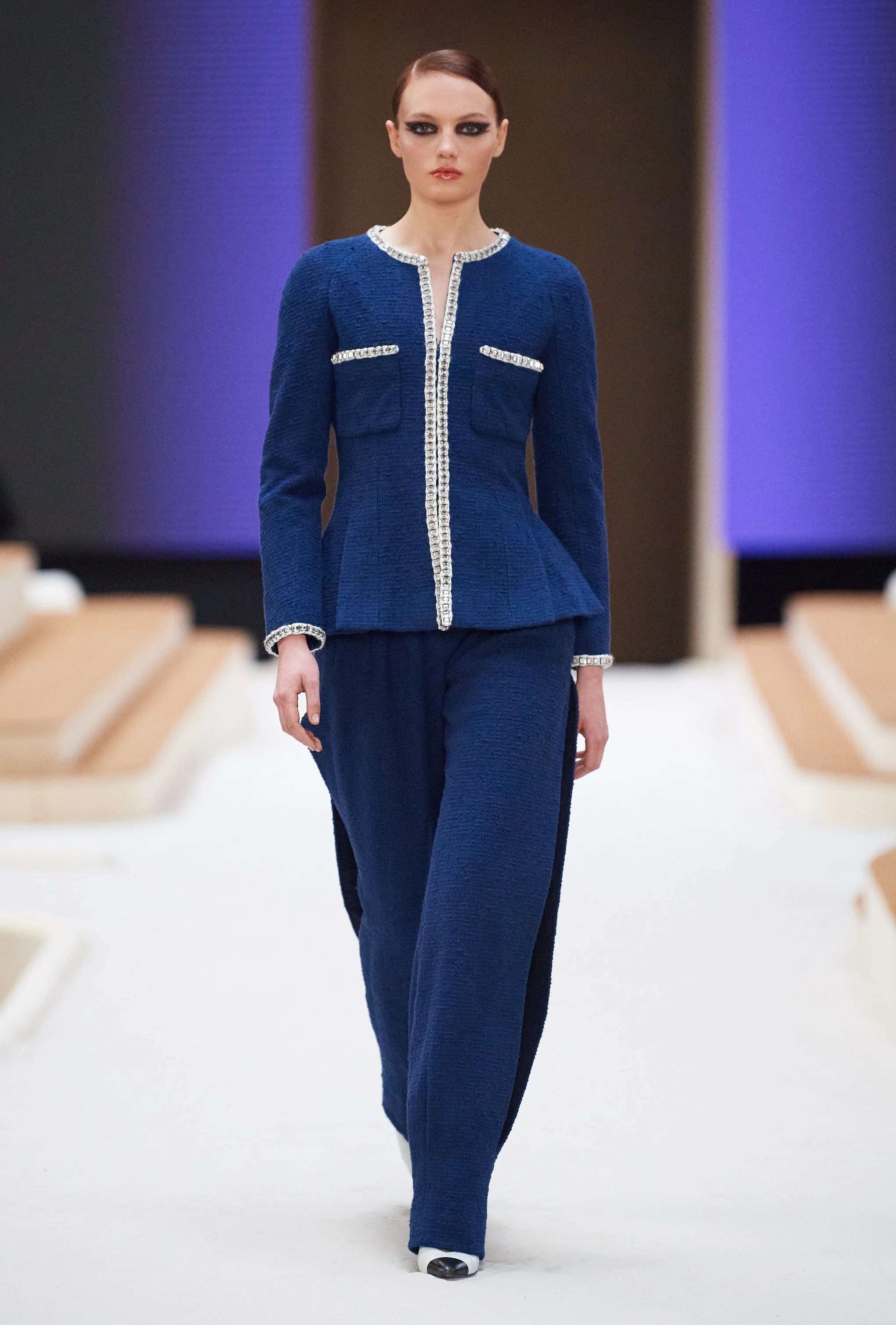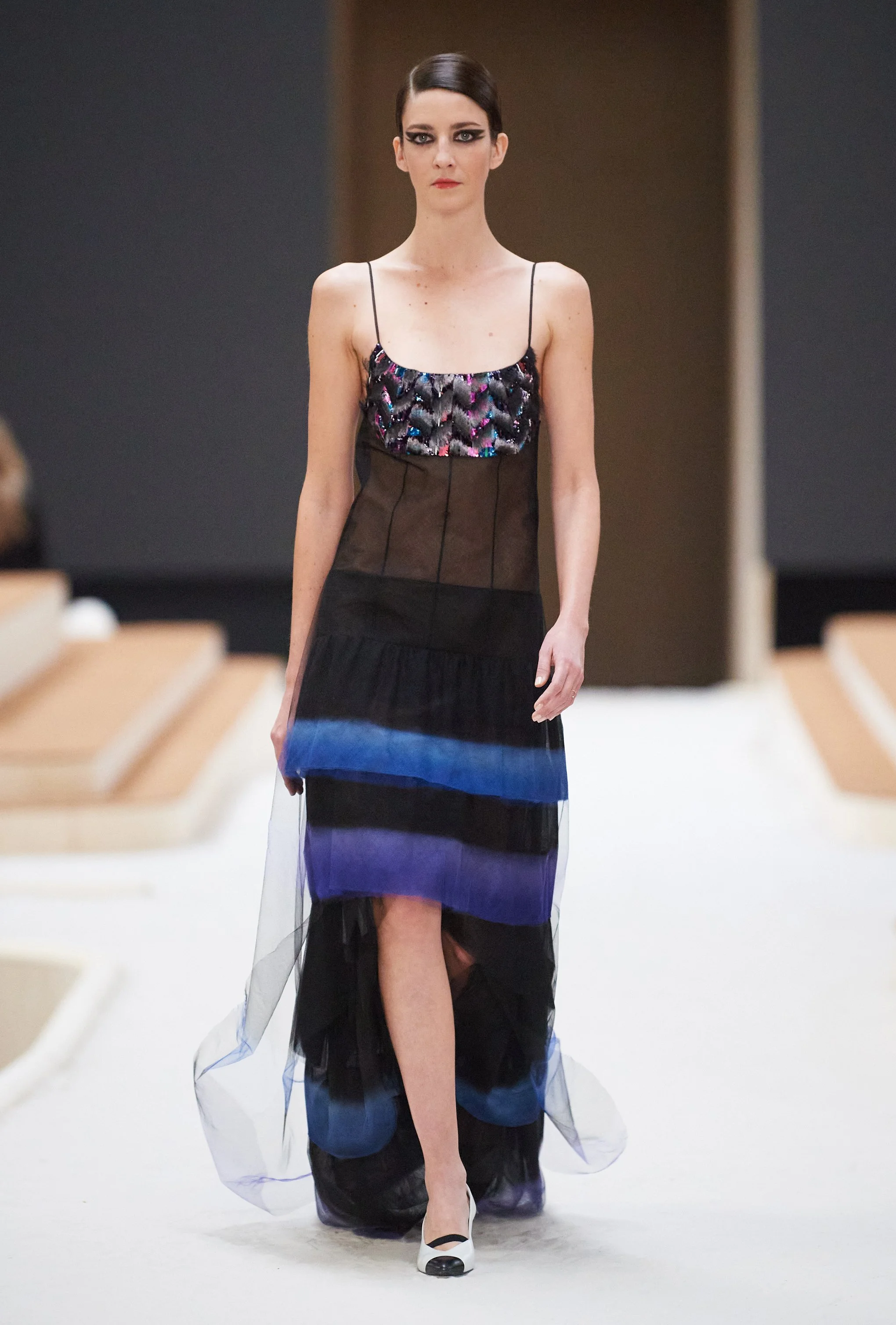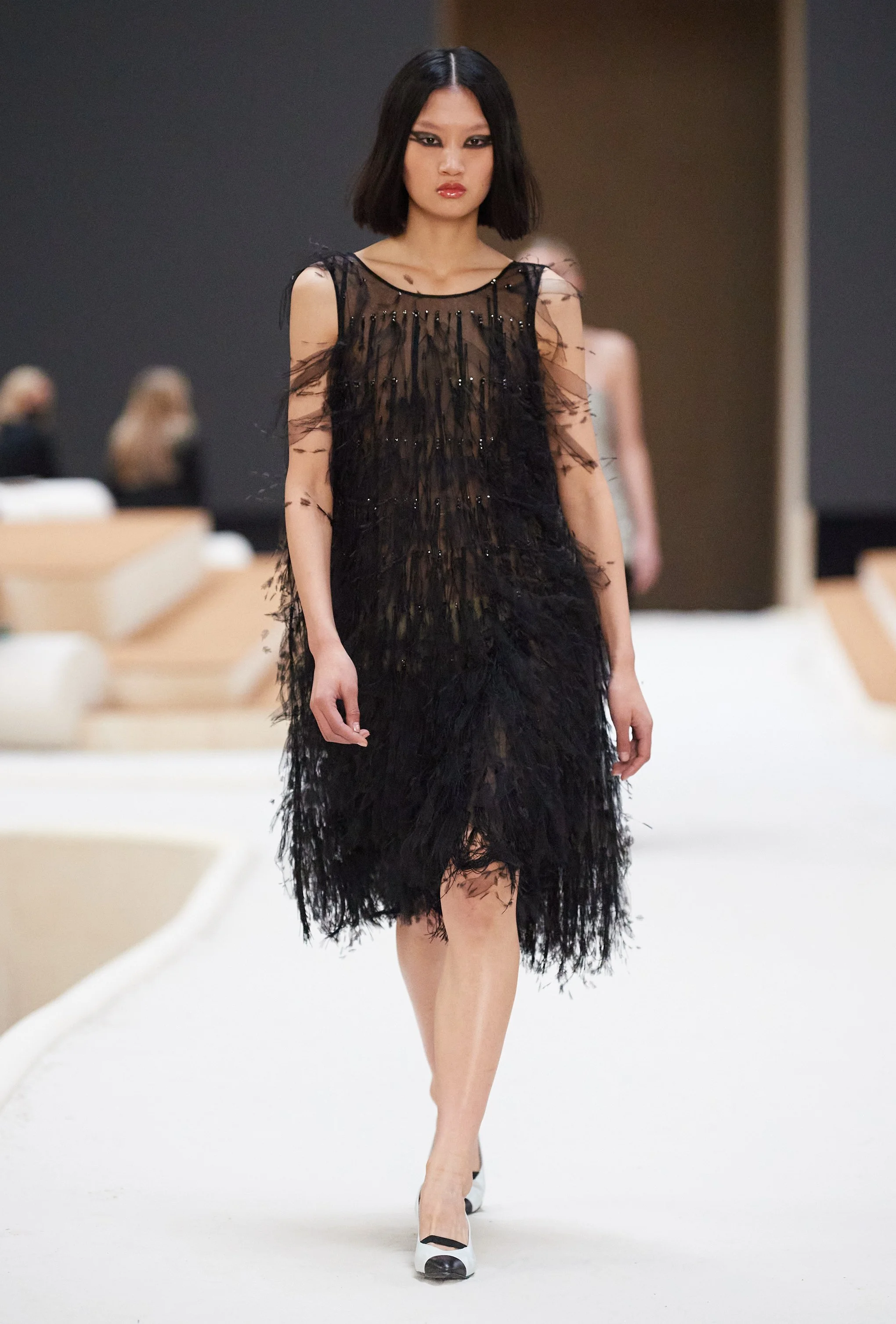 Charlotte Casiraghi opened the show on horseback, bringing a fresh reiteration on the classic Chanel tweed jacket with a black embroidered sequin version of it. Viard put emphasis on the shape and curve of the top half of the body with exquisitely constructed hourglass jackets with attention to the lapels, some of them beaded, others crystallised, bringing a sense of understated feminine sensuality with its light enclosures. Reimagined Mary Janes from the 1920s and 1980s were given a new approach in the classic two-tone cream and black Chanel combination. Towards the end, the collection became more and more compelling where sharp slits in white chiffon and silk on the lower half of the body met meticulously electric beaded sequins and embroidered intricate camellias and daisies.