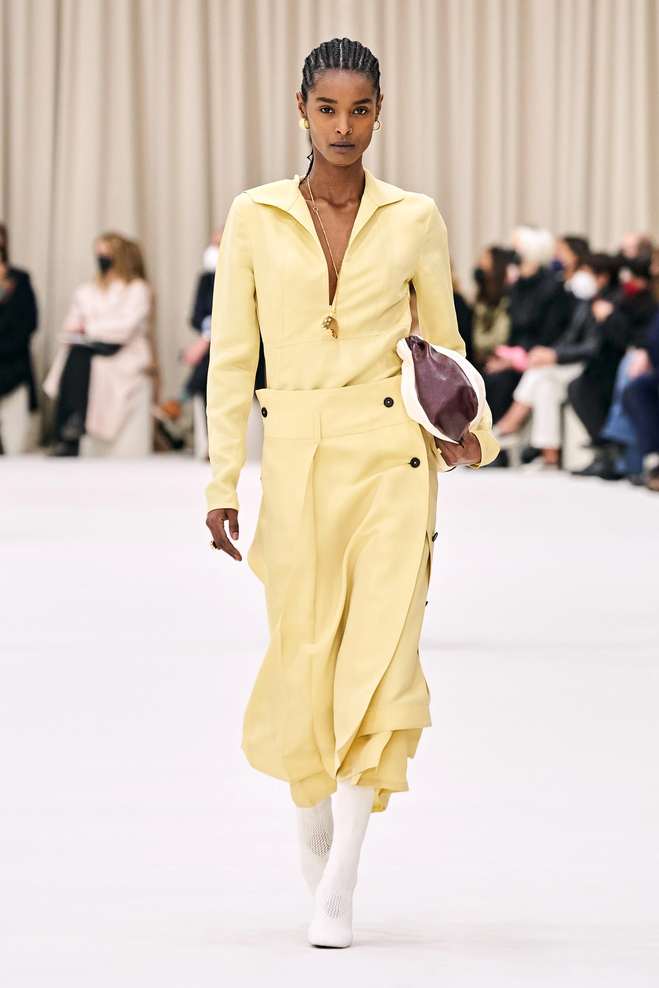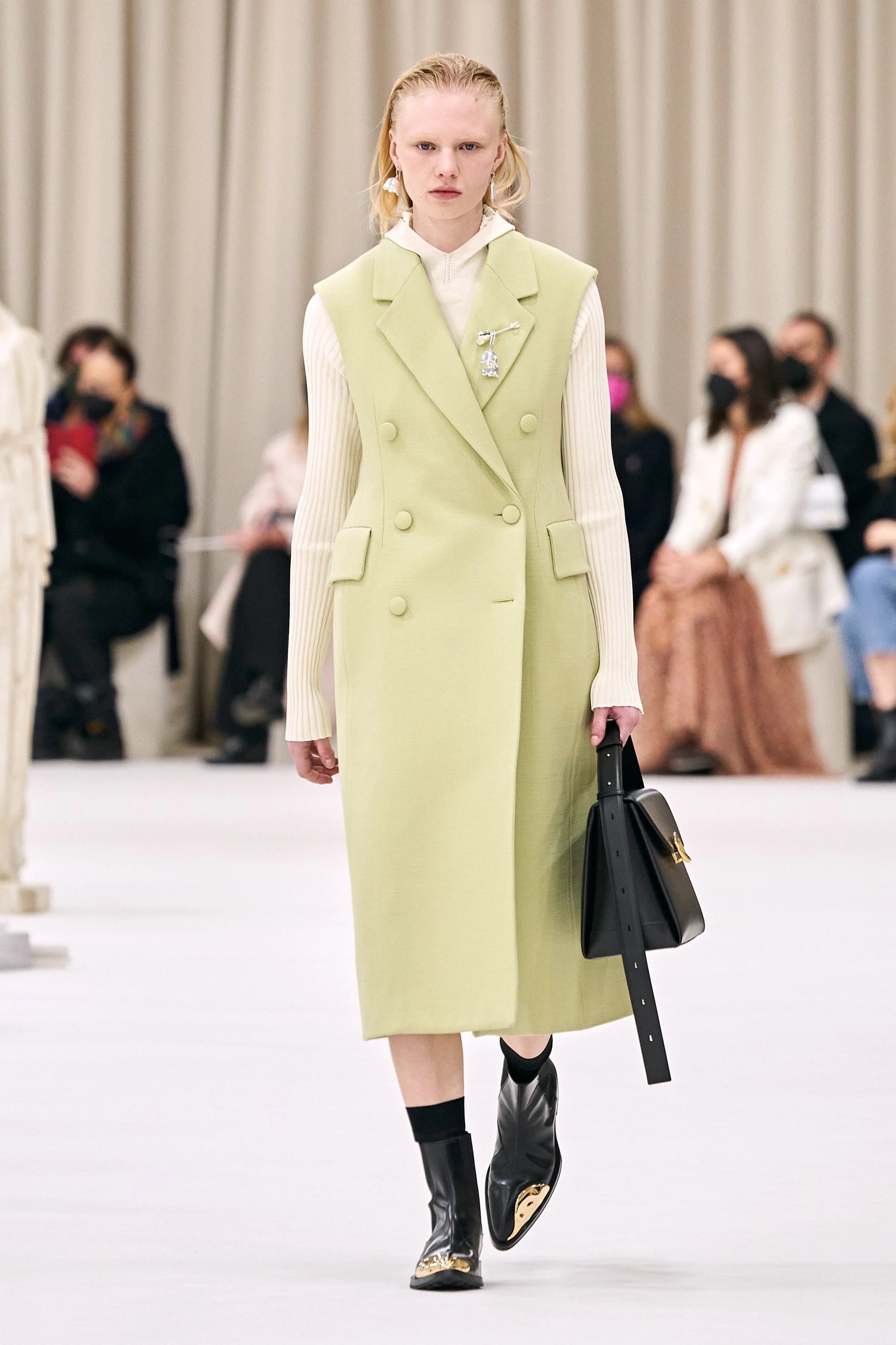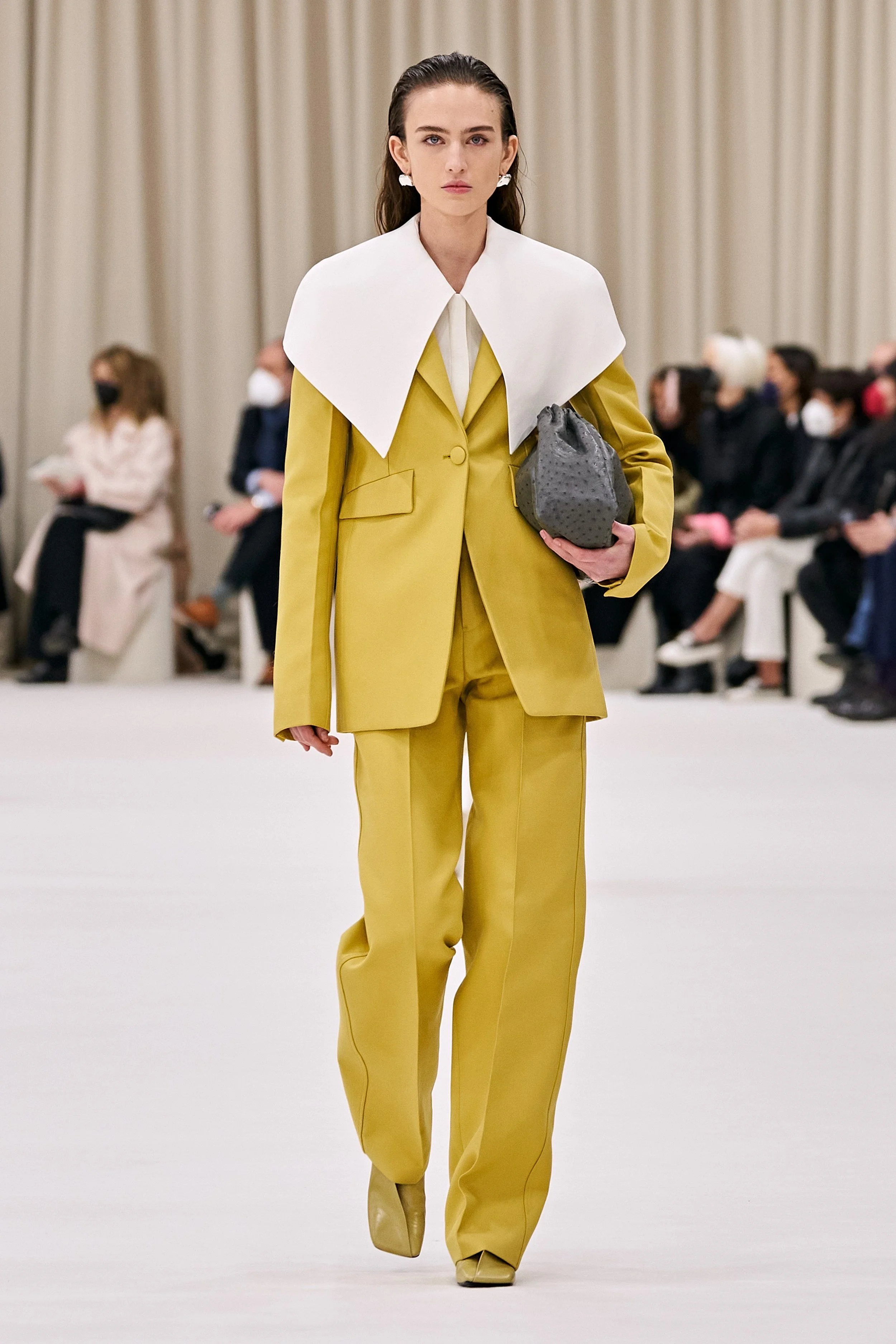 Such can be seen through the creamy white opening look that showcased an oversized tailored hourglass wool suit jacket matched with a wool short skirt in a brilliant mix of high-low shaping that exaggerates outward. Staged across the collection in fresh pastels alongside signature Jil Sander black and grey, the collection revolved onto the exaggeration of the top part of the body through collars extending through the shoulders, or placed onto a button up, over vibrant chartreuse tailoring. In a sense of tactility, the selection of confident fabrics across wool, silk, leather and heavy cashmere was the perfect finish to a sculptural collection that creates its own movement – powerfully independent, incredibly versatile.