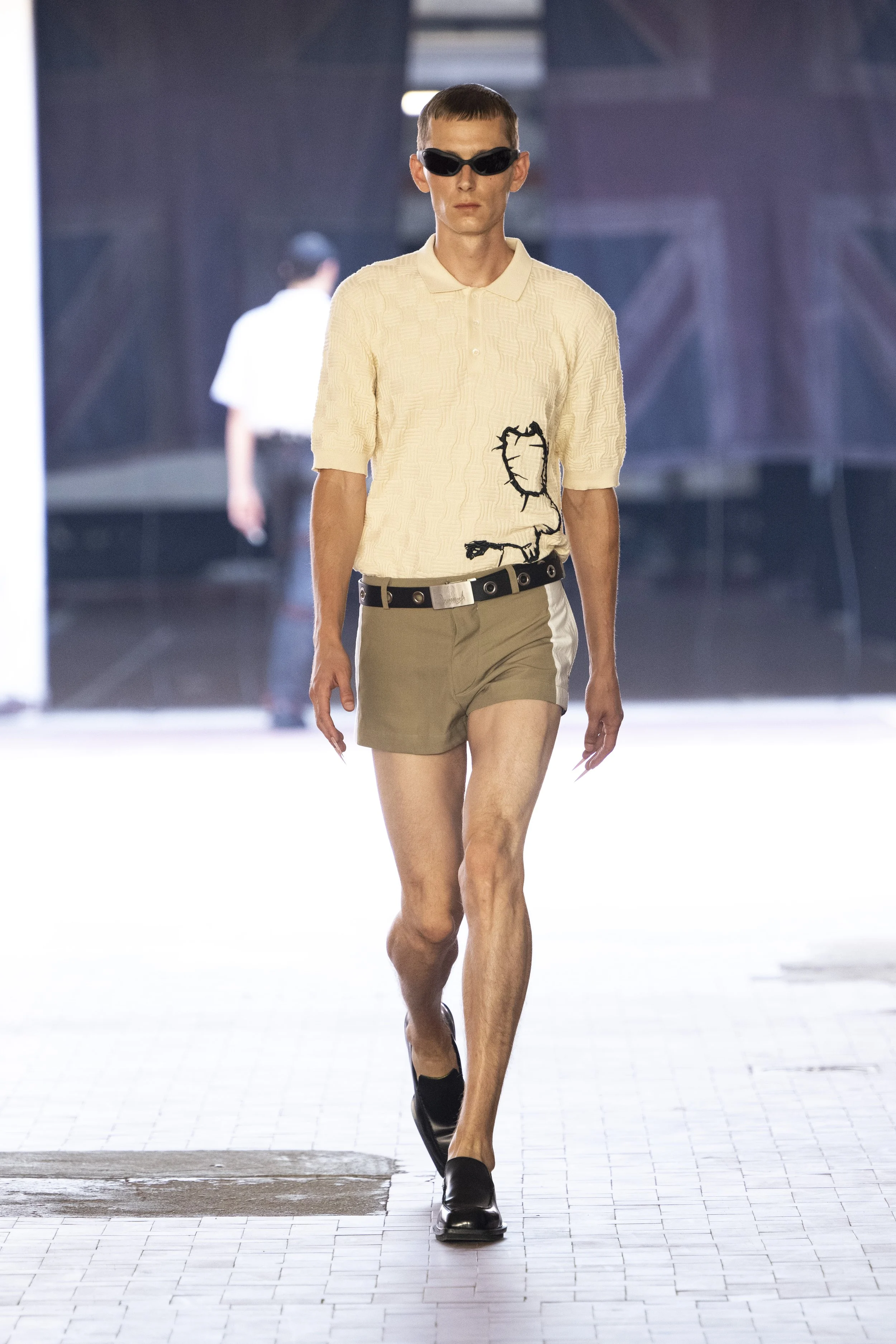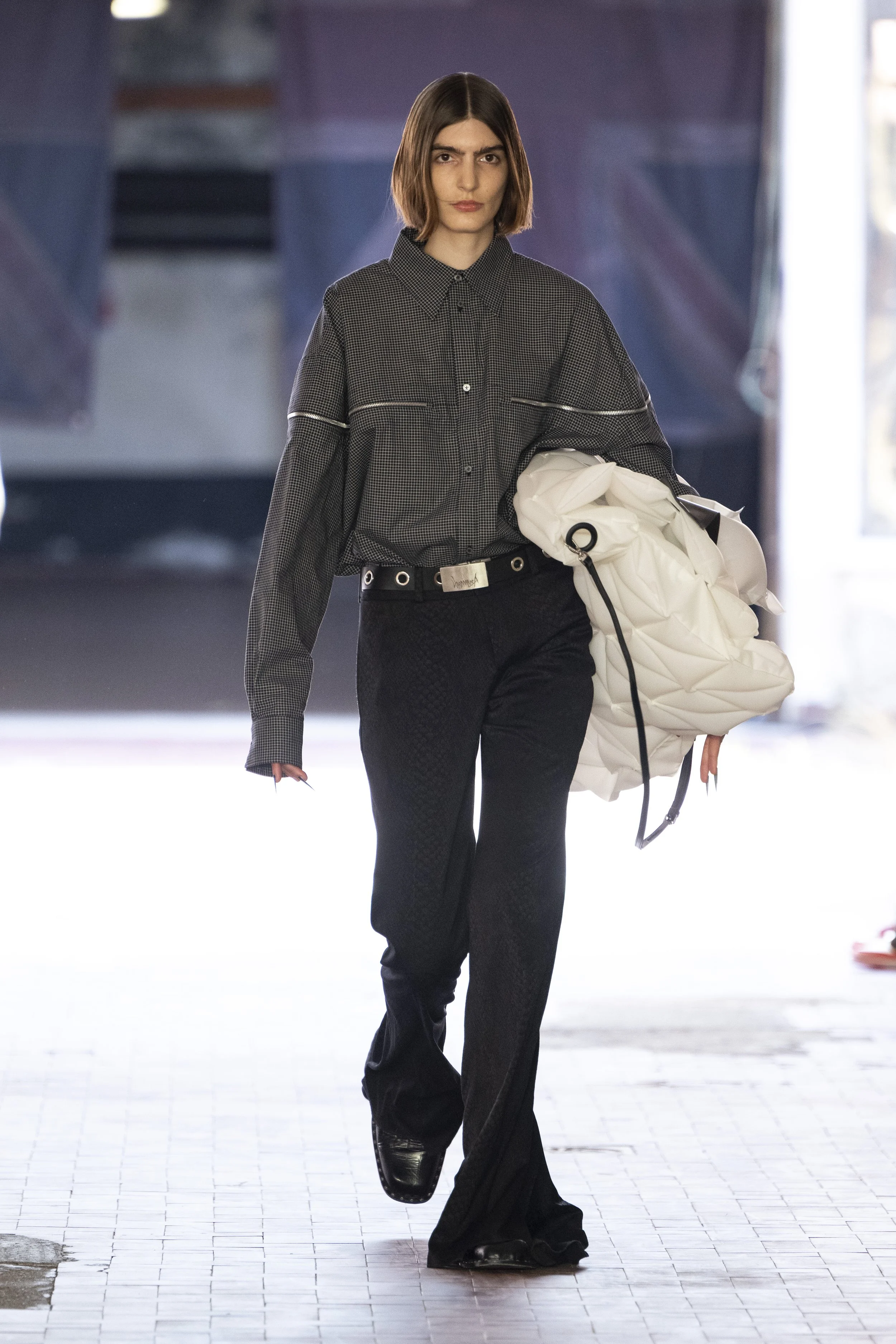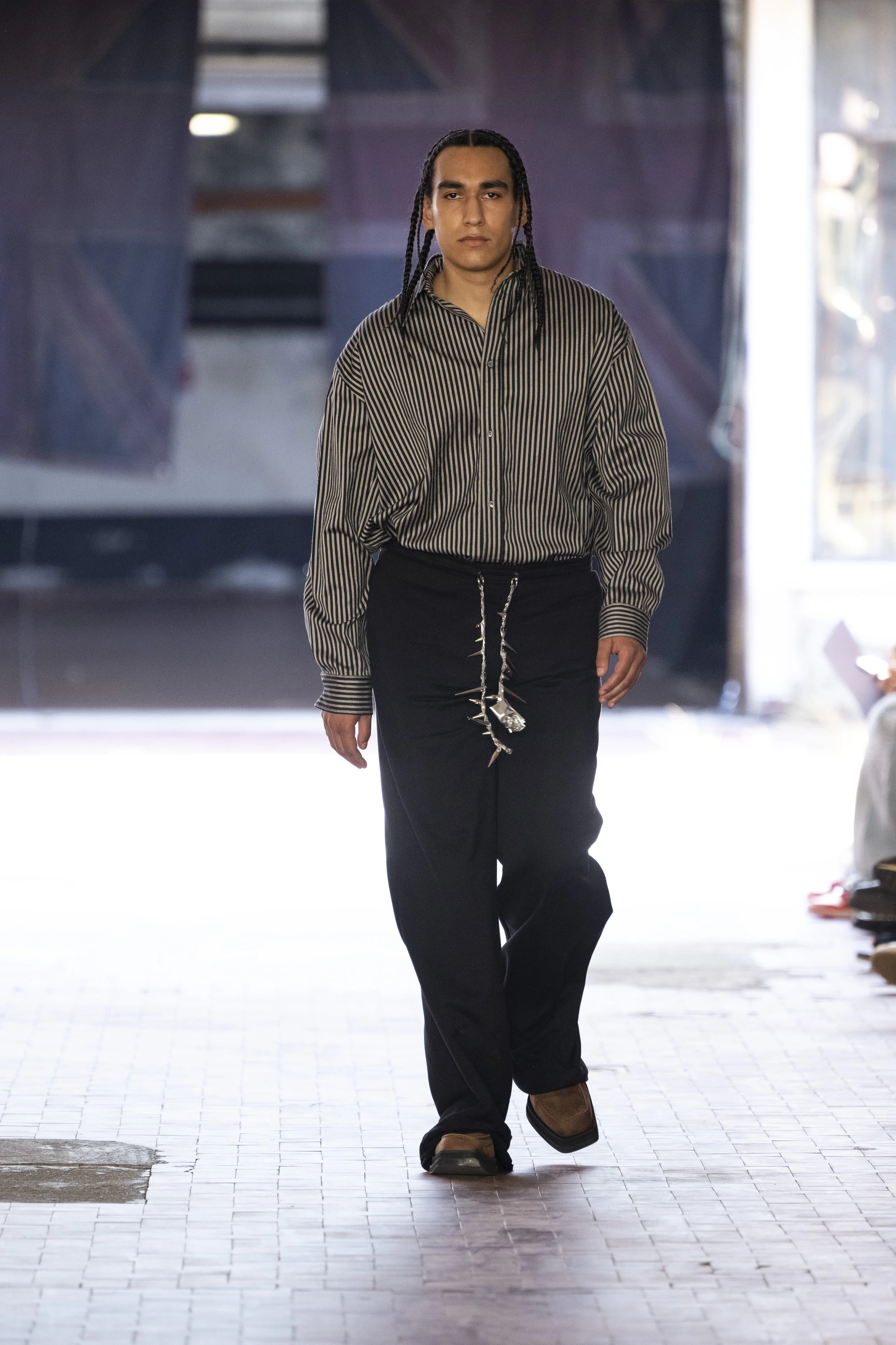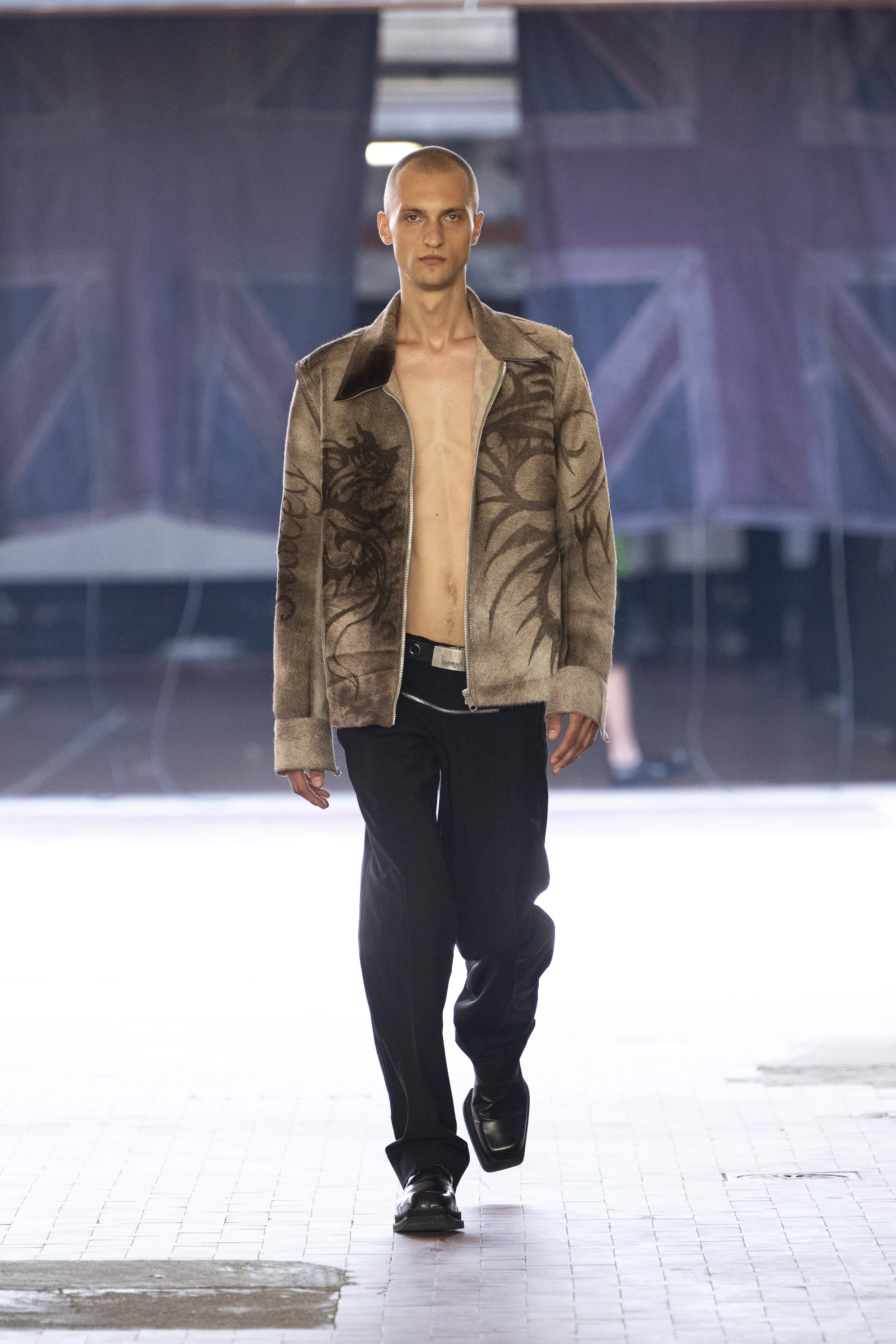 Where do you go when you go quiet? Thinking about Sigmund Freud’s “Death Drive”, Jordan Bowen and Luca Marchetto dived into the act of dark pleasure, and the lustrous taste behind the psychology of seeking self-destruction. The collection opened with a spotlight around the feeling of entanglement through restrictive tops, wrapping around the arms and textured cream polo shirts, whirling around thorns and chains pushing and pulling away from the inner monologue of pain and pleasure inside. Oversized bomber jackets and materfully blown out blazers protruded outwards through zips, which symbolised scars and wounds, whether psychological or physical, inflicted by trauma, but also symbolising the pathway towards healing.