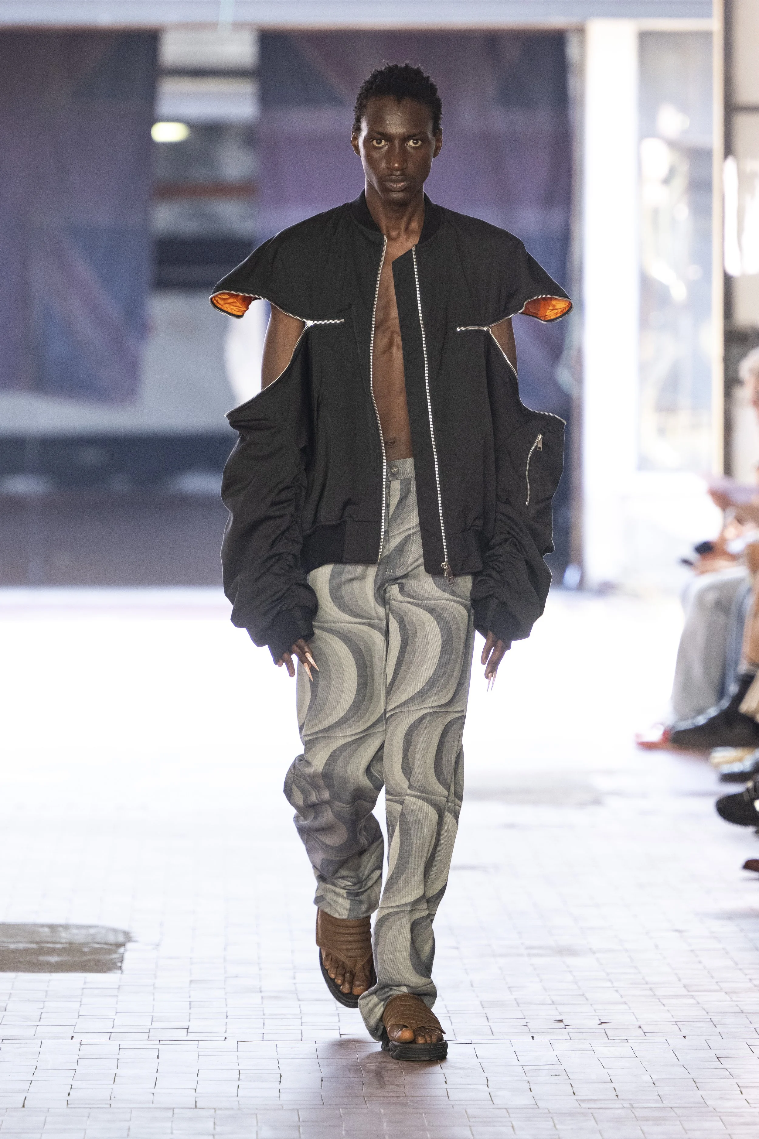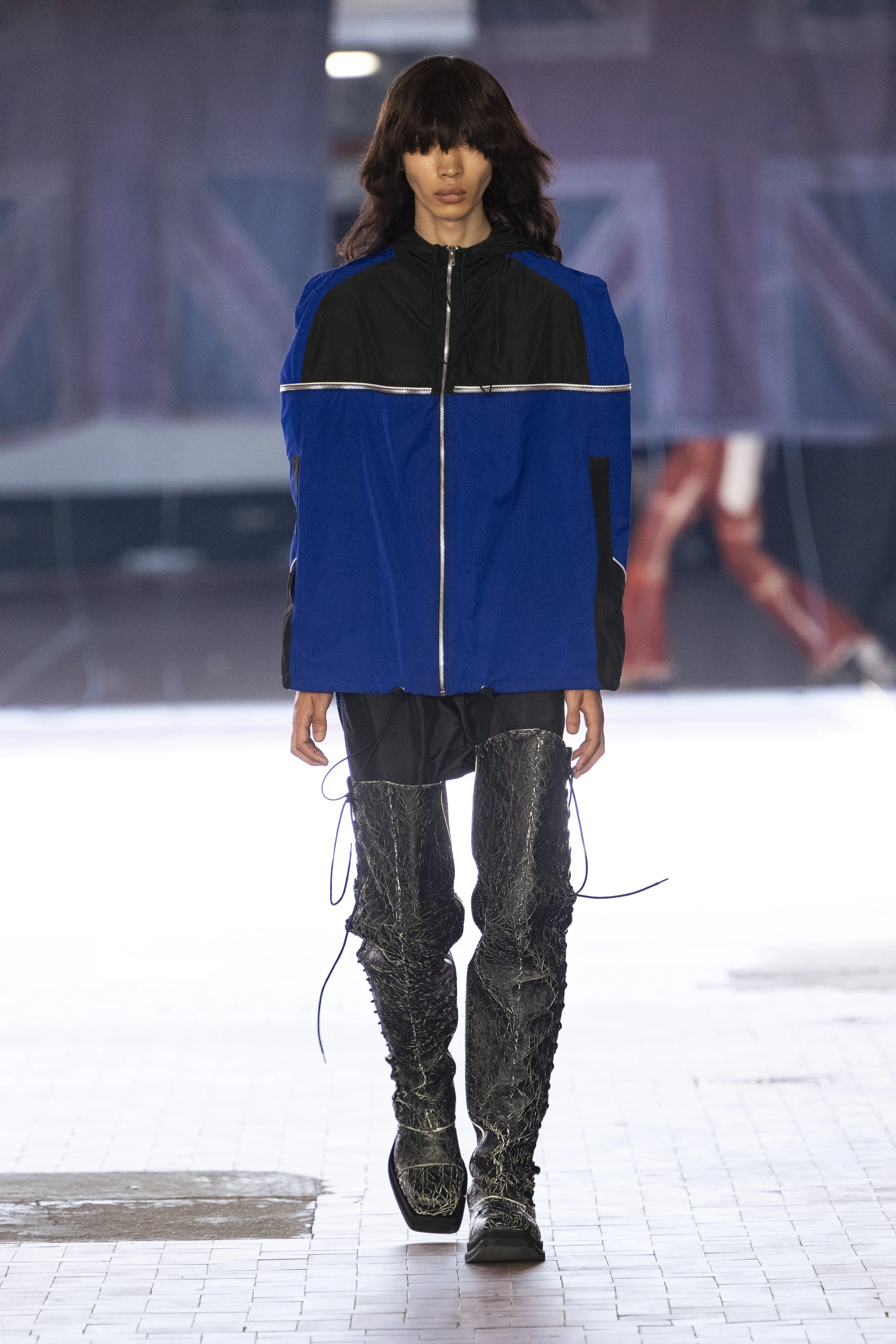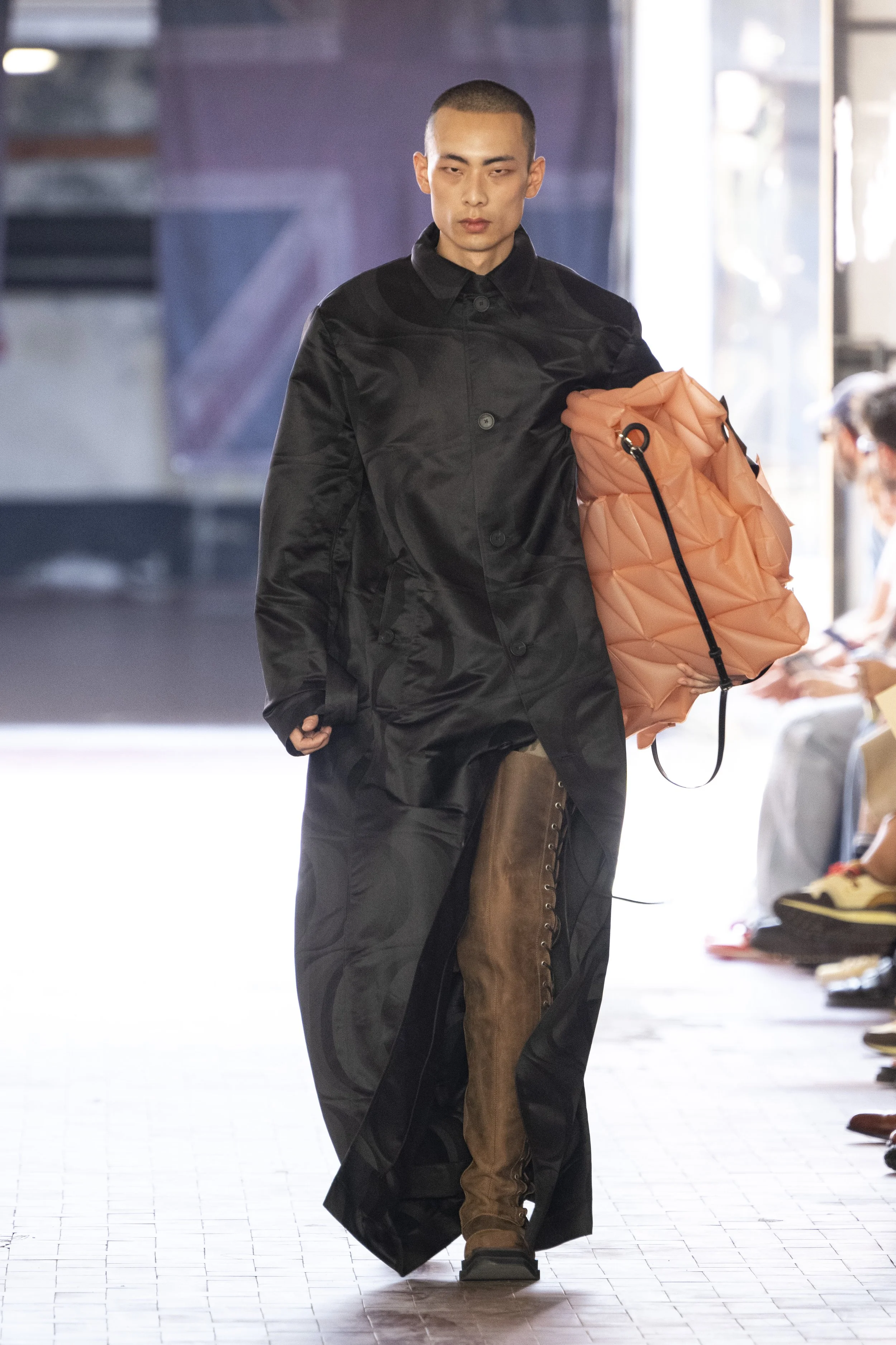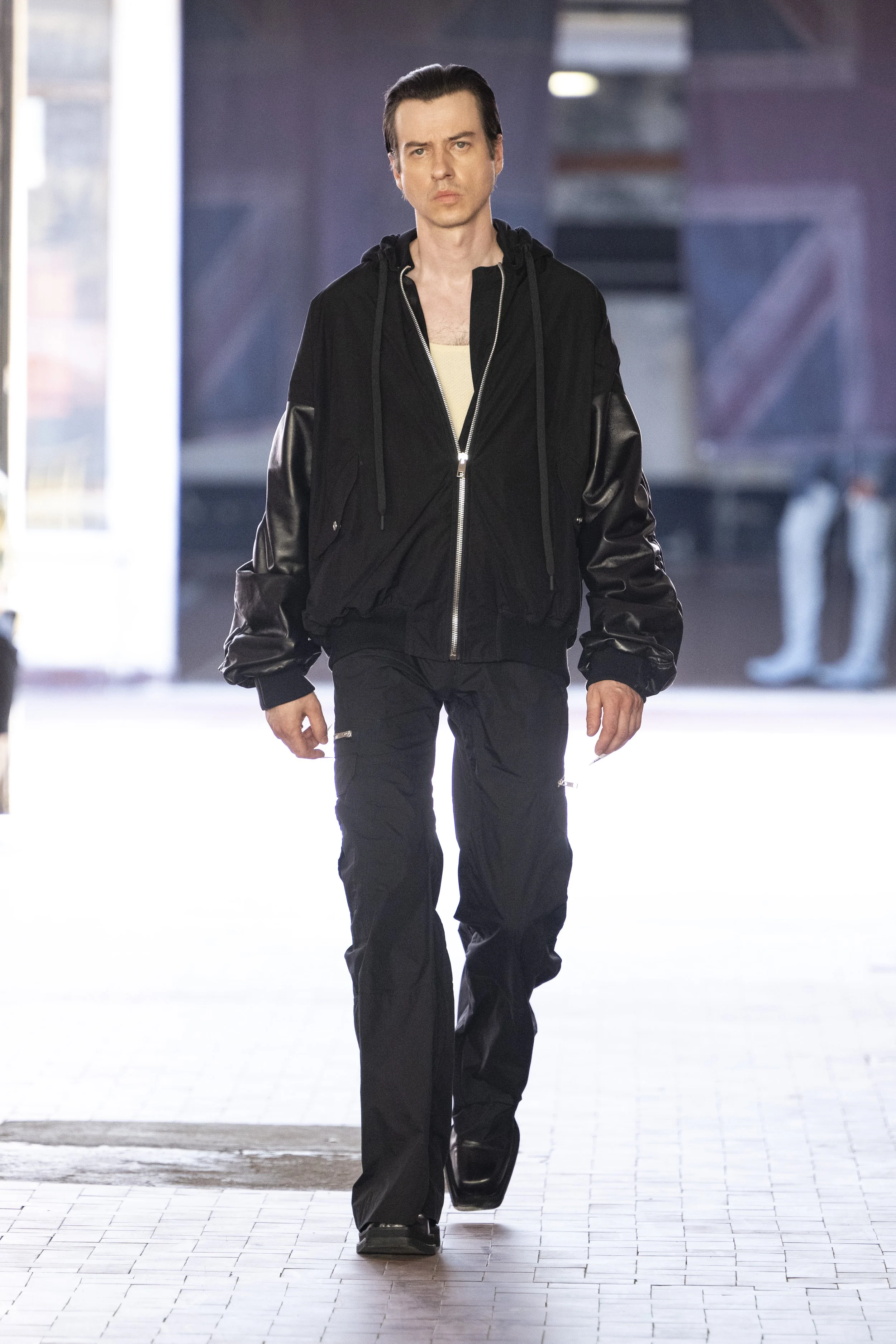 Where do you go when you go quiet? Thinking about Sigmund Freud’s “Death Drive”, Jordan Bowen and Luca Marchetto dived into the act of dark pleasure, and the lustrous taste behind the psychology of seeking self-destruction. The collection opened with a spotlight around the feeling of entanglement through restrictive tops, wrapping around the arms and textured cream polo shirts, whirling around thorns and chains pushing and pulling away from the inner monologue of pain and pleasure inside. Oversized bomber jackets and materfully blown out blazers protruded outwards through zips, which symbolised scars and wounds, whether psychological or physical, inflicted by trauma, but also symbolising the pathway towards healing.