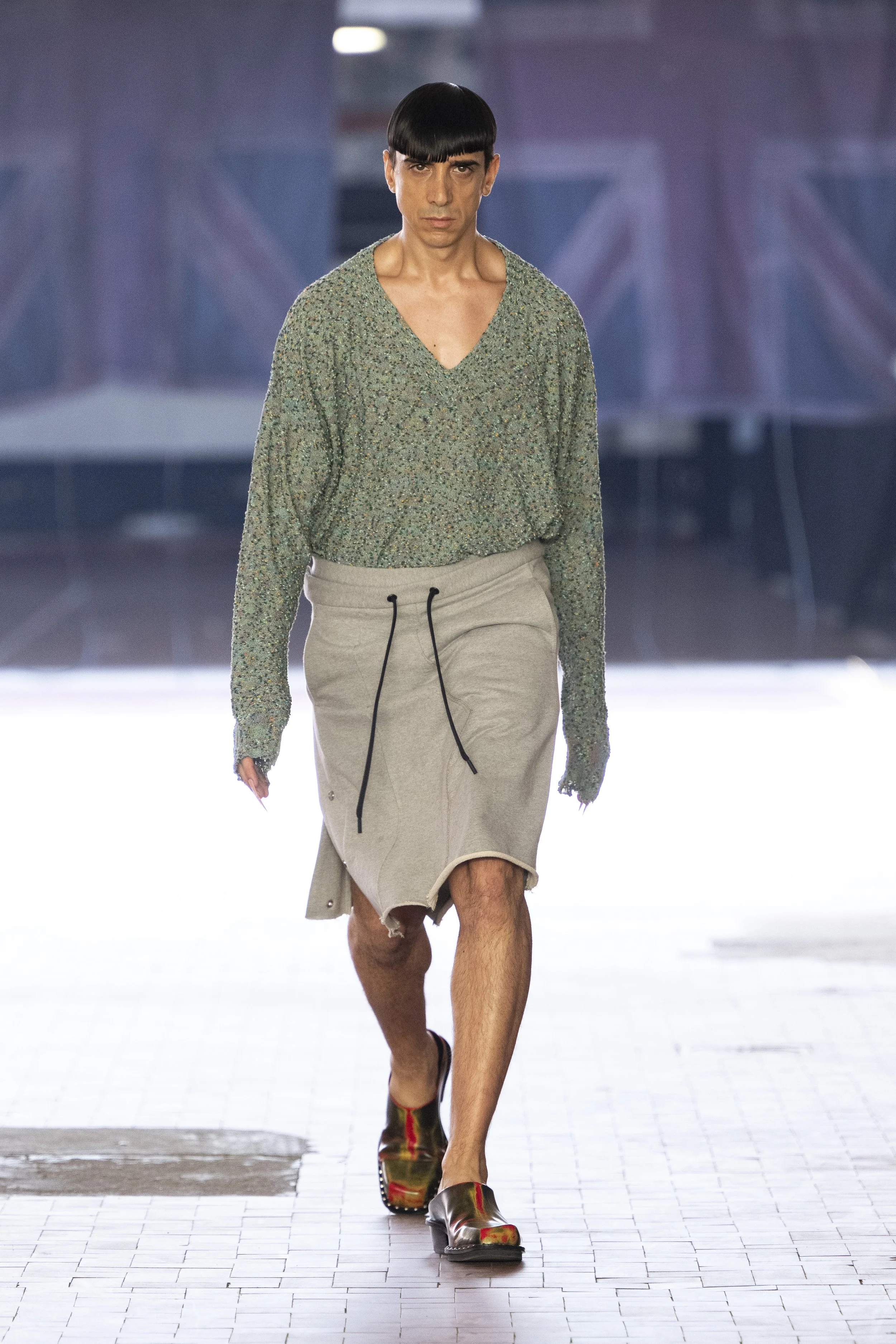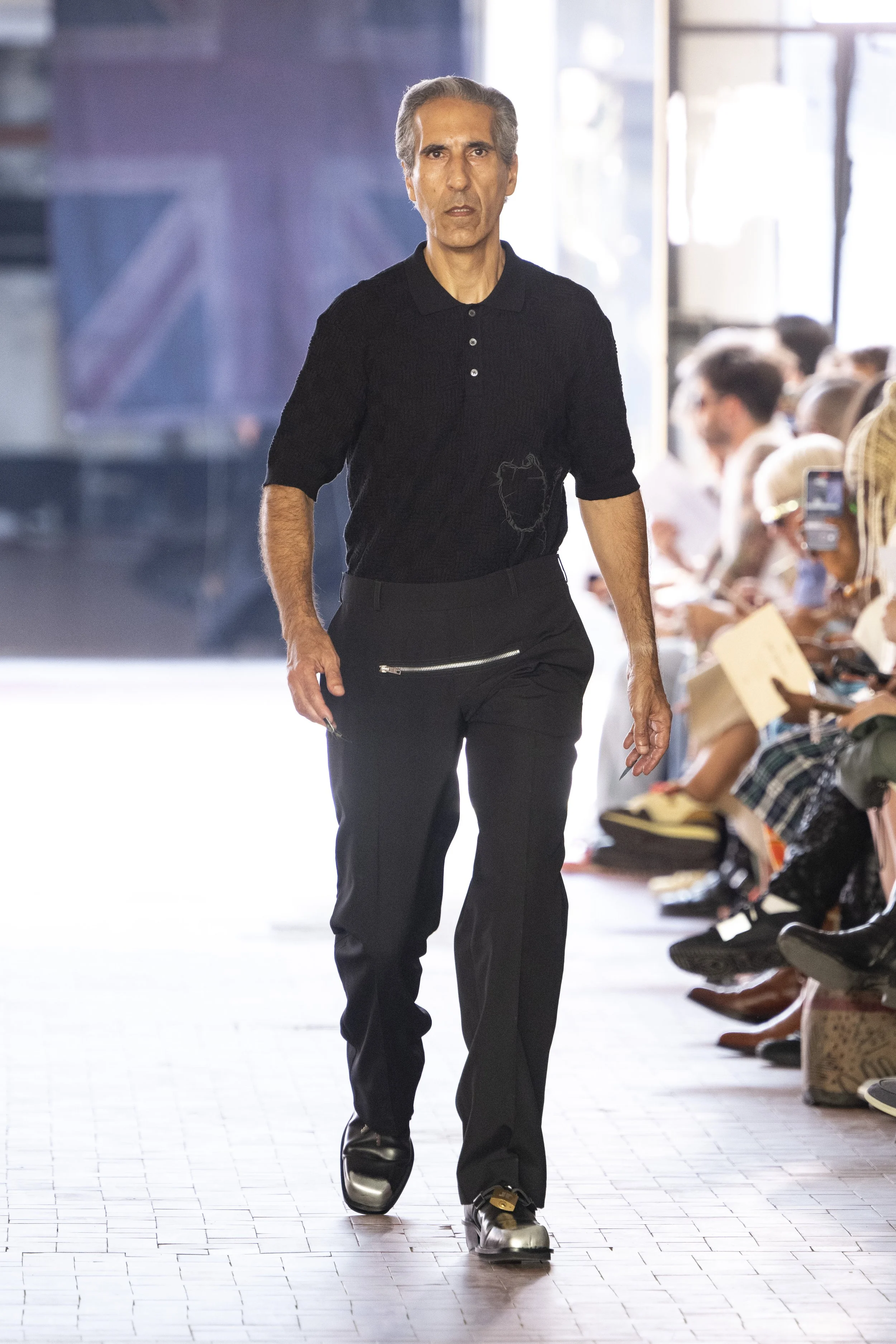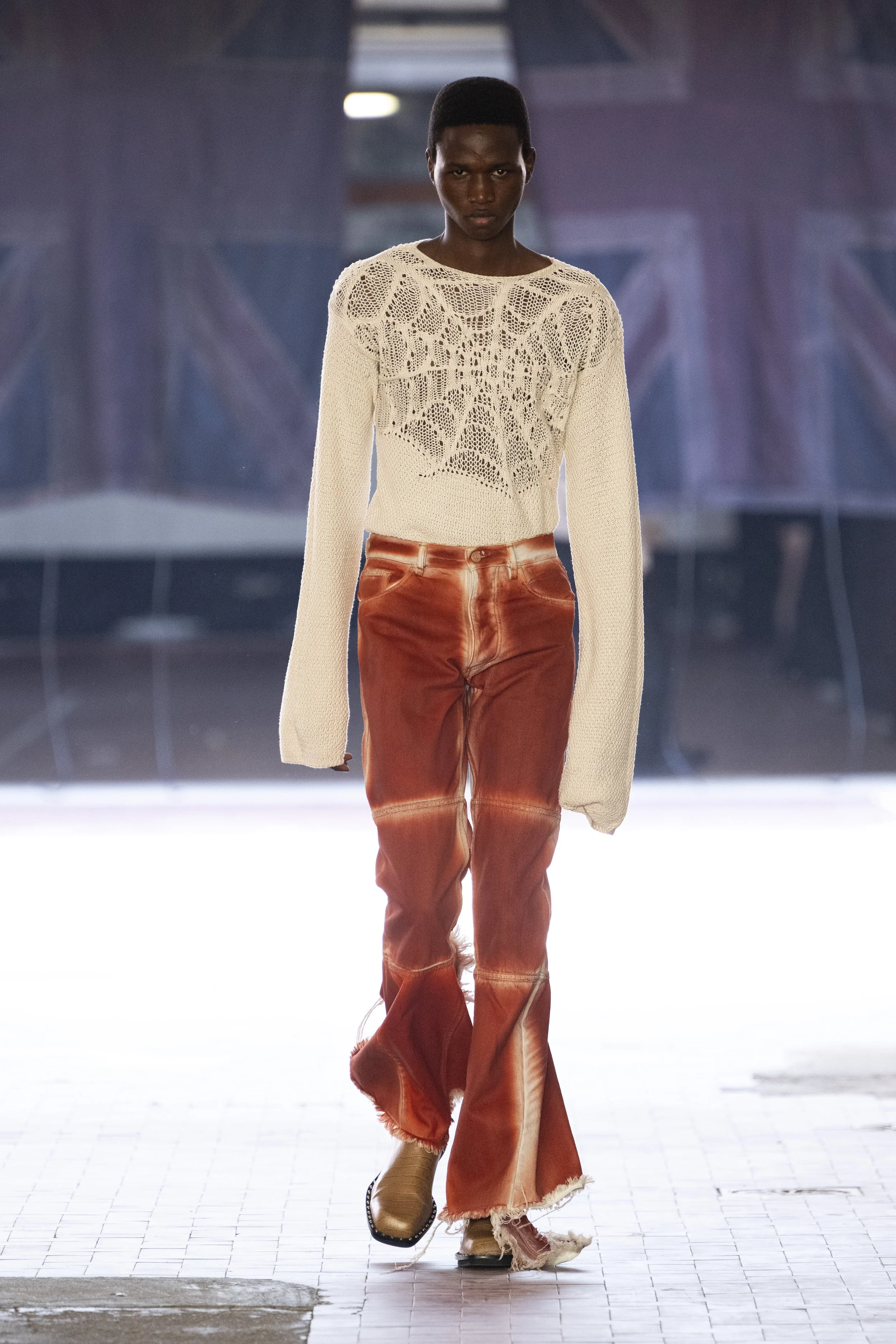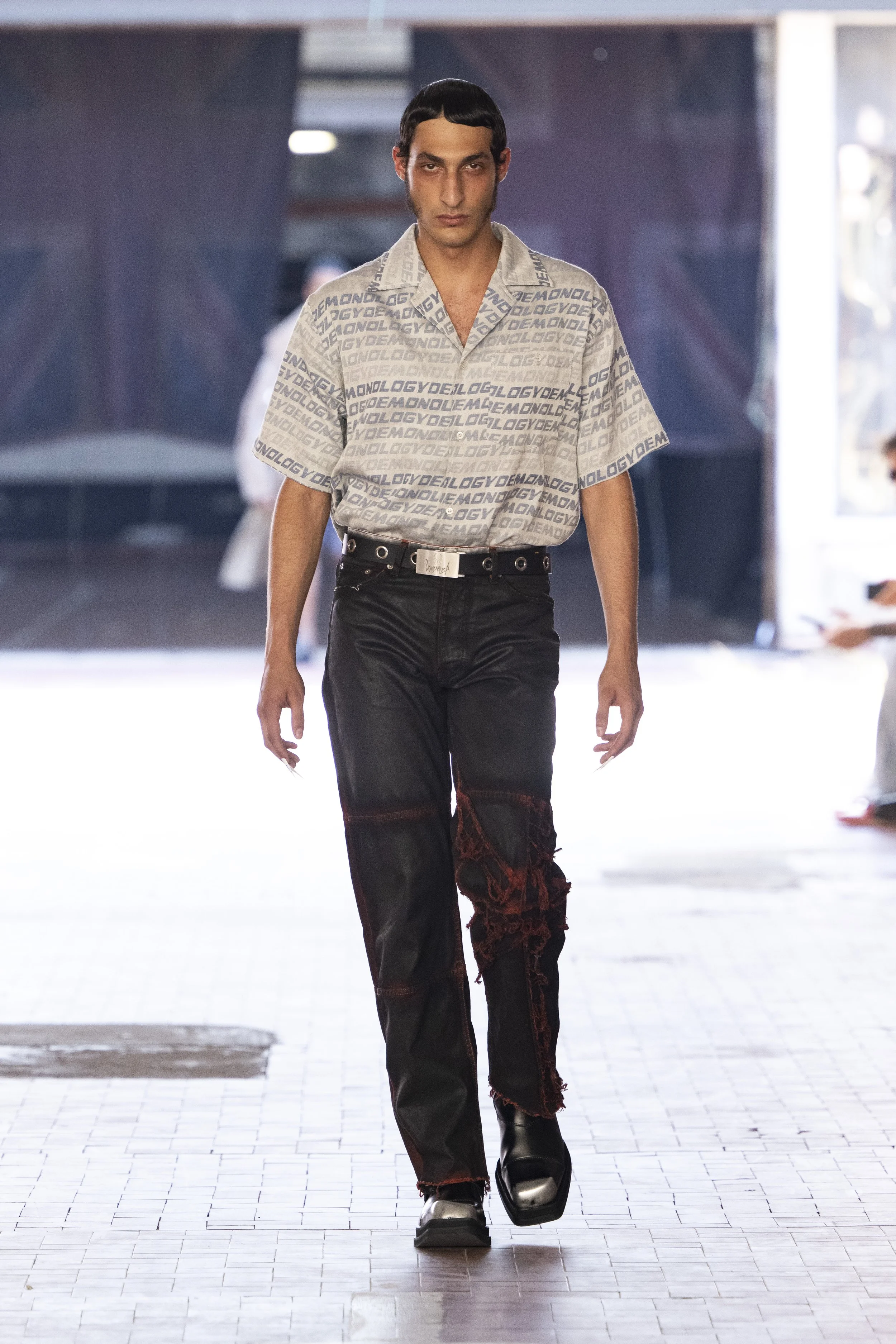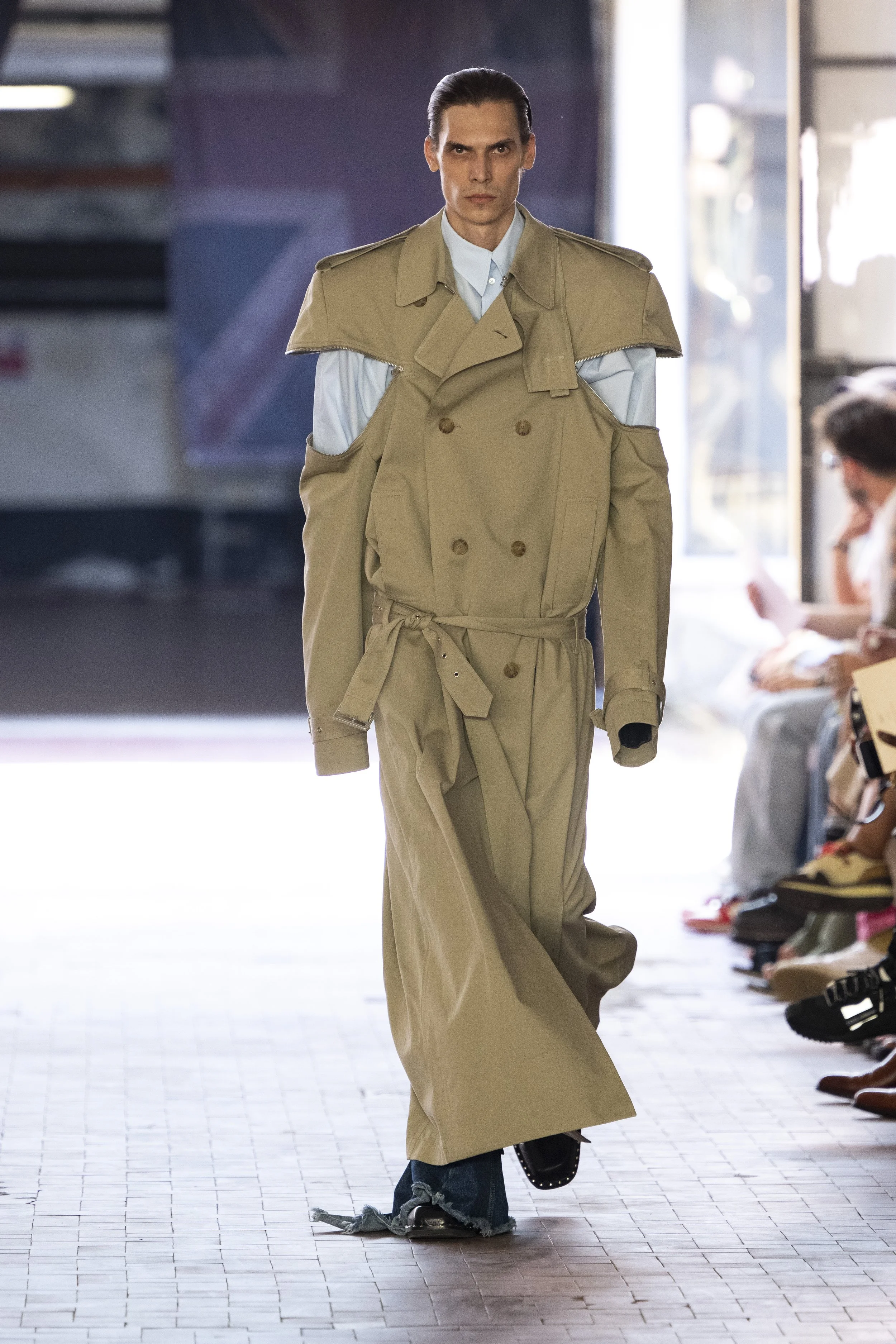 Where do you go when you go quiet? Thinking about Sigmund Freud’s “Death Drive”, Jordan Bowen and Luca Marchetto dived into the act of dark pleasure, and the lustrous taste behind the psychology of seeking self-destruction. The collection opened with a spotlight around the feeling of entanglement through restrictive tops, wrapping around the arms and textured cream polo shirts, whirling around thorns and chains pushing and pulling away from the inner monologue of pain and pleasure inside. Oversized bomber jackets and materfully blown out blazers protruded outwards through zips, which symbolised scars and wounds, whether psychological or physical, inflicted by trauma, but also symbolising the pathway towards healing.