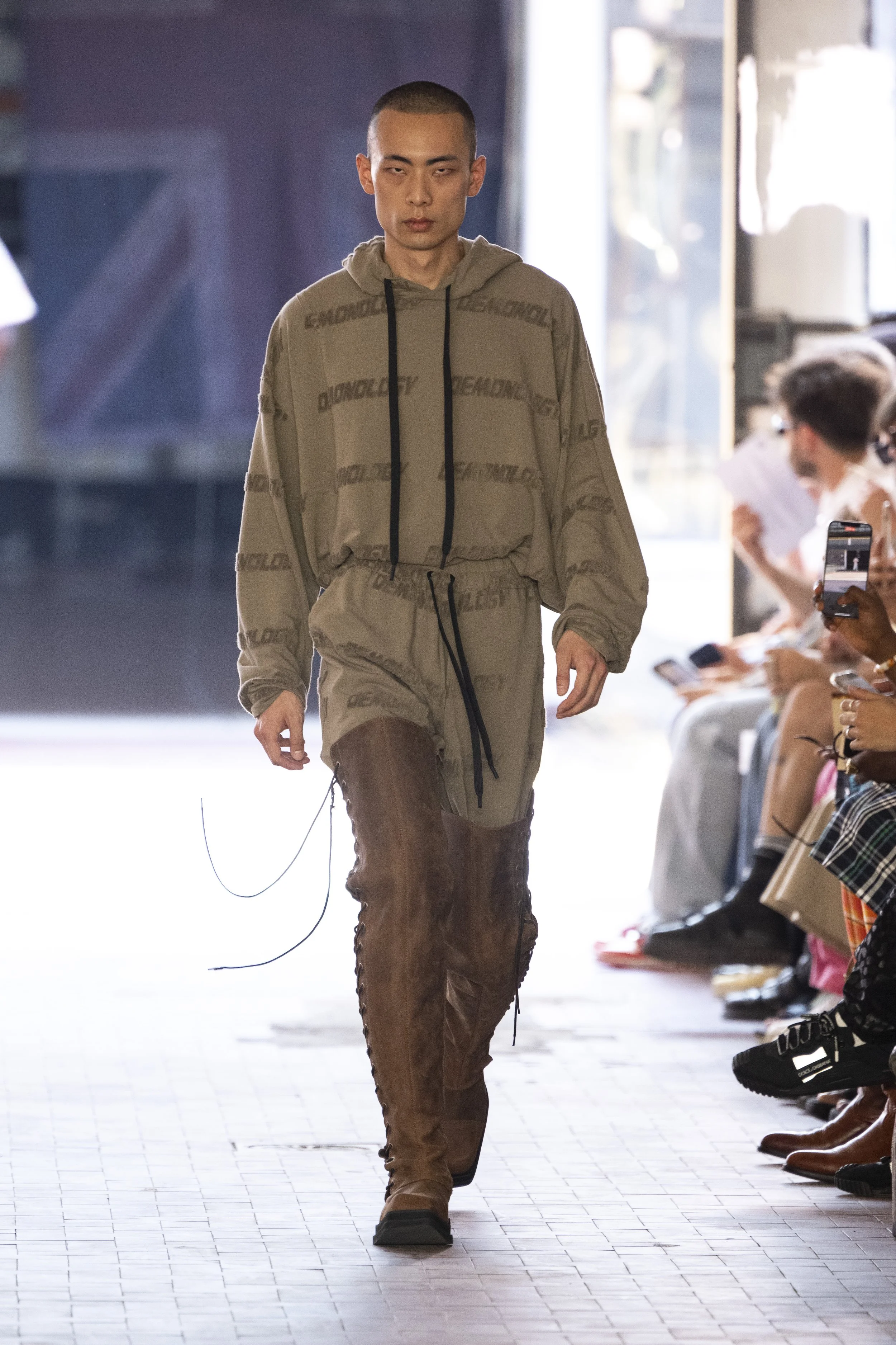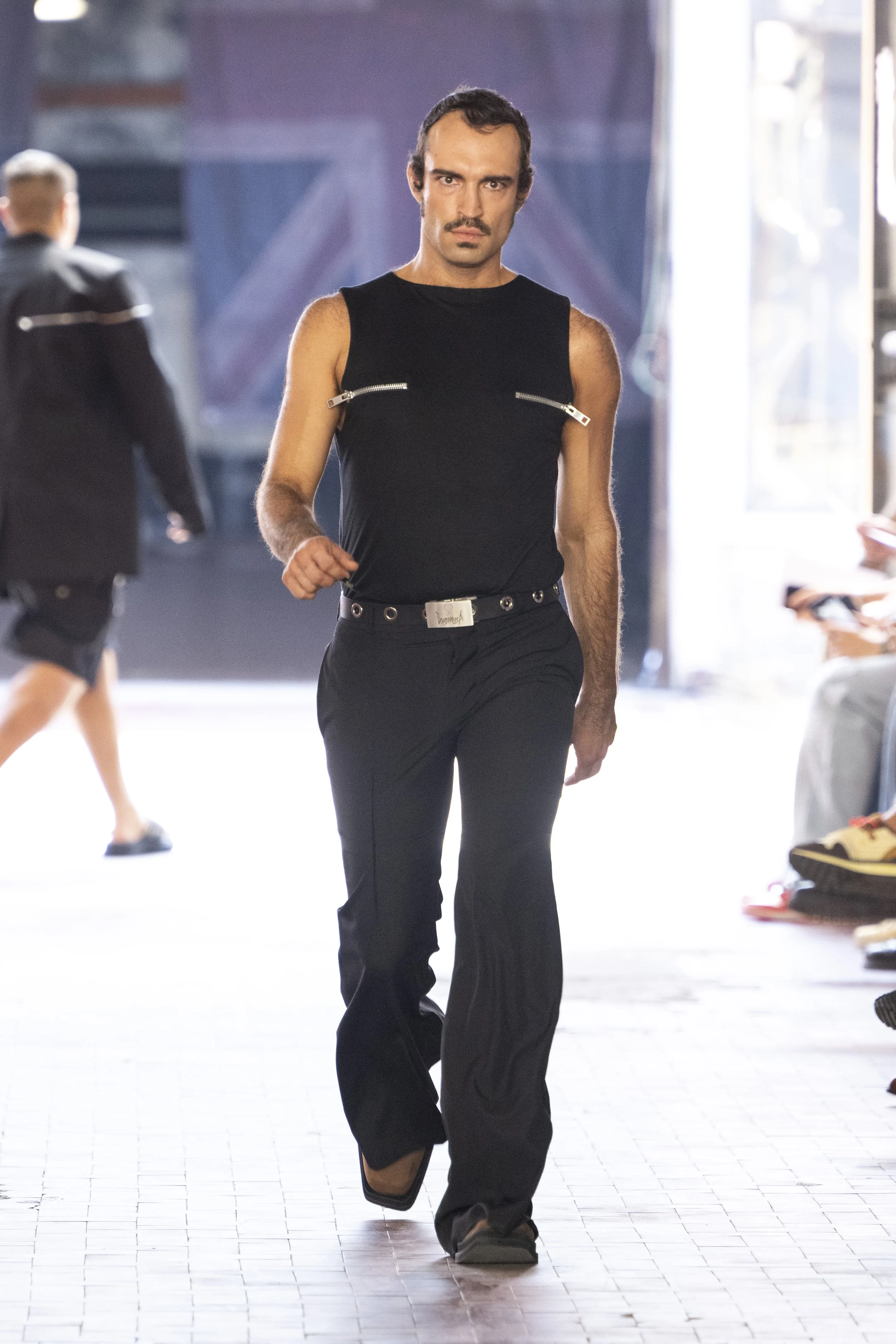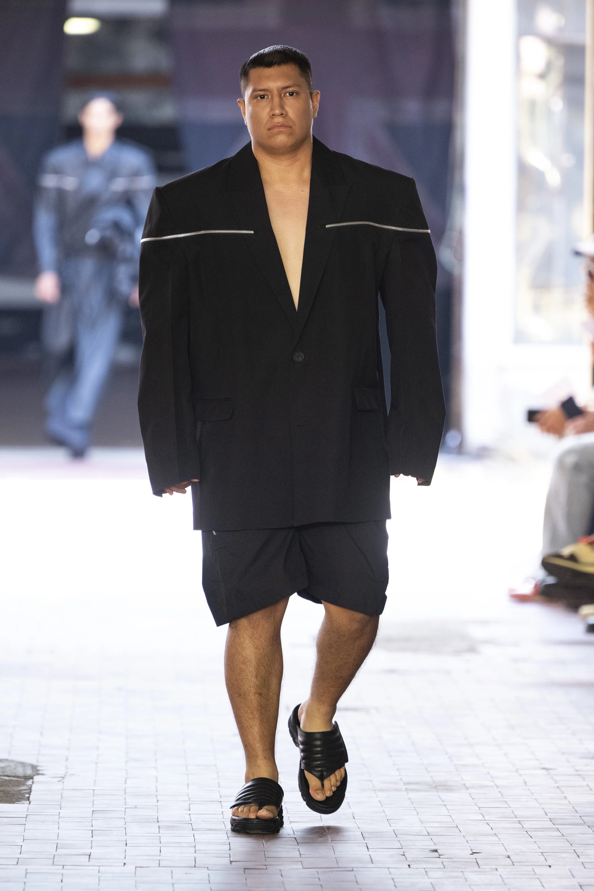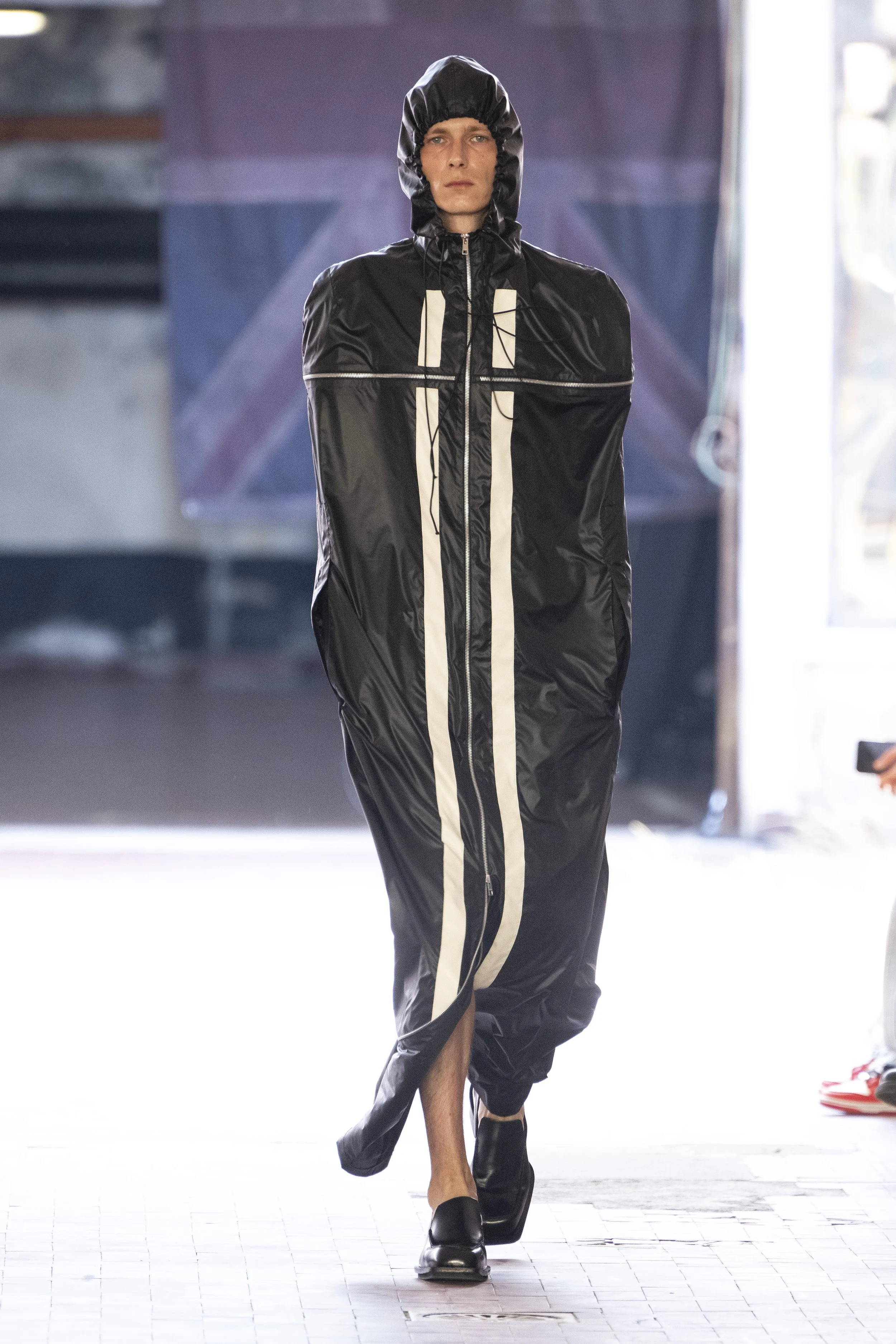Where do you go when you go quiet? Thinking about Sigmund Freud’s “Death Drive”, Jordan Bowen and Luca Marchetto dived into the act of dark pleasure, and the lustrous taste behind the psychology of seeking self-destruction. The collection opened with a spotlight around the feeling of entanglement through restrictive tops, wrapping around the arms and textured cream polo shirts, whirling around thorns and chains pushing and pulling away from the inner monologue of pain and pleasure inside. Oversized bomber jackets and materfully blown out blazers protruded outwards through zips, which symbolised scars and wounds, whether psychological or physical, inflicted by trauma, but also symbolising the pathway towards healing.