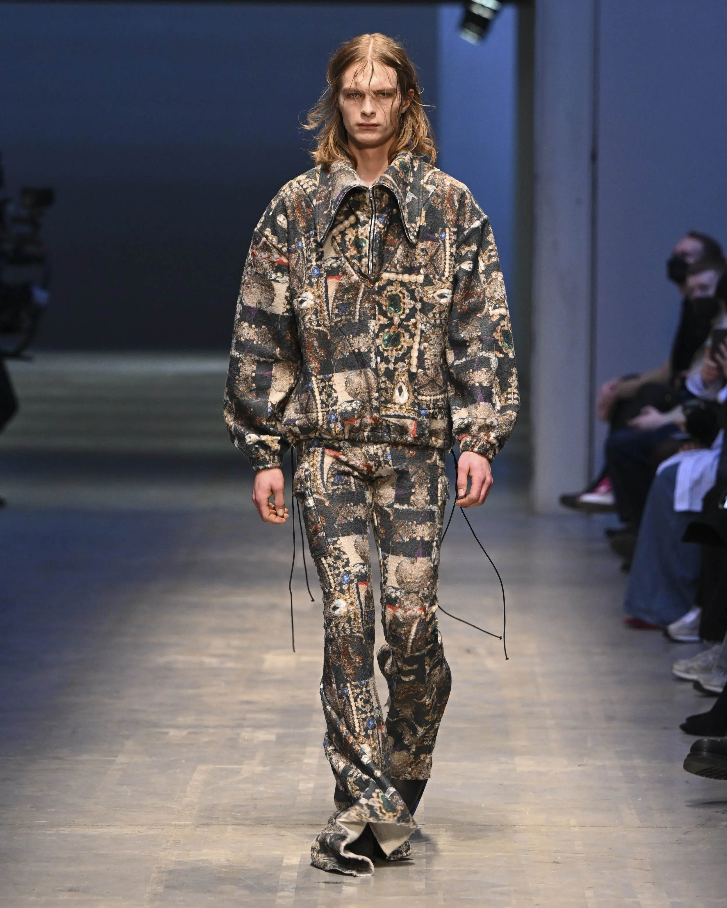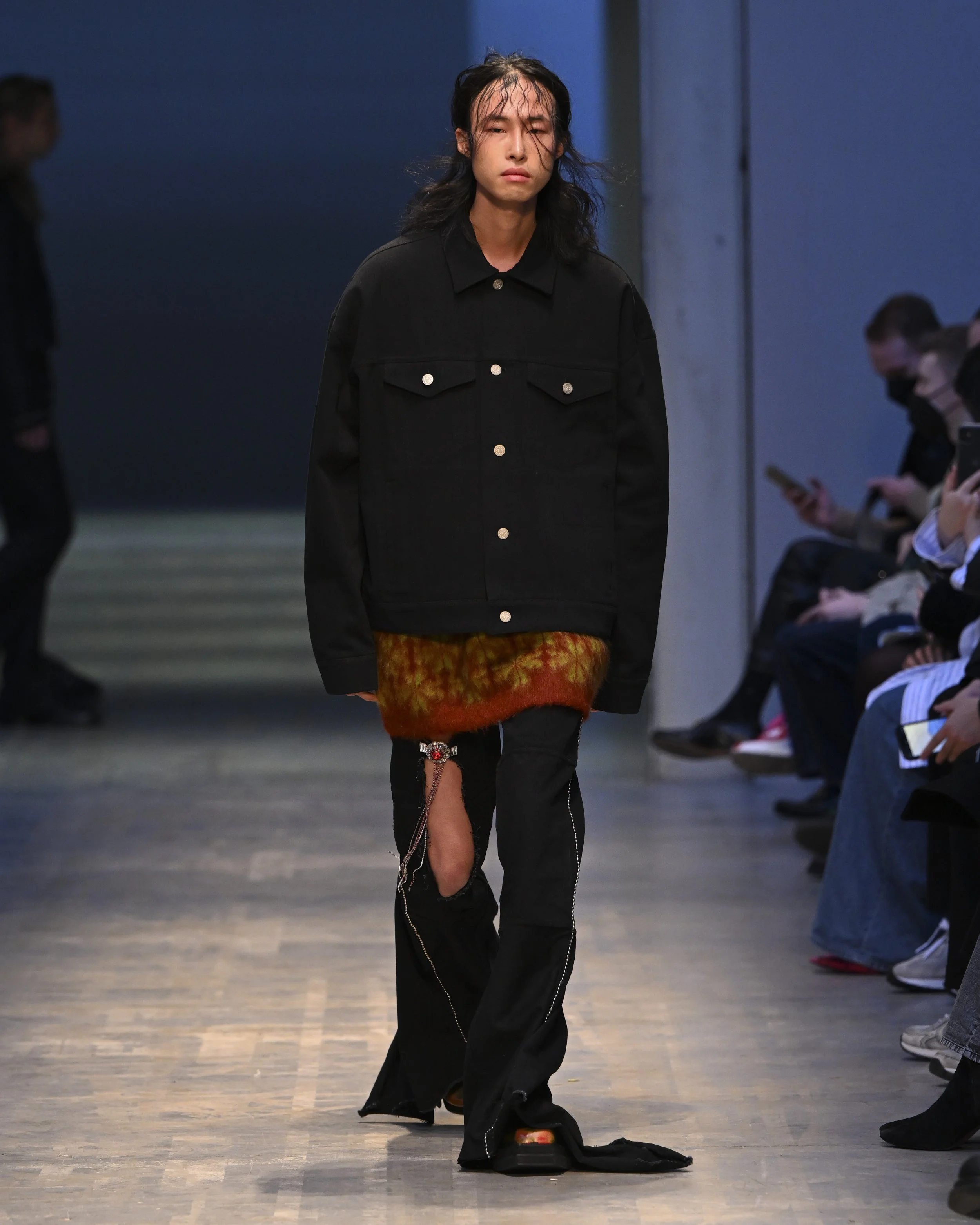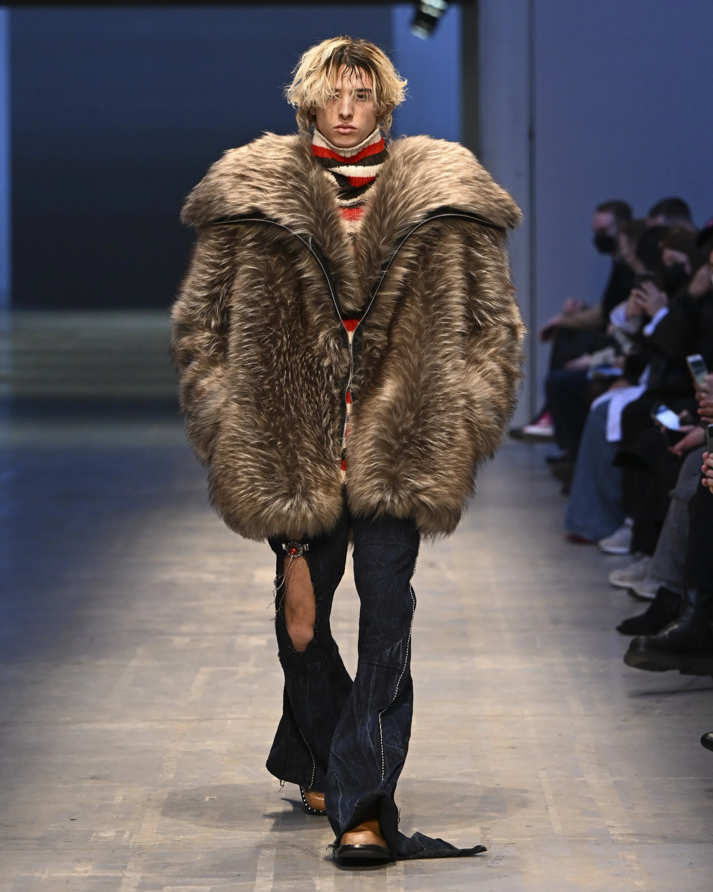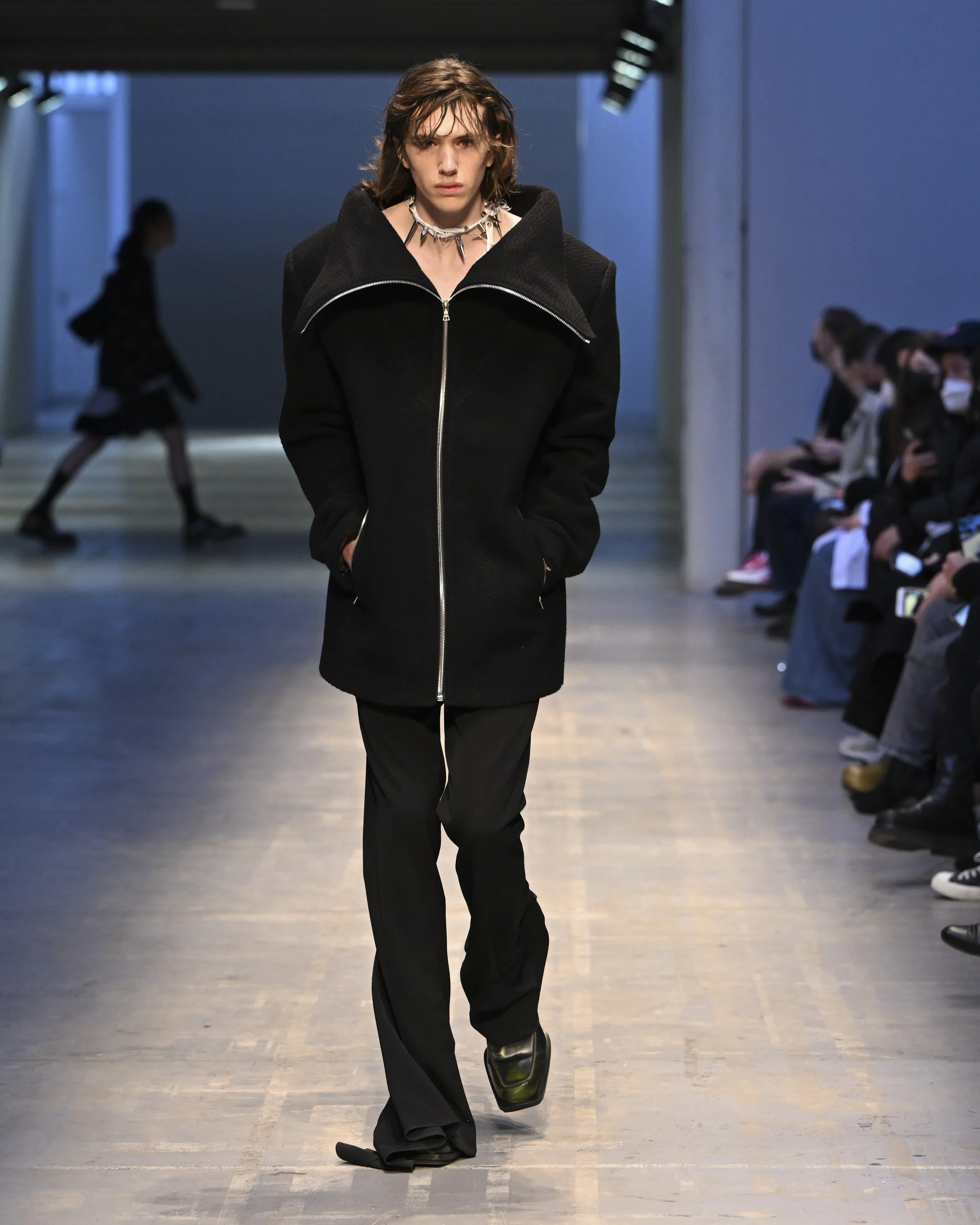 Mystery, rebellion and deep fragility: this is what the British-Italian duo JORDANLUCA delivered on Saturday in Milan during their AW22 show. Walking down to a harrowing soundtrack of love and betrayal, the clothes completed the story of transforming heartbreak into love towards one’s self. Burnished black leather jackets in oversized silhouettes, flared denim with jewelled brooches fixed at the rips and dramatically oversized fingerless gloves all brought the sensation for anger and seduction into one — the type of love that makes you go crazy.