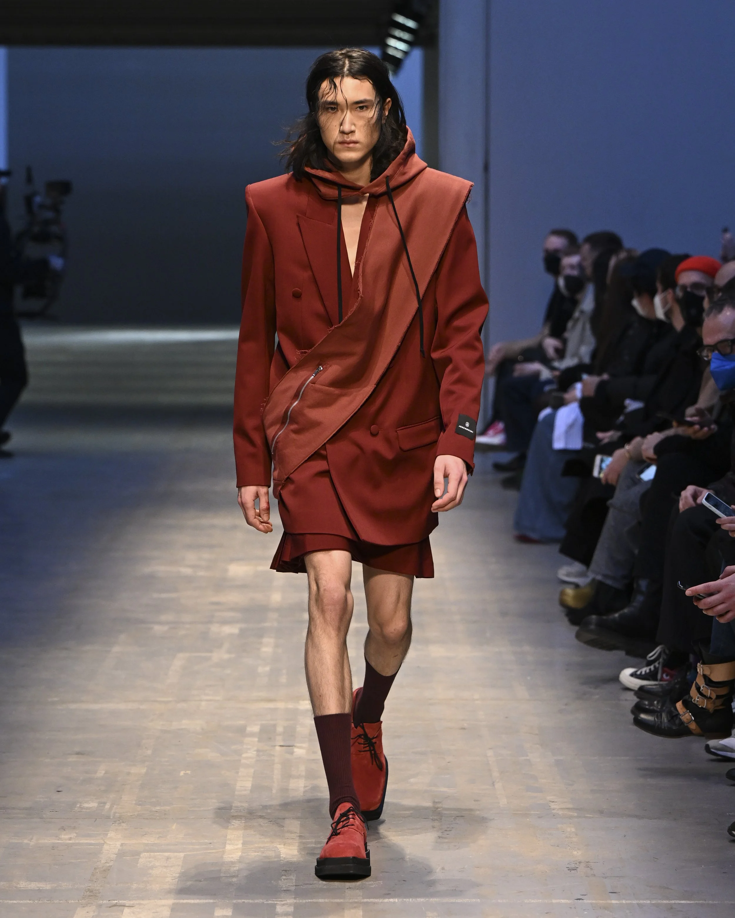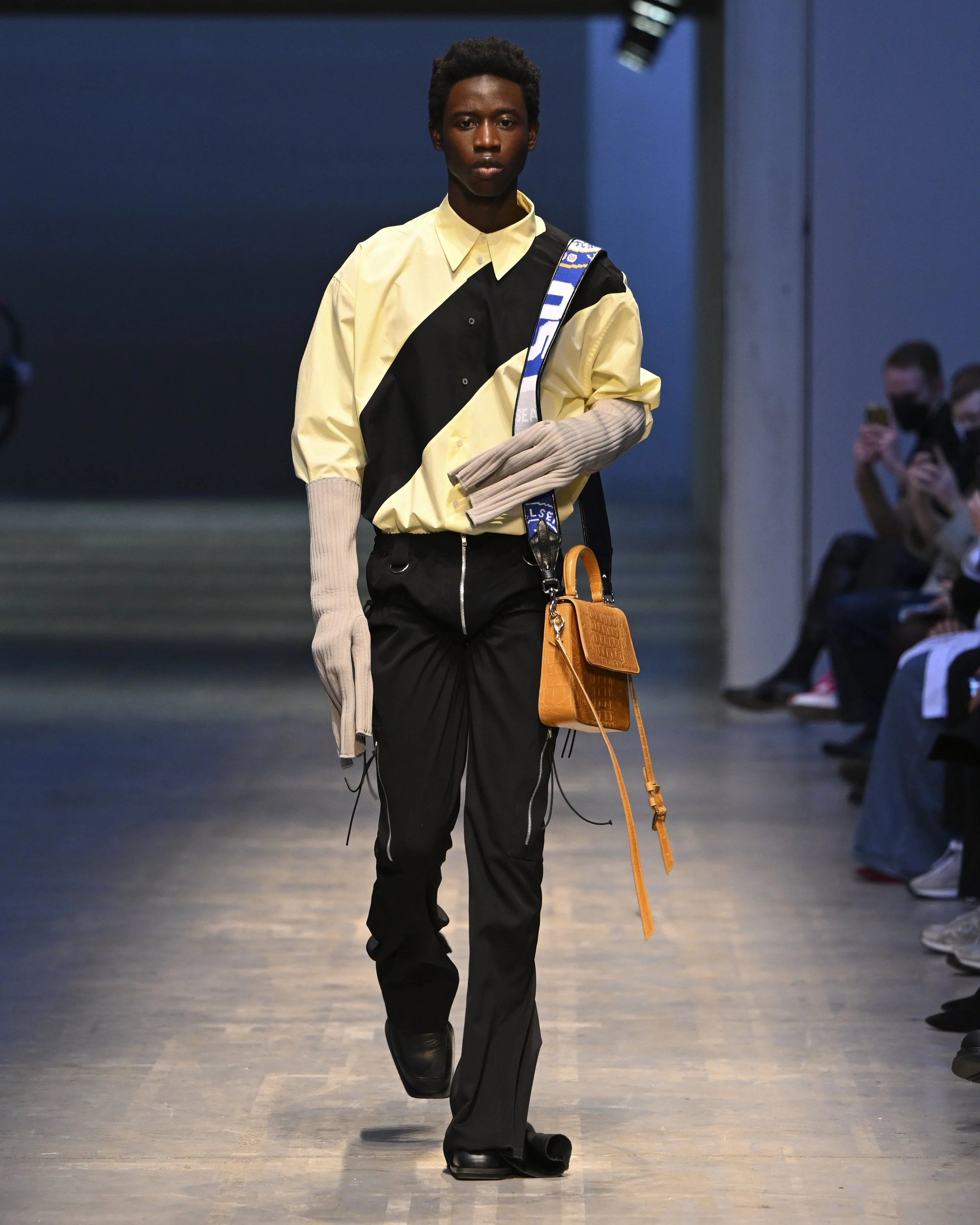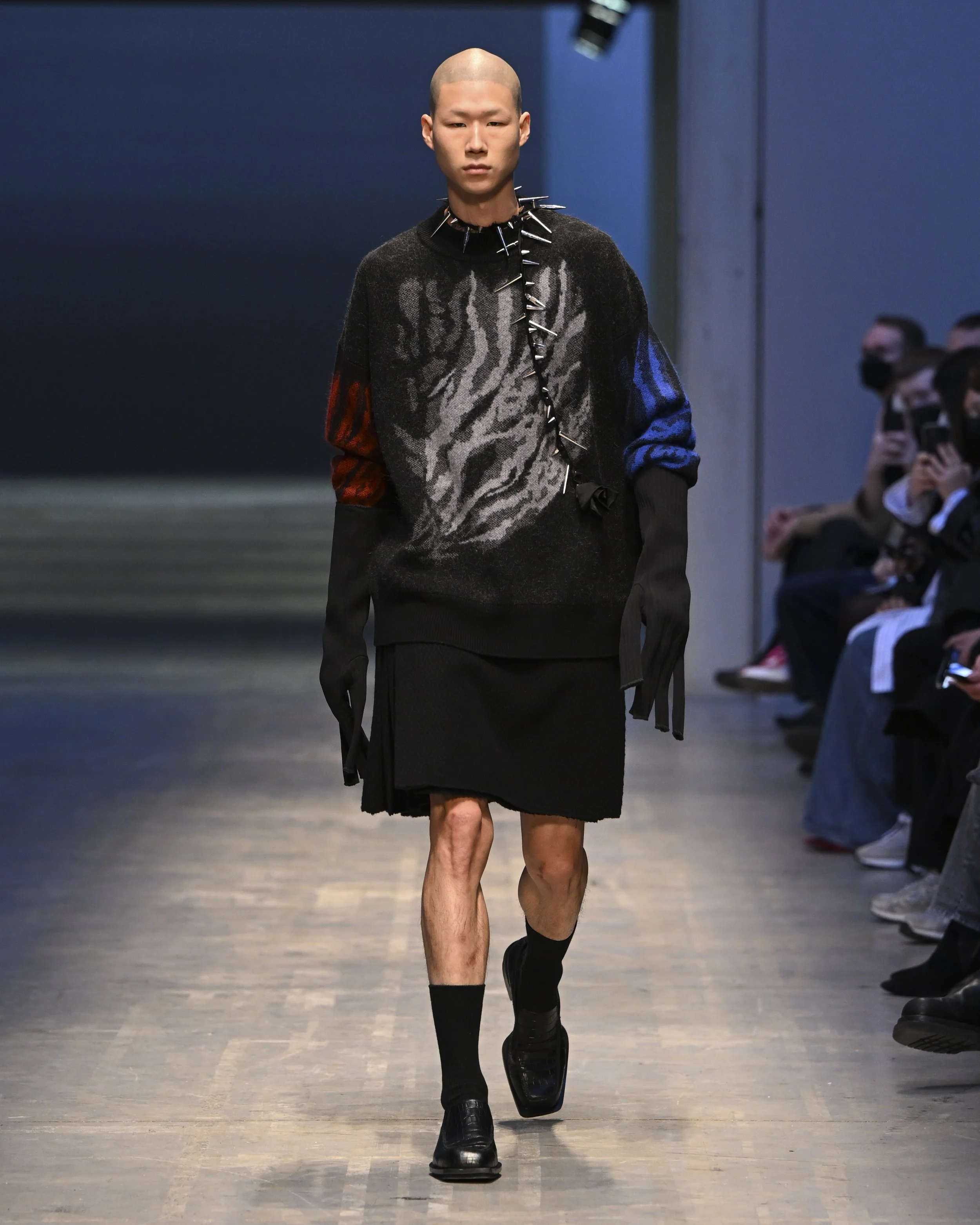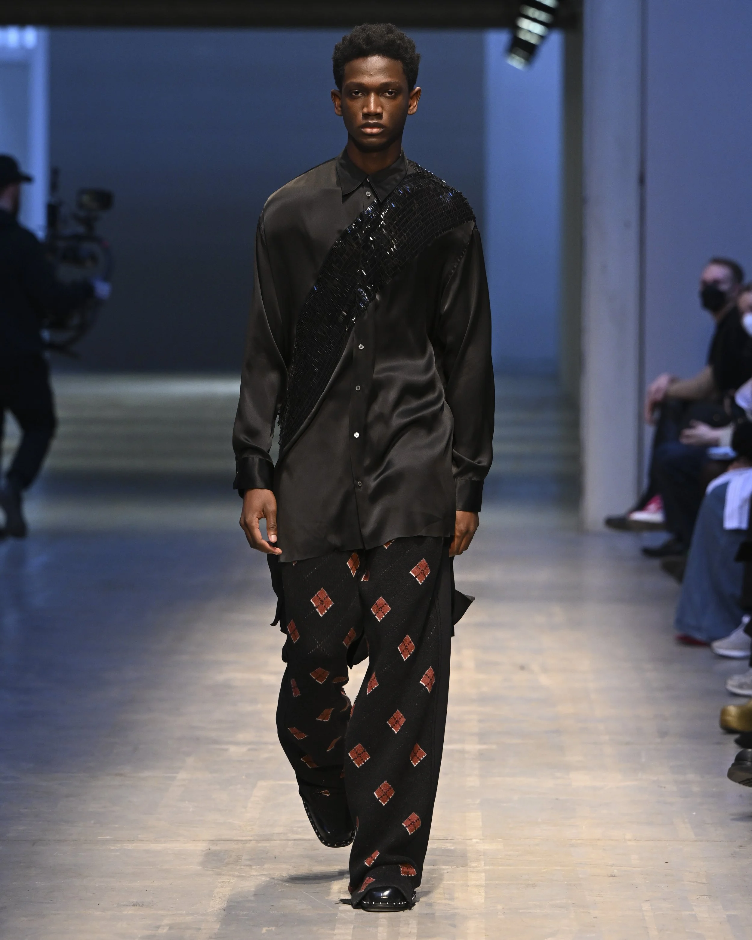 Mystery, rebellion and deep fragility: this is what the British-Italian duo JORDANLUCA delivered on Saturday in Milan during their AW22 show. Walking down to a harrowing soundtrack of love and betrayal, the clothes completed the story of transforming heartbreak into love towards one’s self. Burnished black leather jackets in oversized silhouettes, flared denim with jewelled brooches fixed at the rips and dramatically oversized fingerless gloves all brought the sensation for anger and seduction into one — the type of love that makes you go crazy.