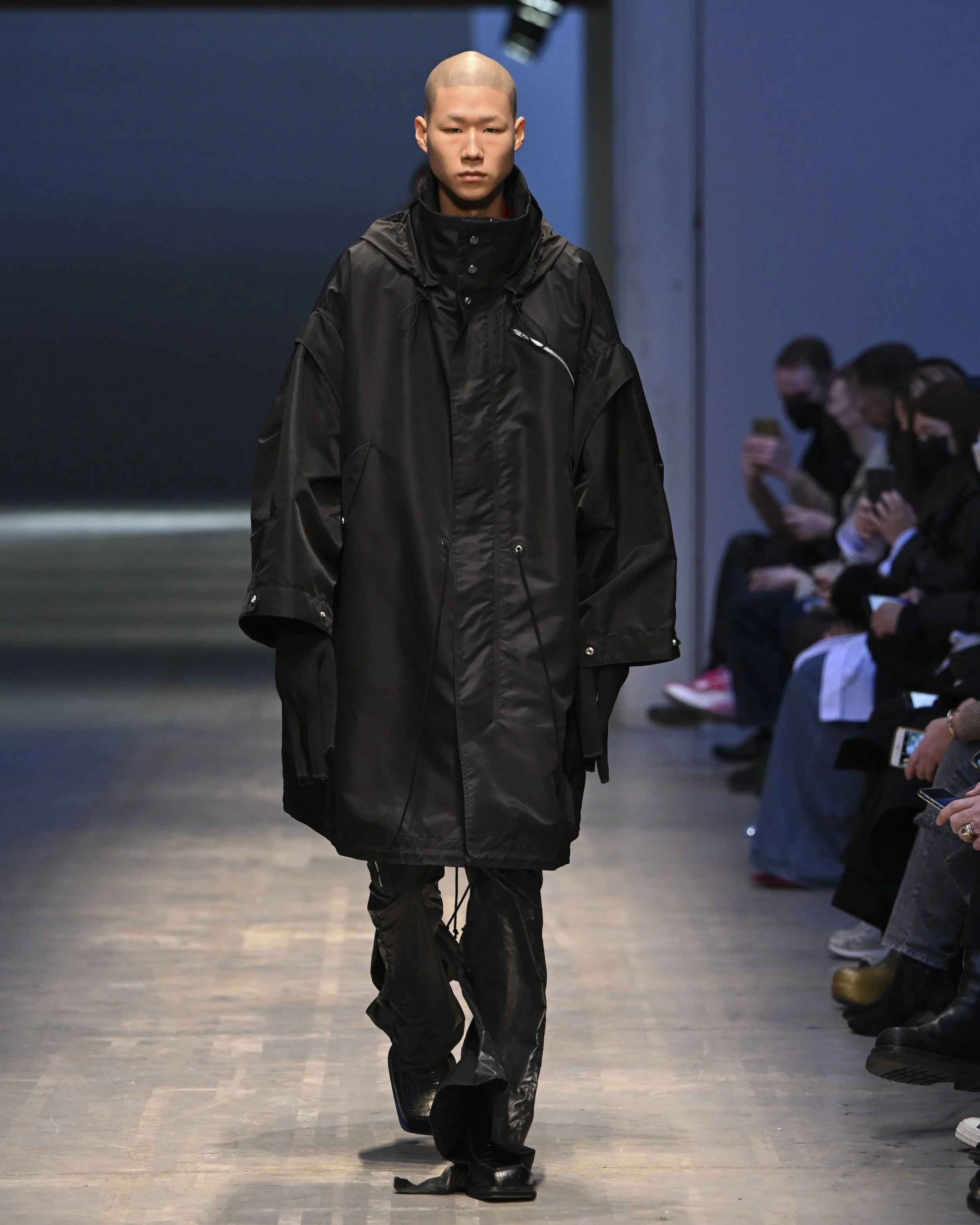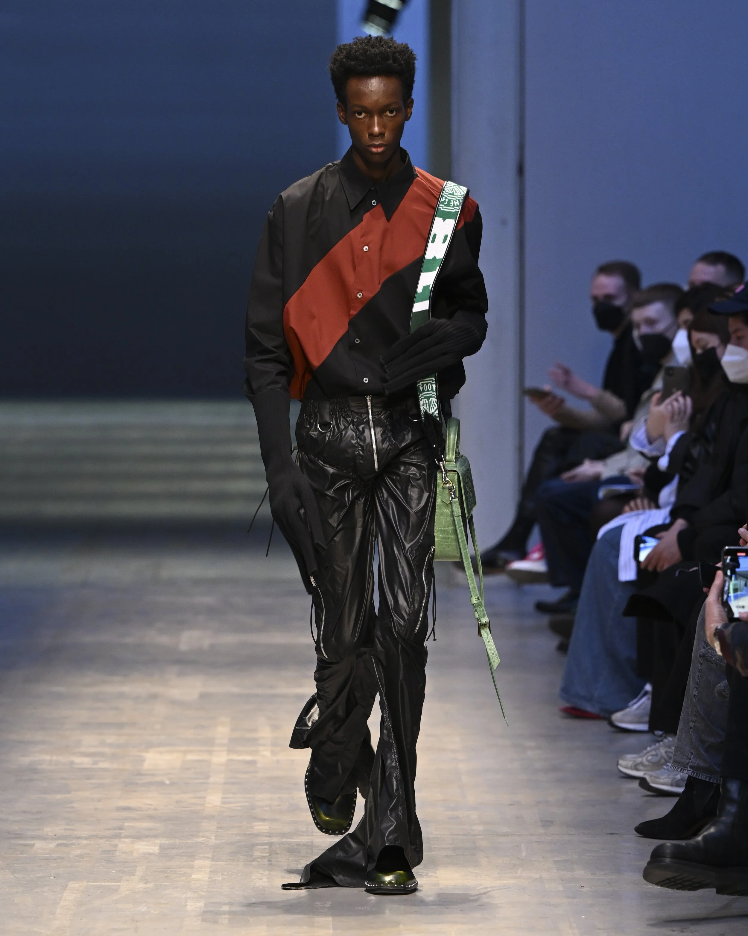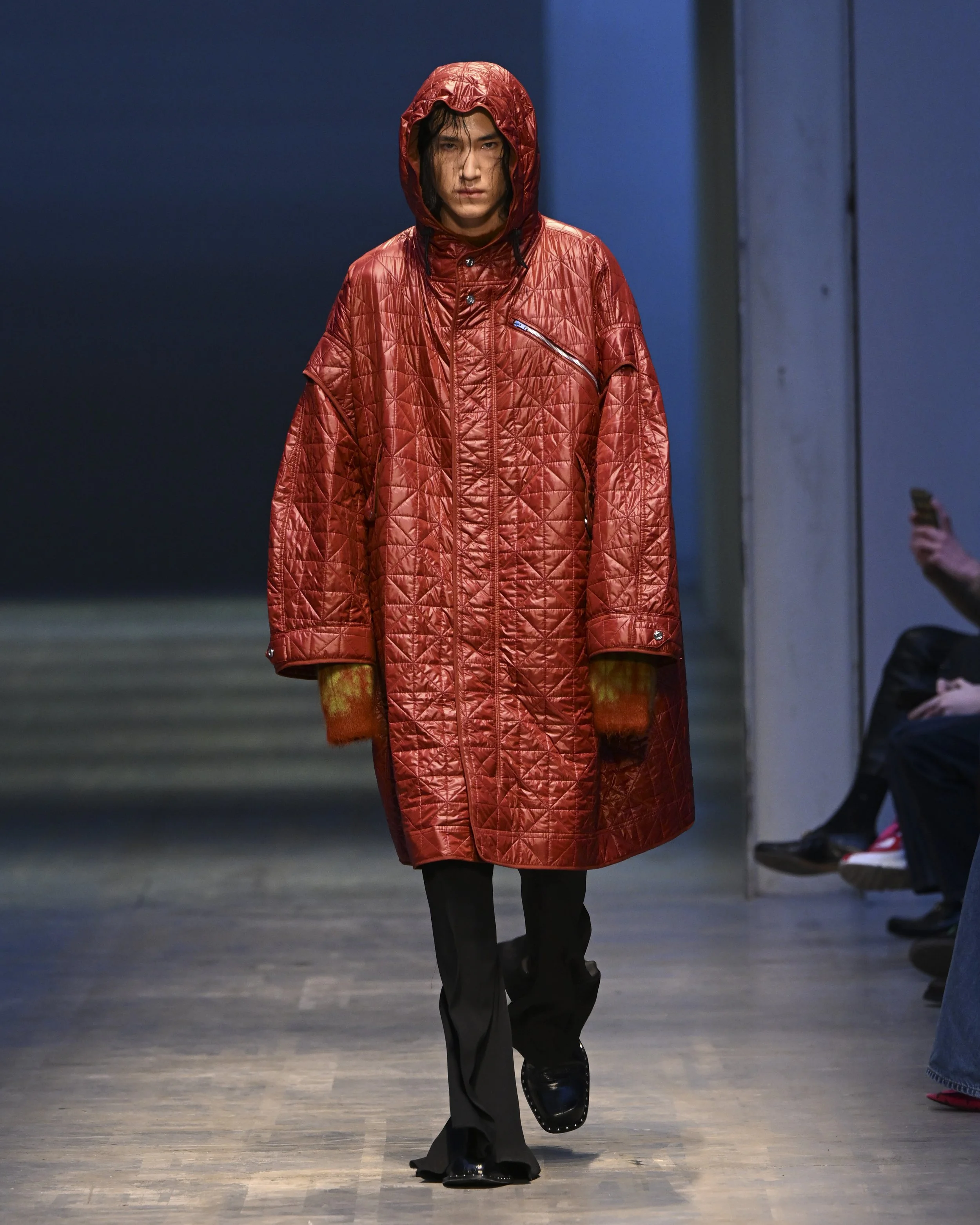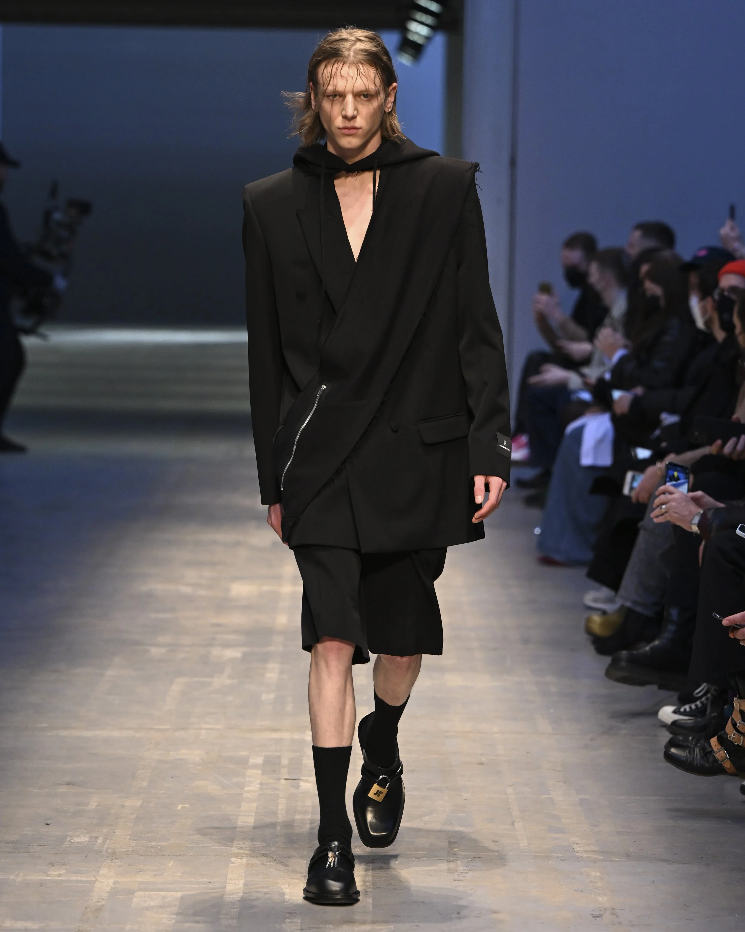 Mystery, rebellion and deep fragility: this is what the British-Italian duo JORDANLUCA delivered on Saturday in Milan during their AW22 show. Walking down to a harrowing soundtrack of love and betrayal, the clothes completed the story of transforming heartbreak into love towards one’s self. Burnished black leather jackets in oversized silhouettes, flared denim with jewelled brooches fixed at the rips and dramatically oversized fingerless gloves all brought the sensation for anger and seduction into one — the type of love that makes you go crazy.
