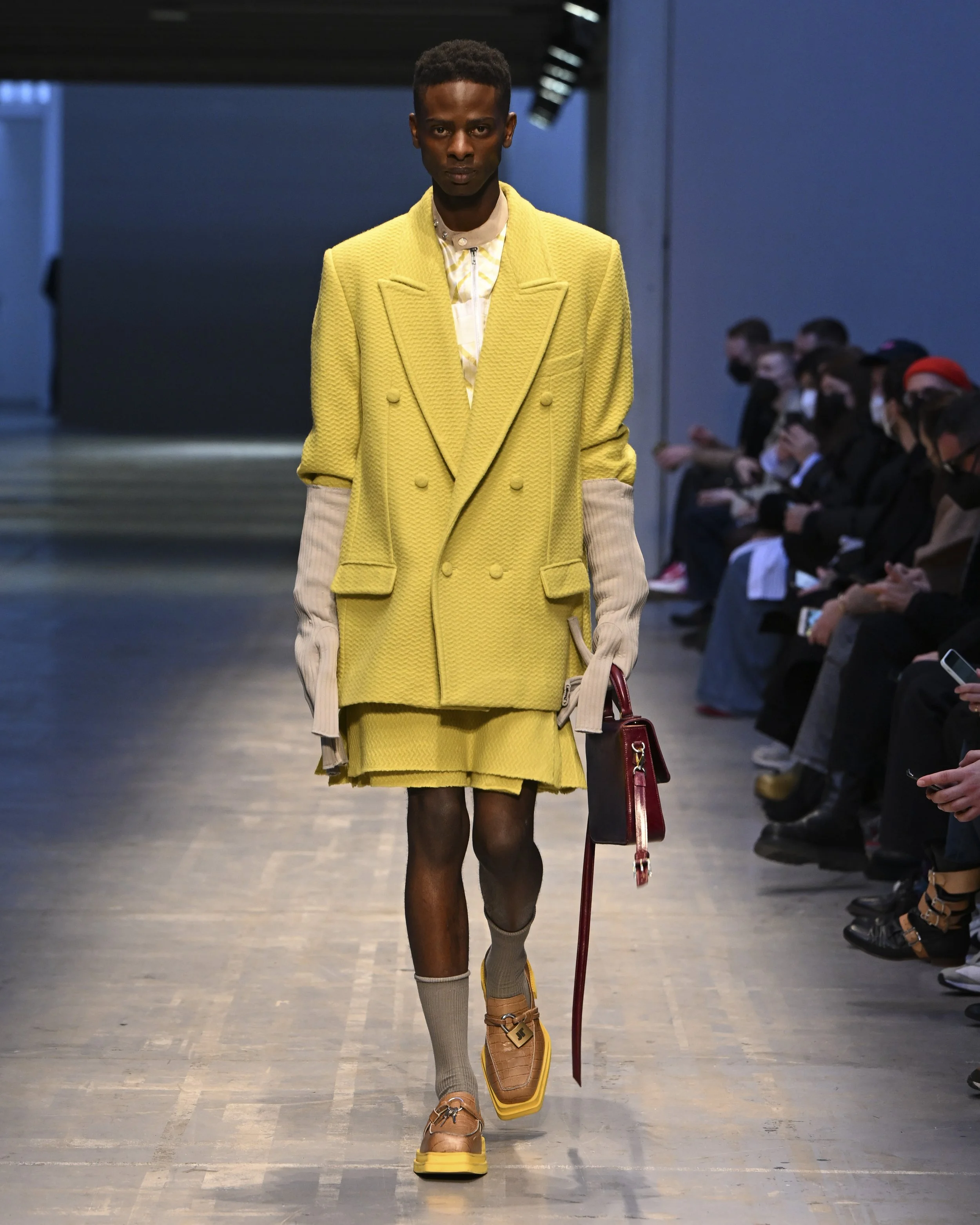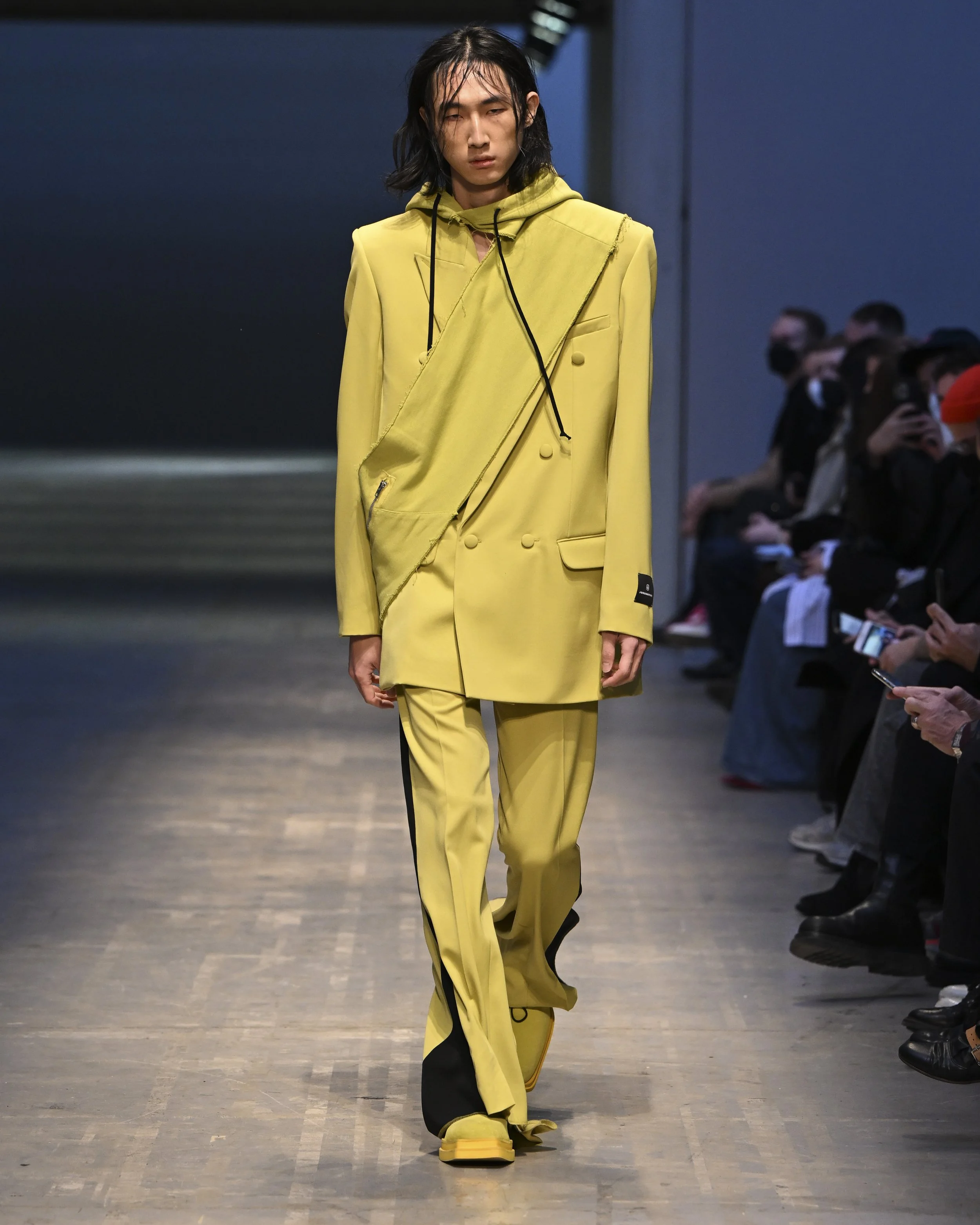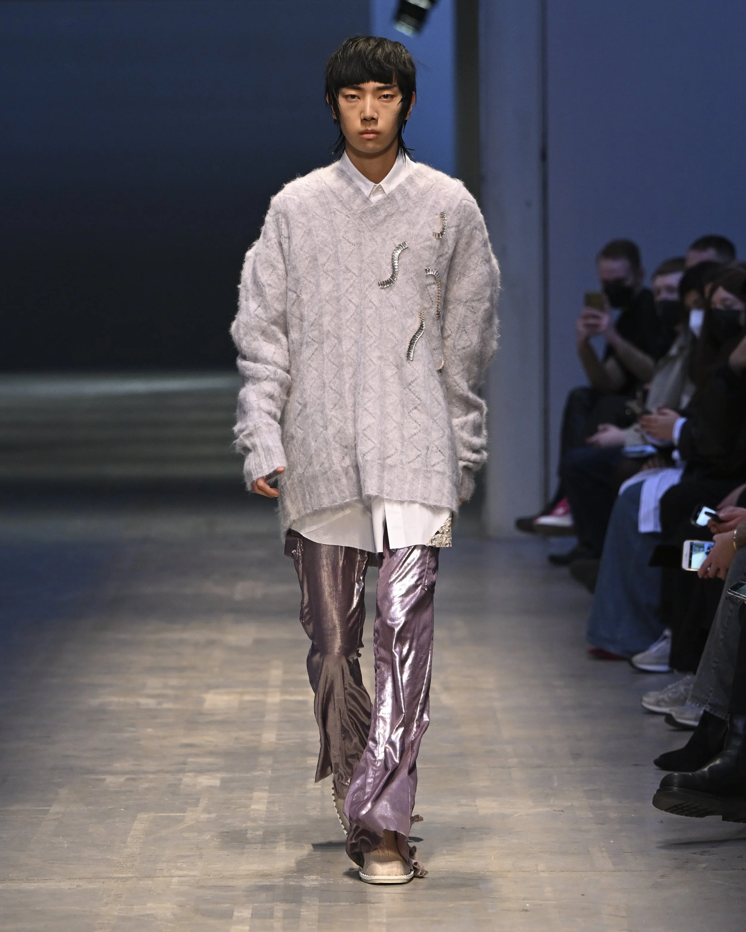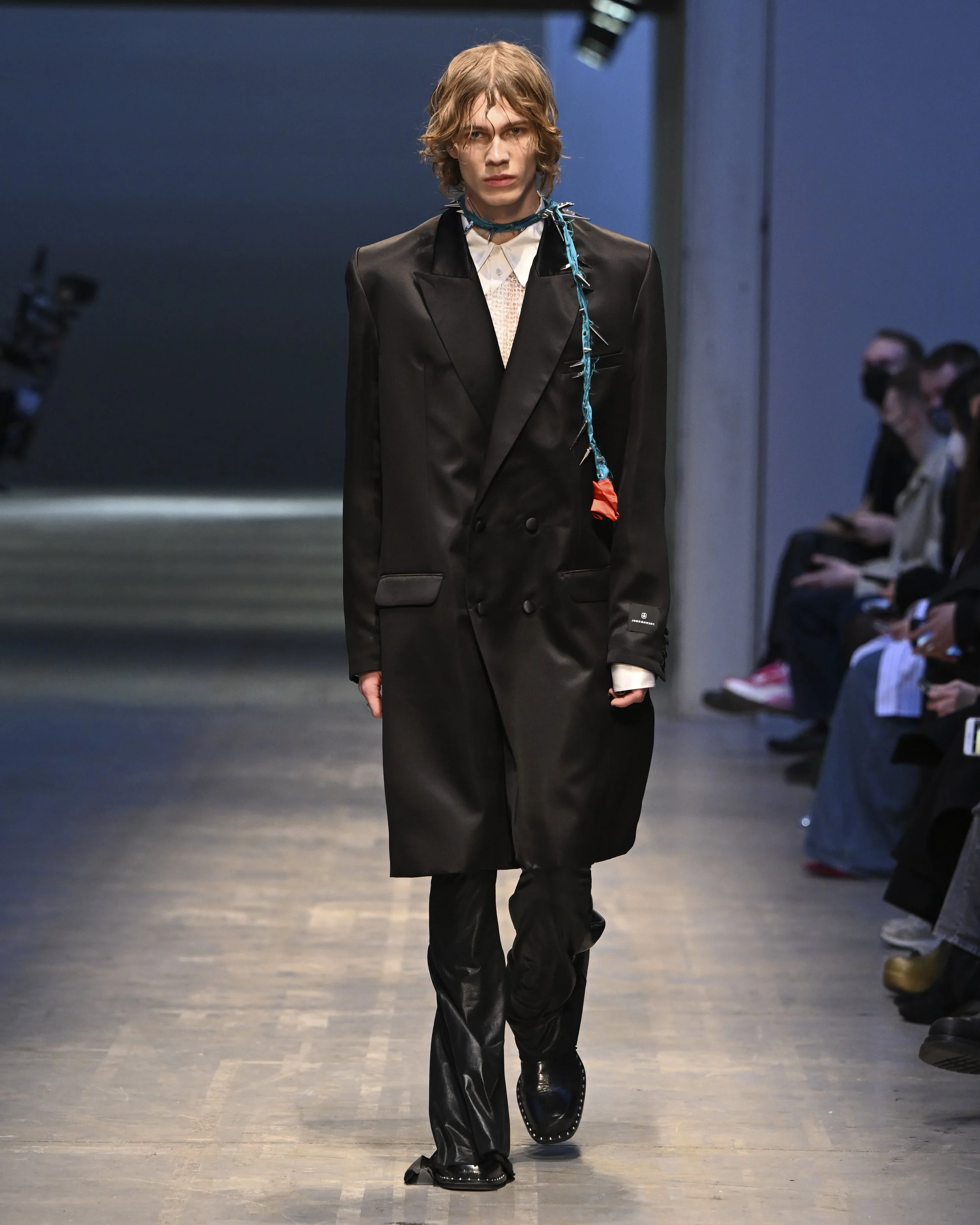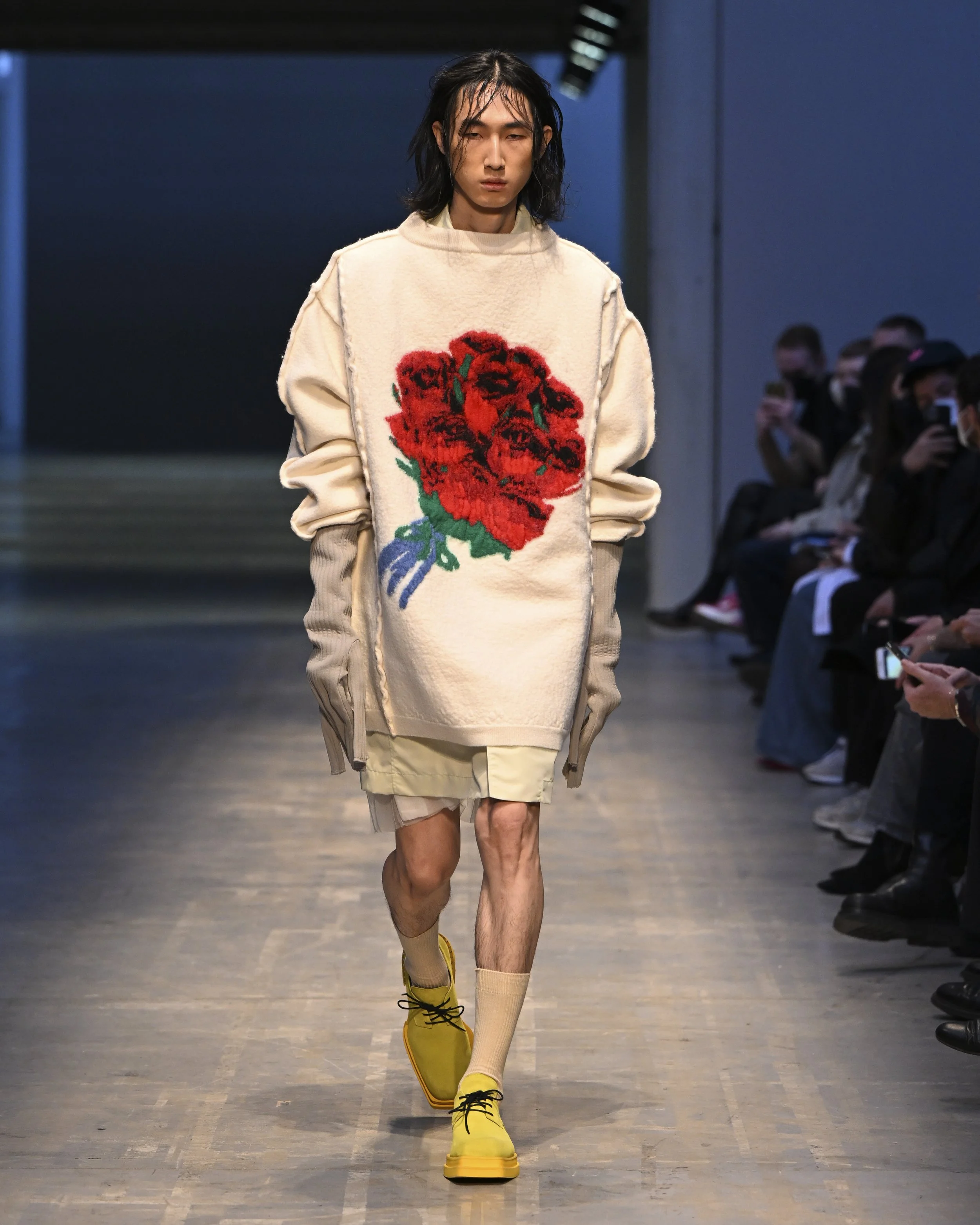 Expressing backstage, one half of the designer duo Luca Marchetto told the story of how they were inspired by magpies, their flight and the grace of their movement. Such can be seen especially in the chartreuse tailoring – with detail to the elongated sleeves and trousers – that flow with power and gentle fluidity. Contrasting to that, spiked scarves finished with folded silk red roses further highlight the radiating rage within love, almost like a prick from the sweetest rose. Sartorial rock n’ roll is another highlight of the collection as the oversized and stretched trouser finishes gave crash the system vibes mixed with boxy straight knitwear for good measure.