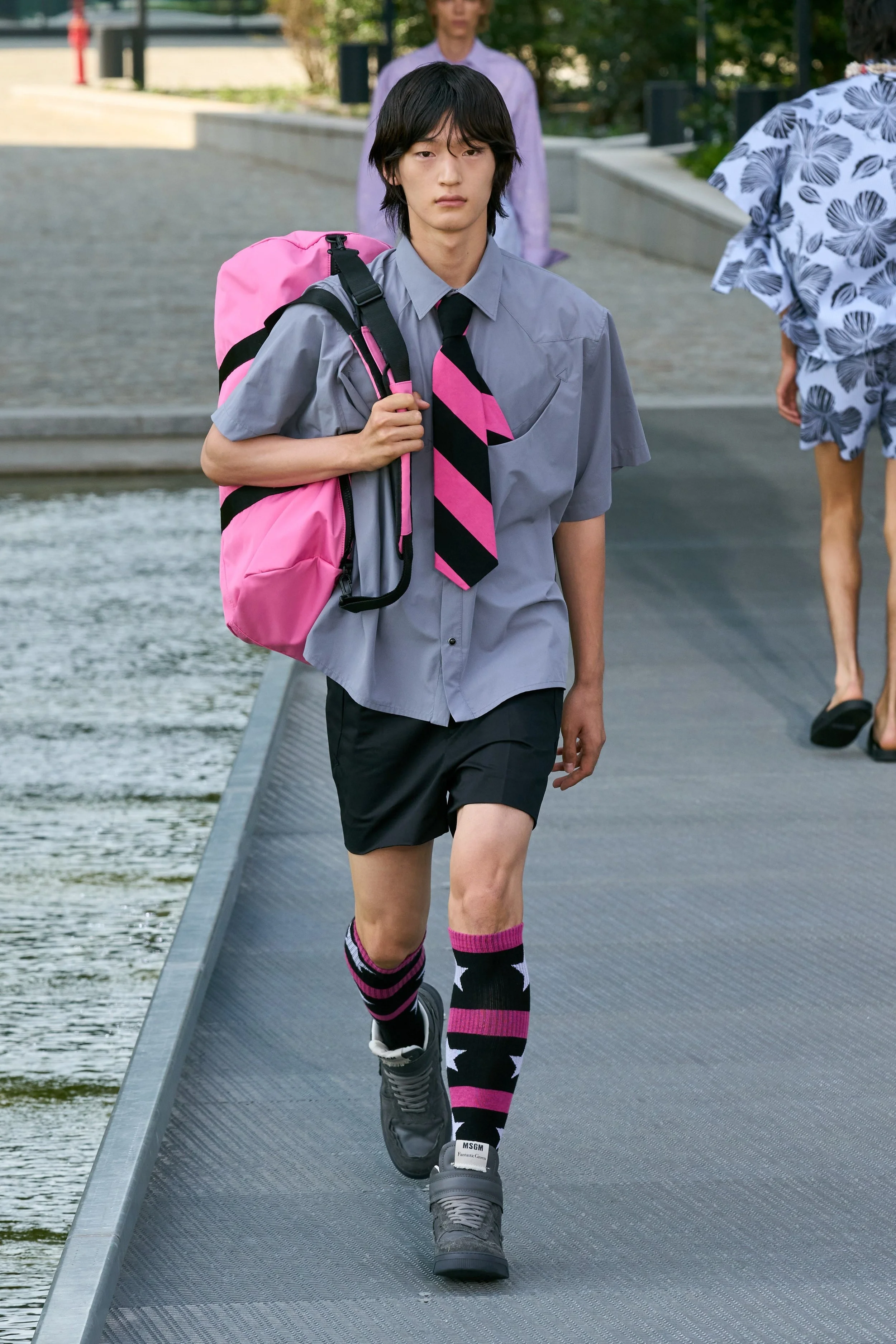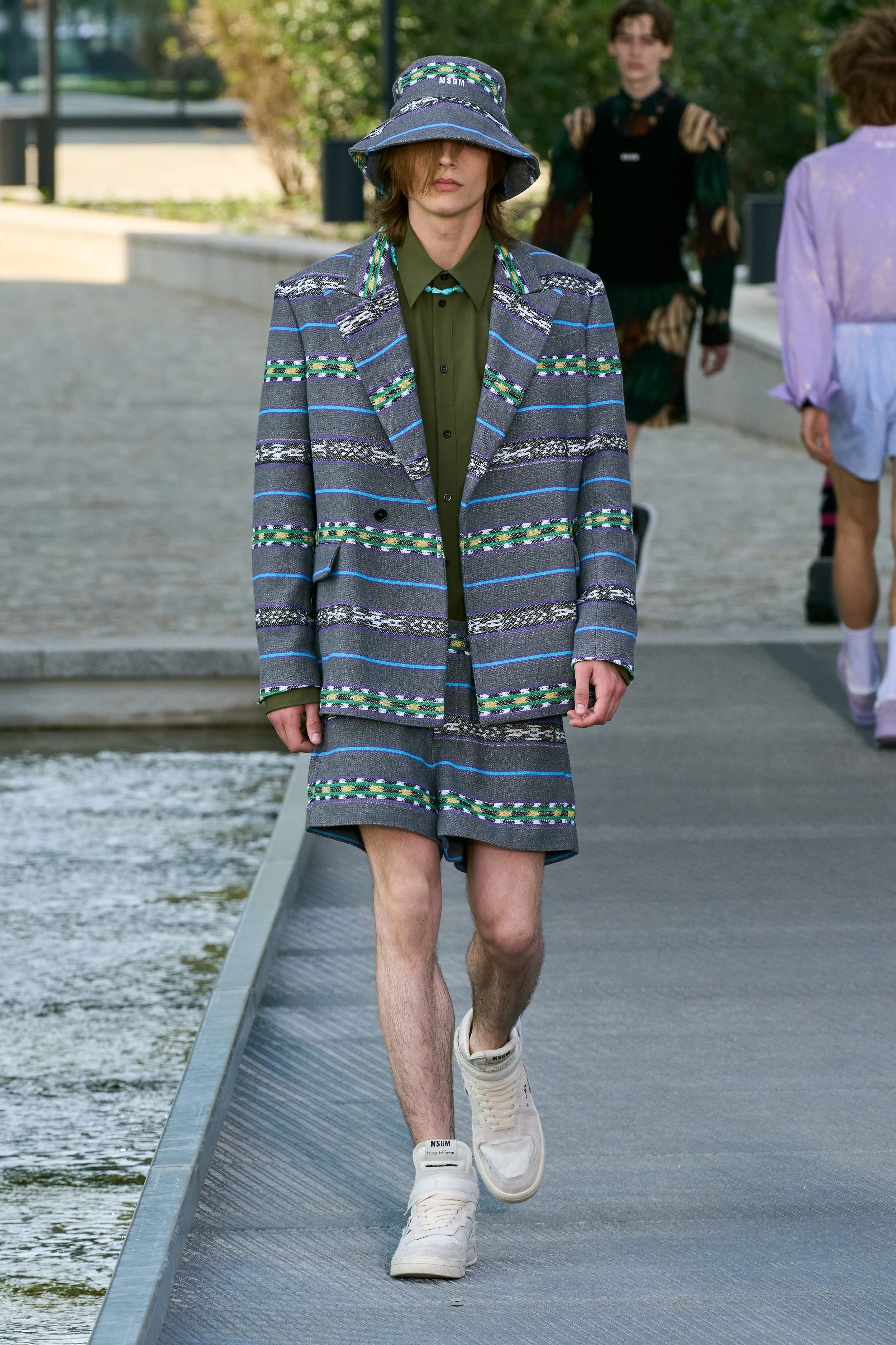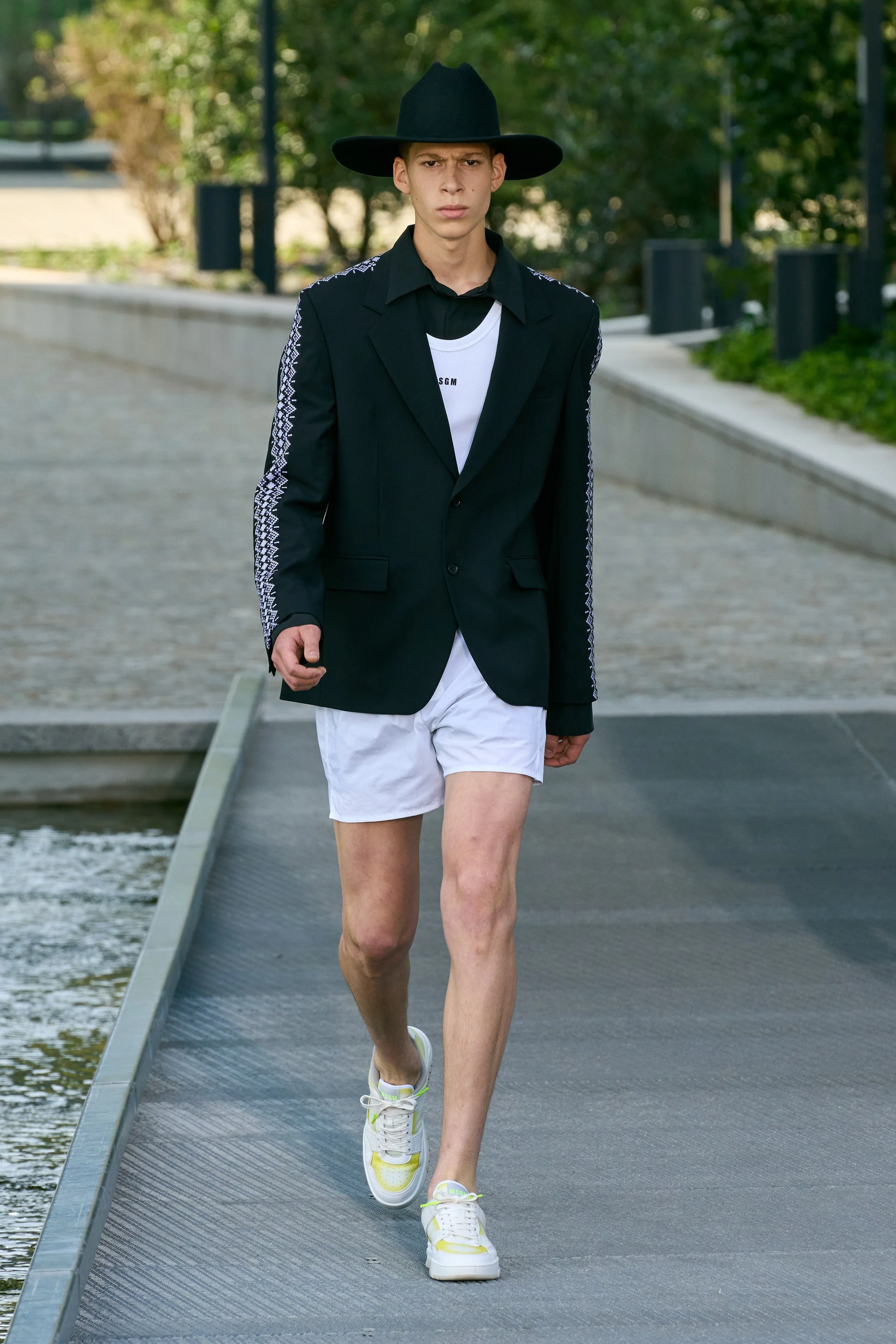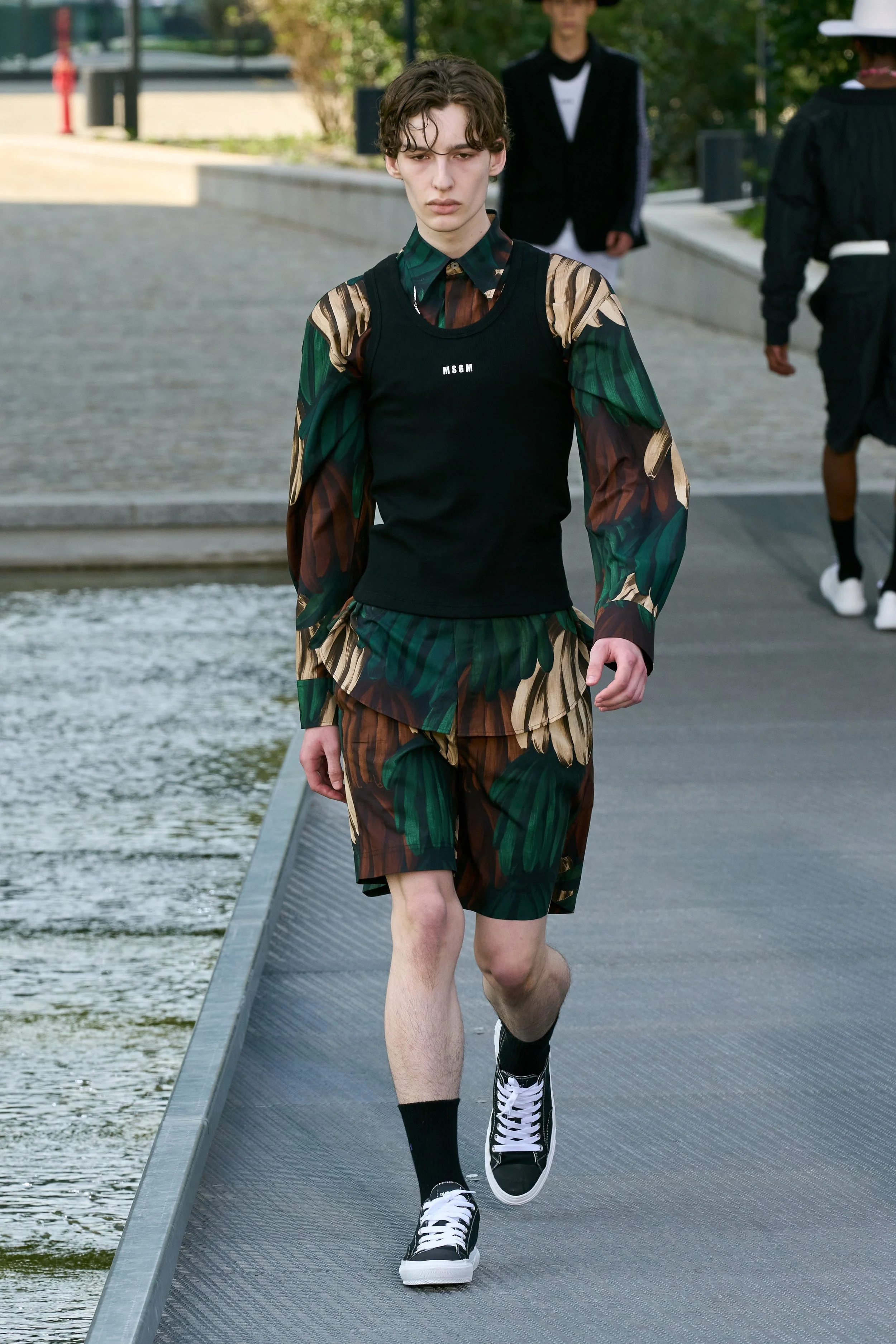 Stepping onto the concrete courtyard of Milan’s newest neighbourhood, models walked across the reflective water basin, out into the open to the mischievous soundtrack of HBO’s brilliantly produced tv series White Lotus, which can also be seen as a parallel to the MSGM man - calm, collected and full of bliss and joy, with a dark and mysterious puzzling side, urging you to dig deeper.