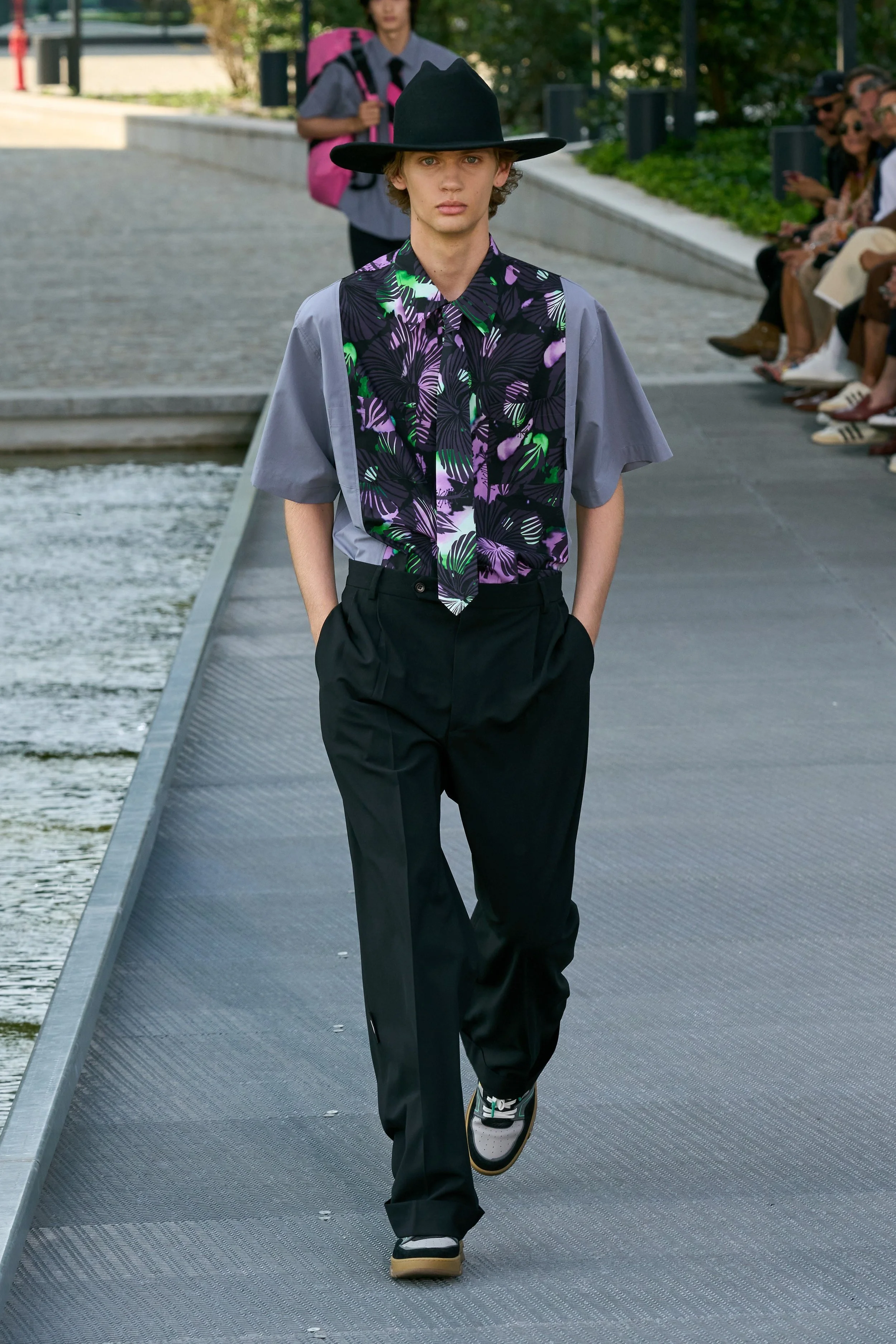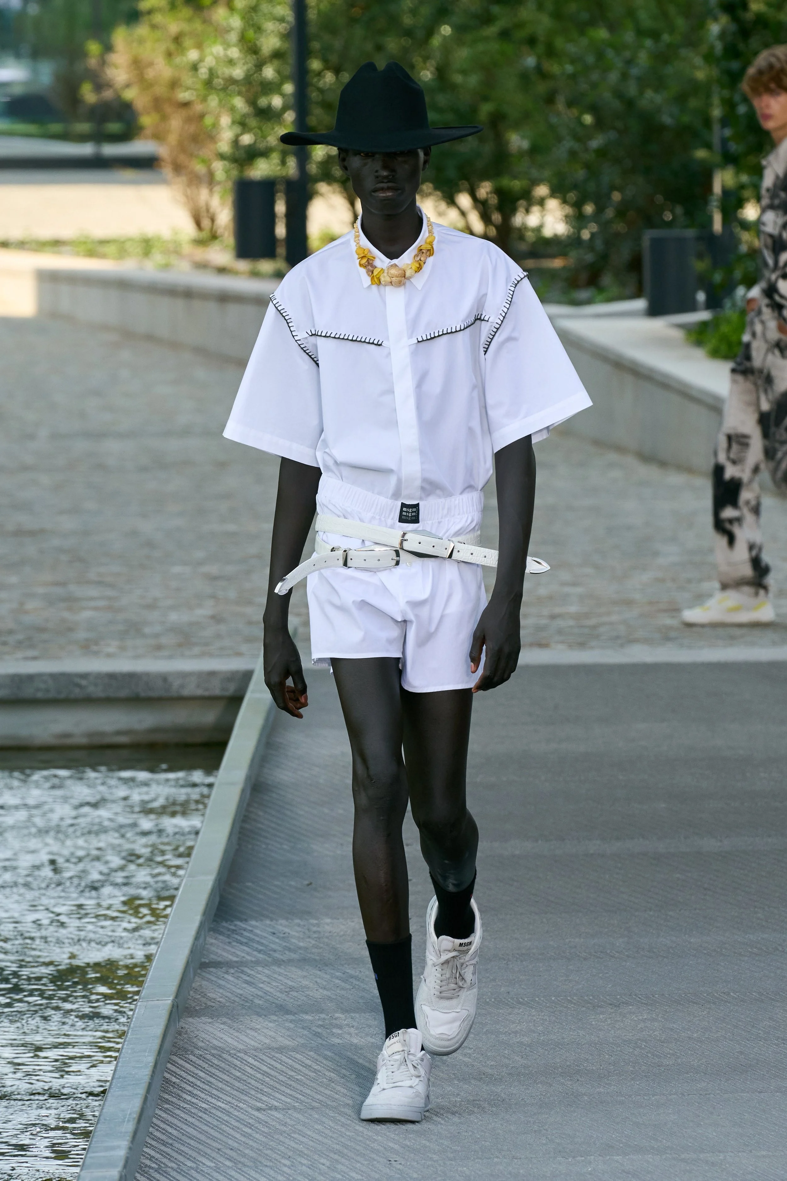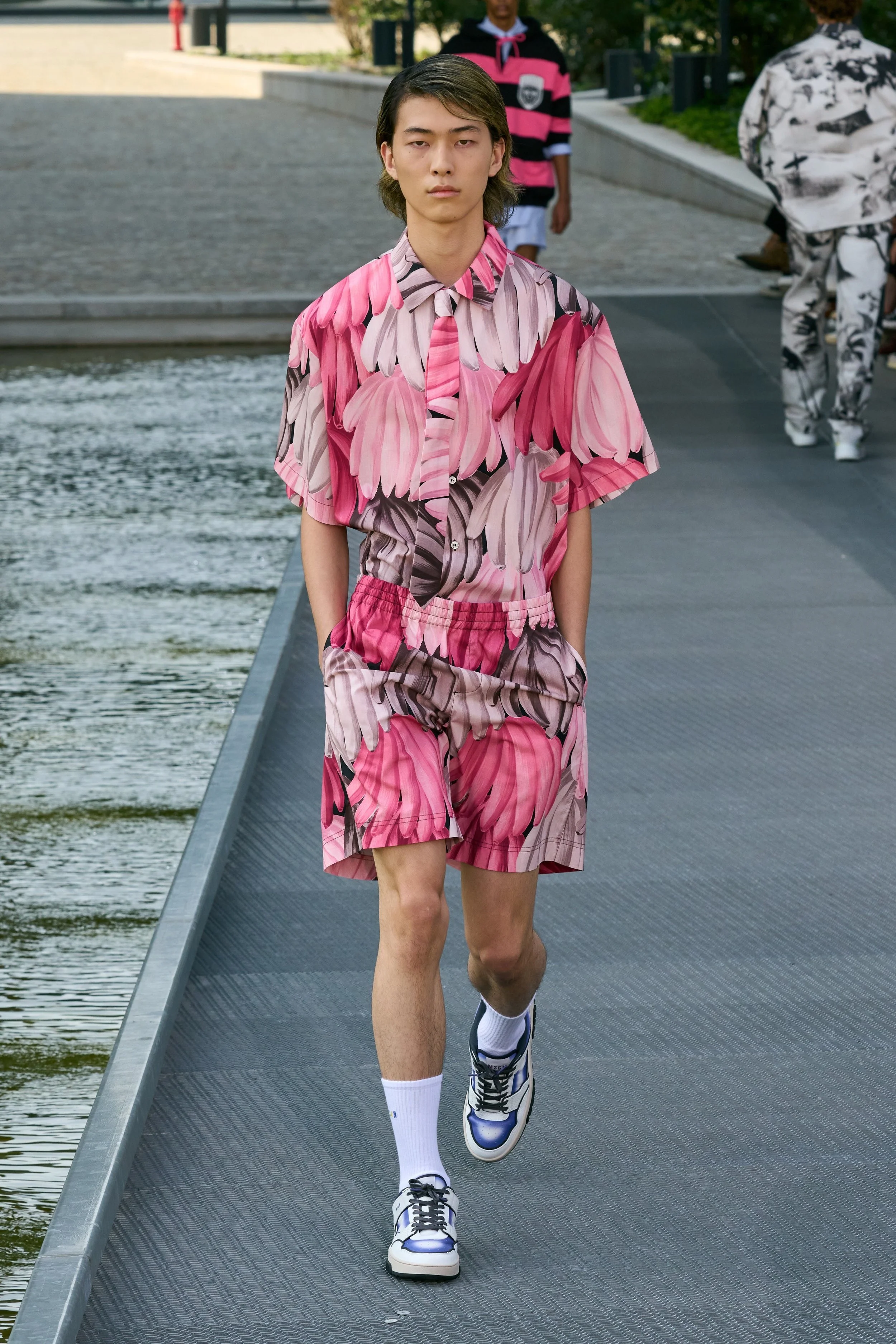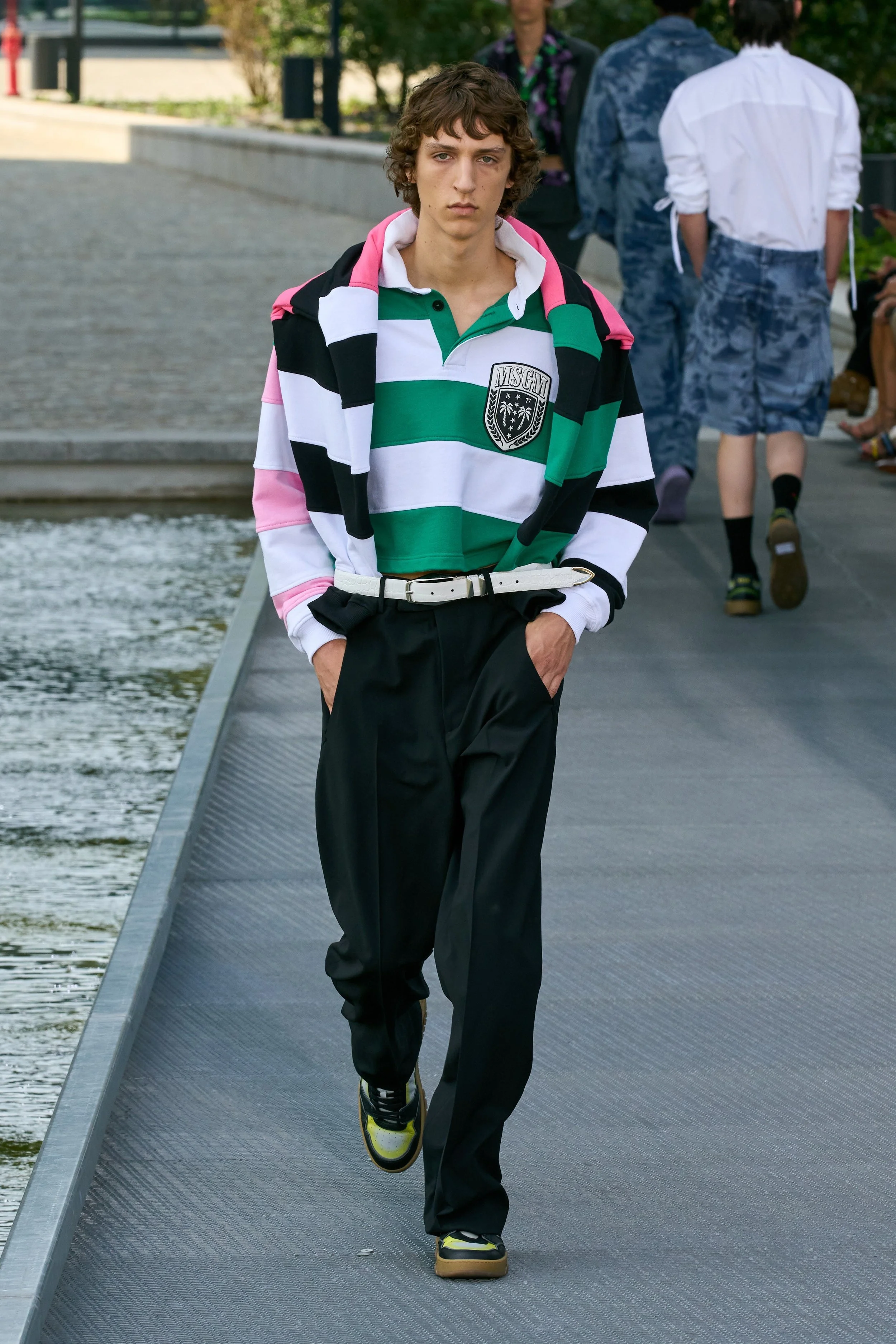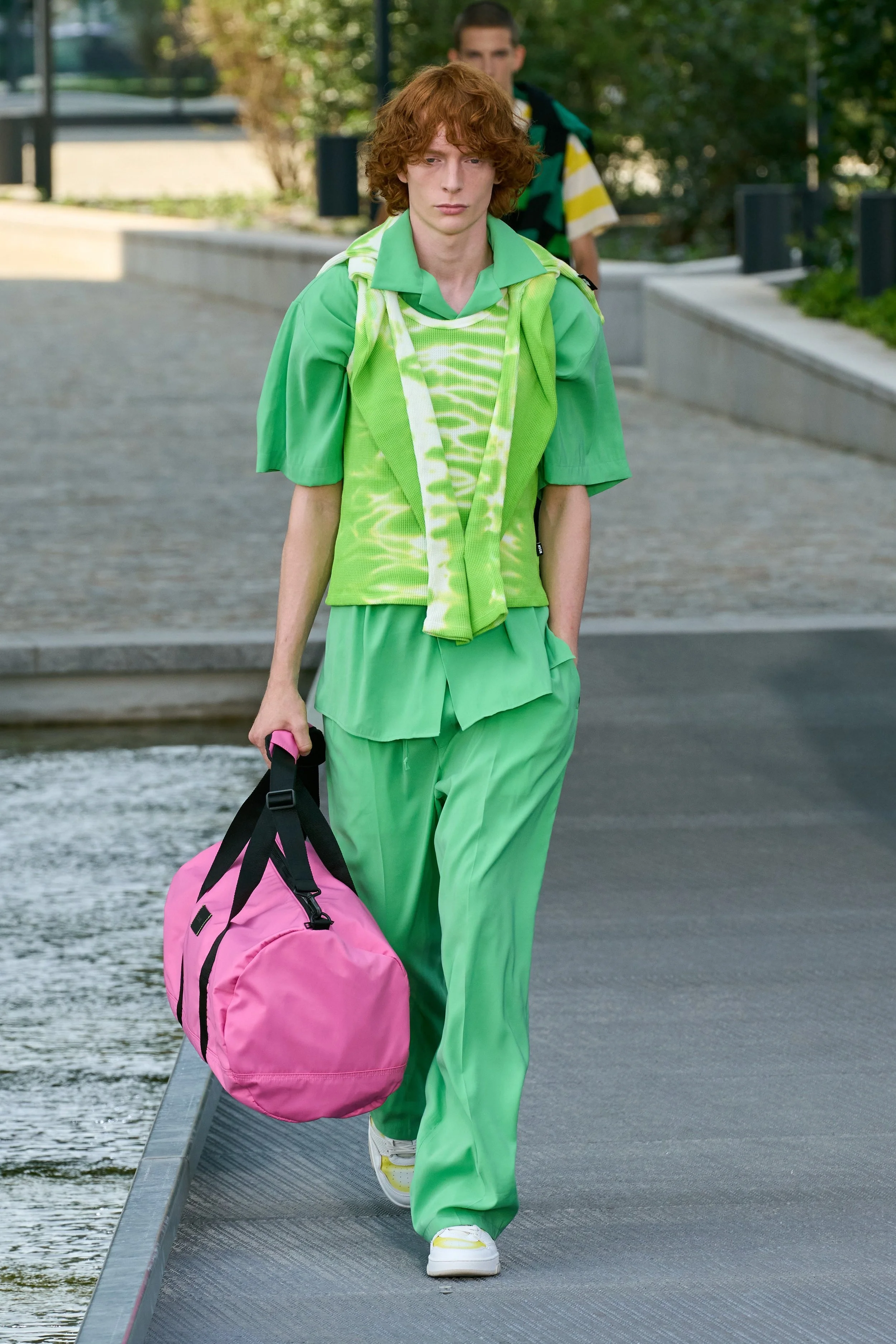 Stepping onto the concrete courtyard of Milan’s newest neighbourhood, models walked across the reflective water basin, out into the open to the mischievous soundtrack of HBO’s brilliantly produced tv series White Lotus, which can also be seen as a parallel to the MSGM man - calm, collected and full of bliss and joy, with a dark and mysterious puzzling side, urging you to dig deeper.