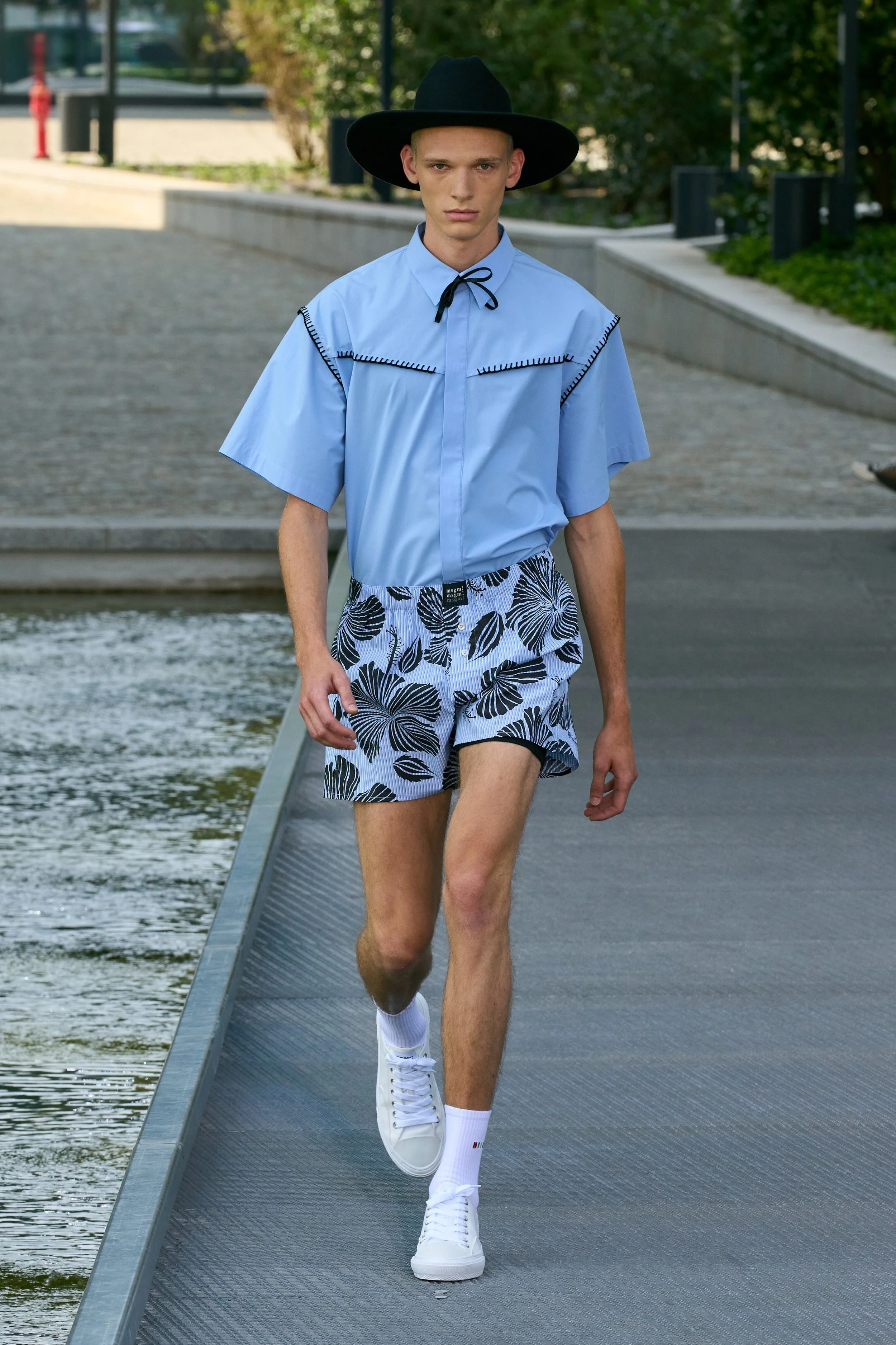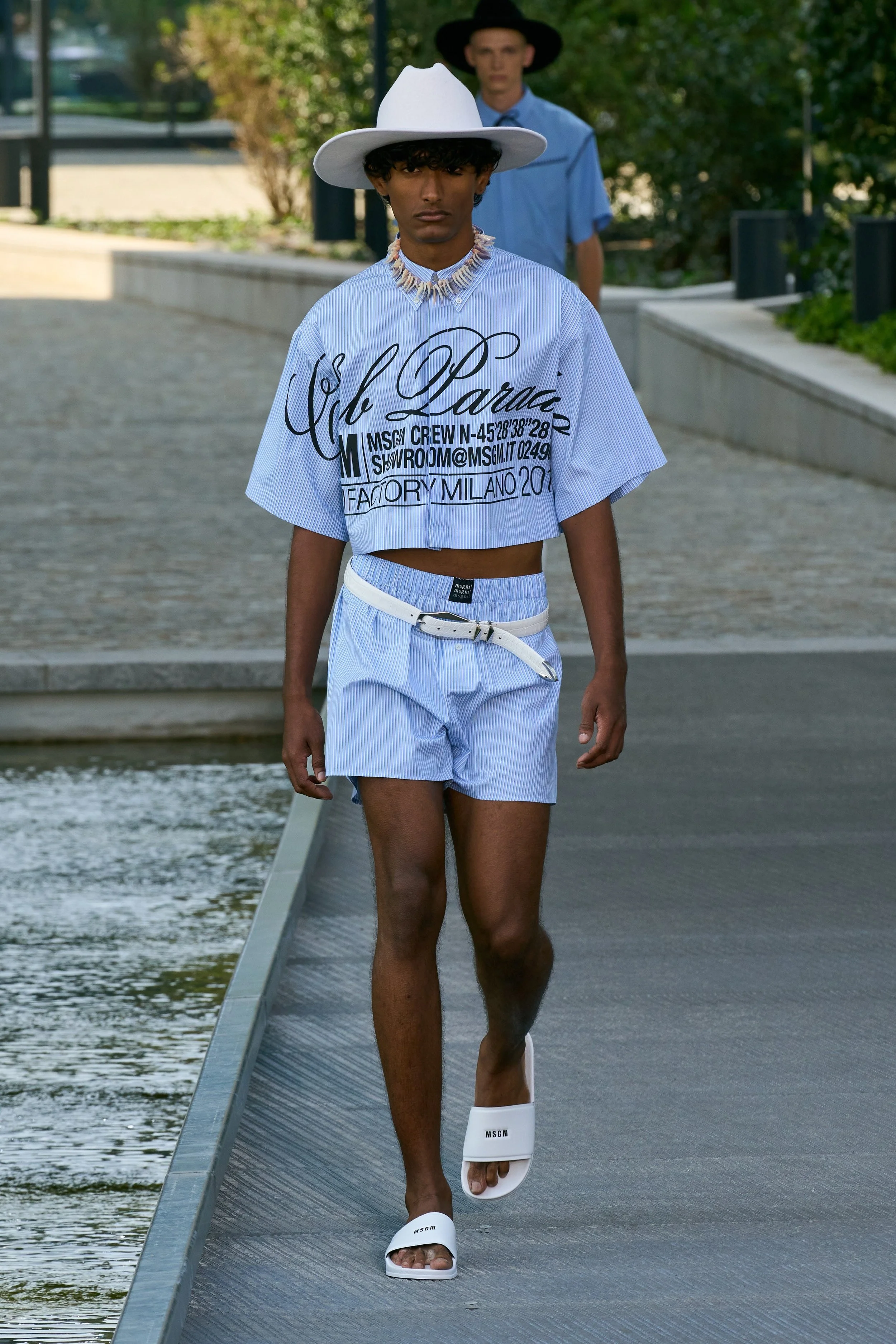 The collection saw a restructured introduction of holiday silhouettes dropped onto workwear fabrics and patterns such as the light blue dropped shoulder shirt, finished with black lacing across the pockets and shoulder seams. Striped boxer shorts were finished with a heavy leather belt, whilst cropped shirts sat underneath wide-brim hats for an island-meets-the-rodeo feeling of exploration. The love for uniform dressing was taken into its own relaxed spin, with dropped, boxy silhouettes which were eased, yet defined, finished with a touch of secret. Furthermore, the collection saw traditionally preppy colourful stripes subverted into hoodies and double ties, combined with dropped trousers, skewing you away from tradition and giving you a carte blanche to observe and ponder upon the story behind MSGM island’s residents - who are they and how did they end up here?