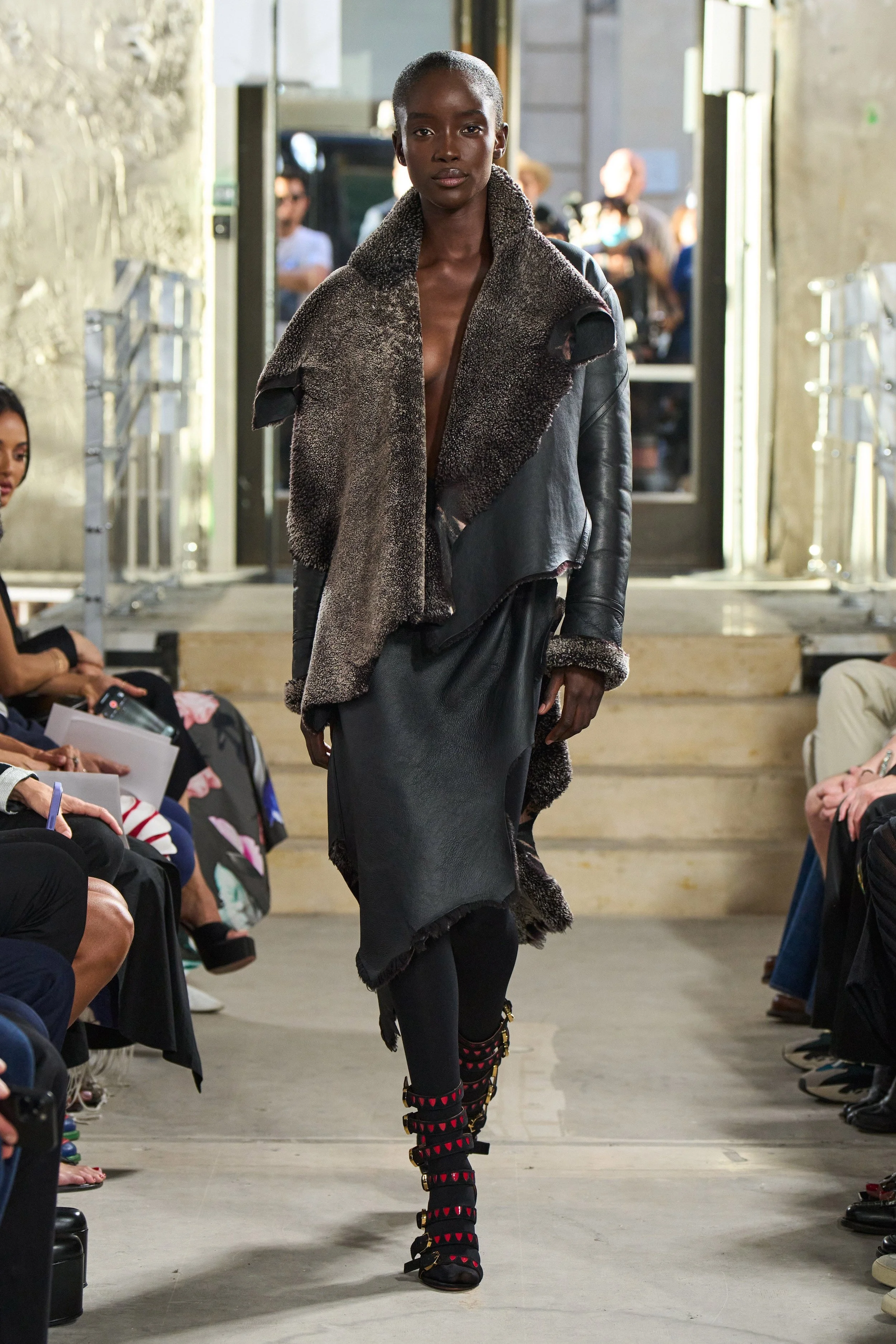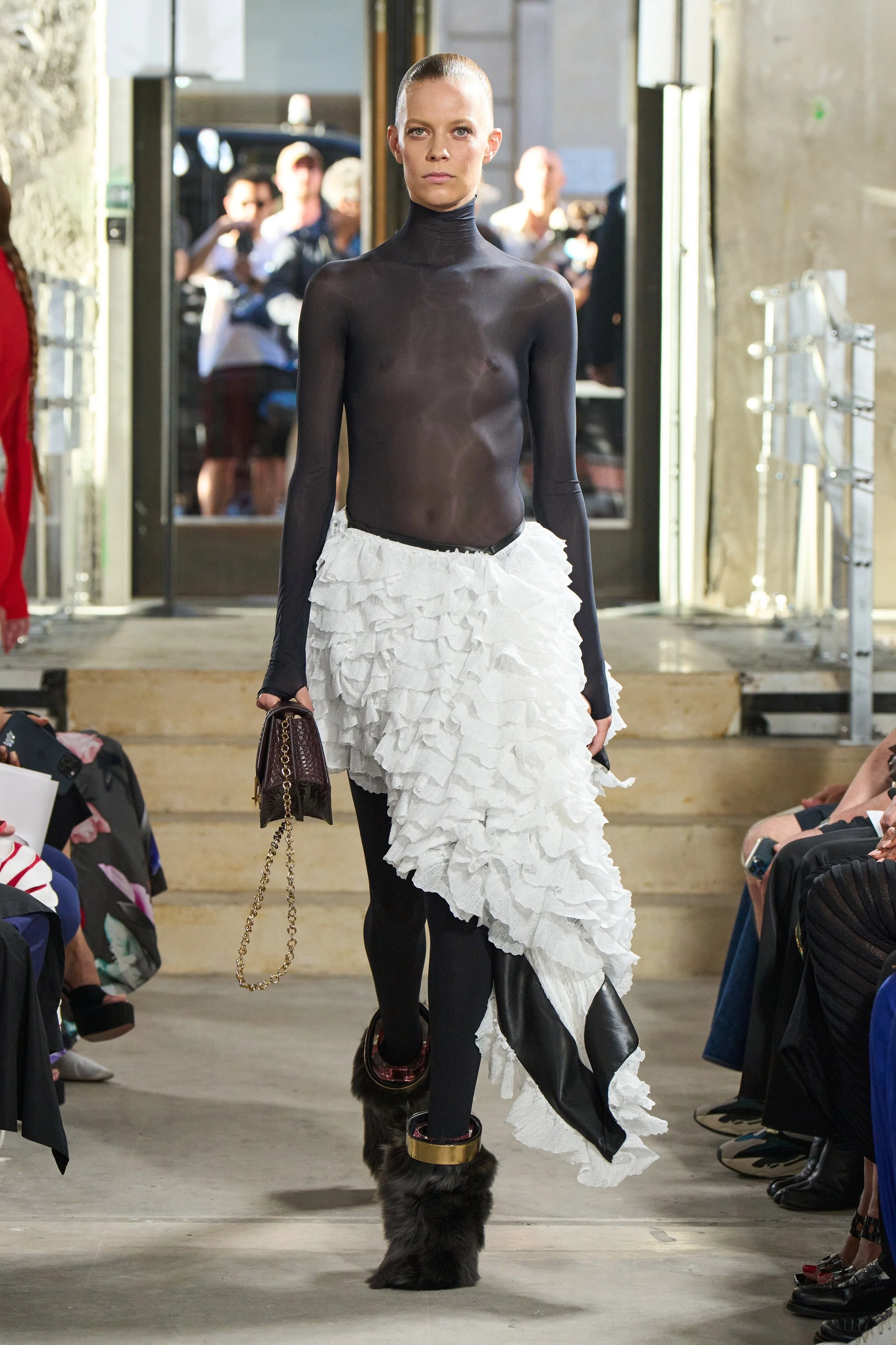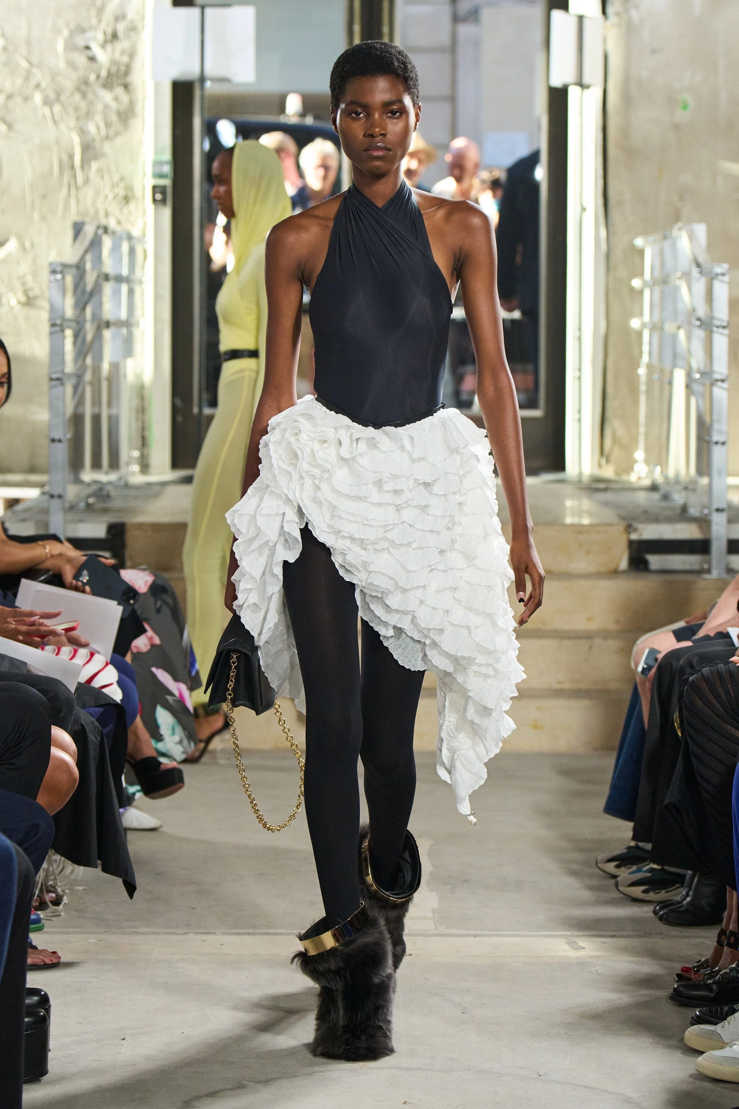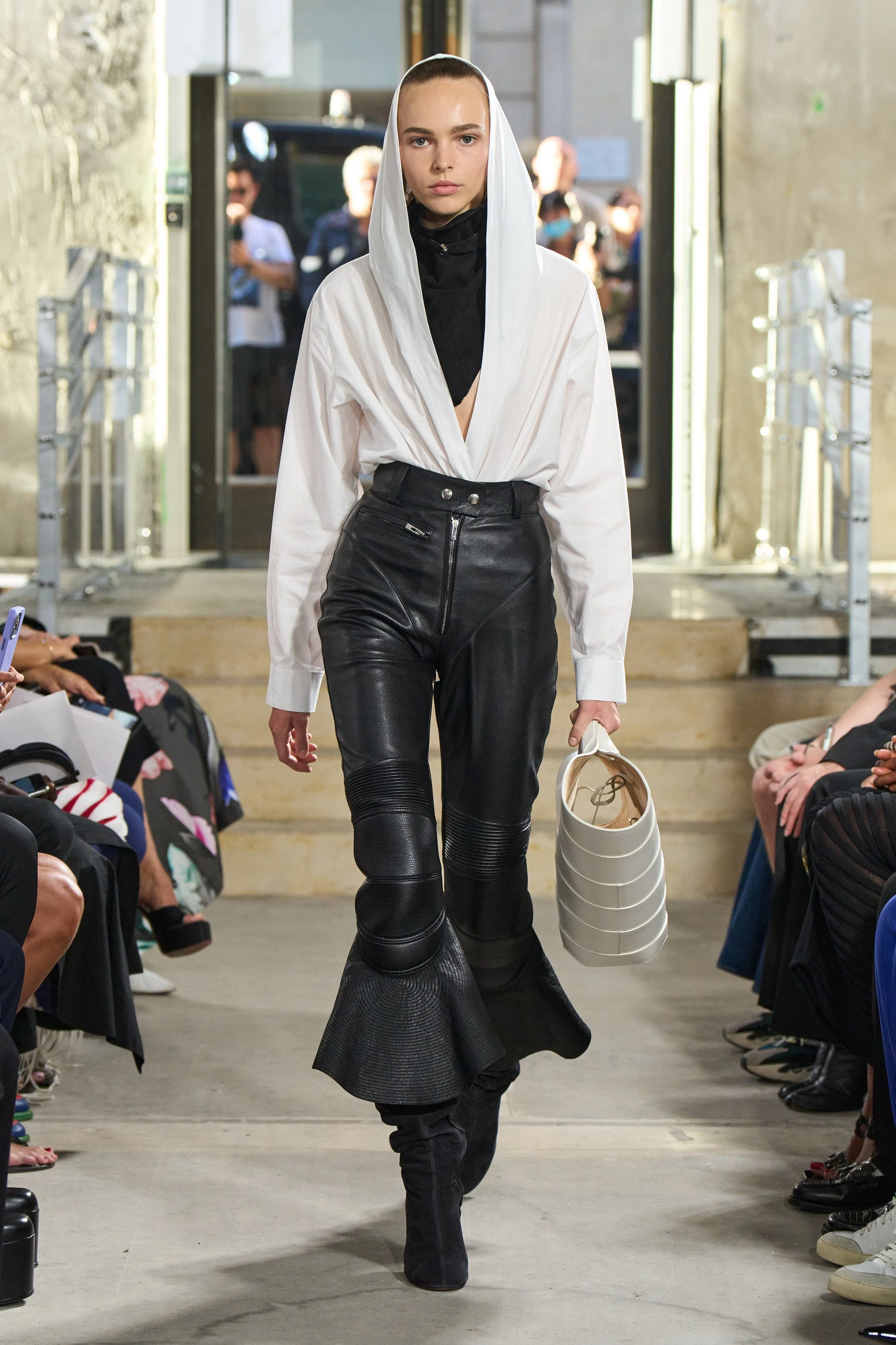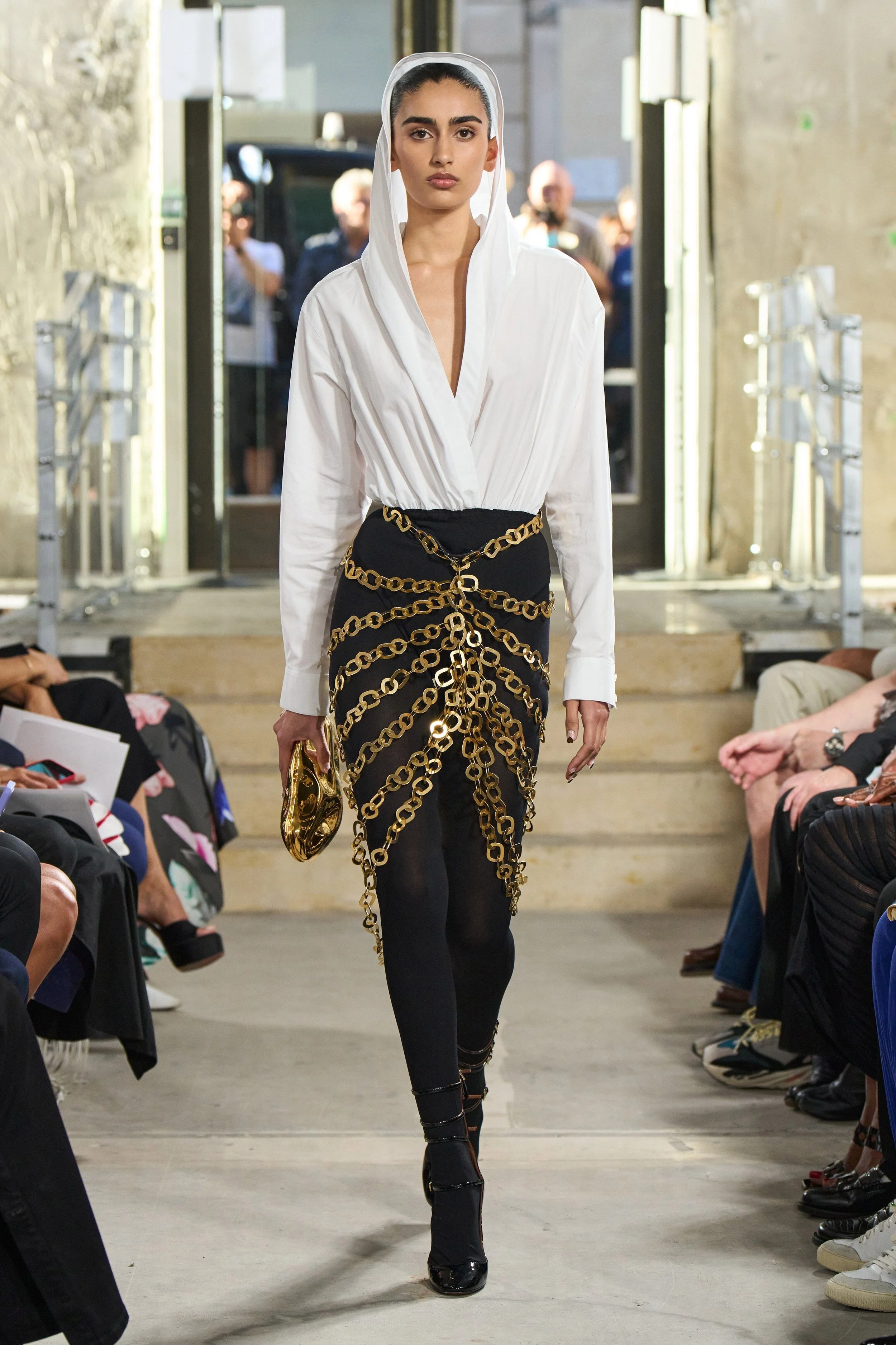 Opening the doors to the future Alaïa Saint-Honoré boutique, Pieter Mulier unravelled the rebellious beauty of his mind, and the strong Alaïa DNA, merging together in synchronicity. Wanting to play further upon power-sensual dressing, Mulier opened the show with a single white pearl nipple piercing attached to an all-black catsuit, finished off with a chunky ankle cuff elongating into a perspex heel, letting the energy do all of the talking.