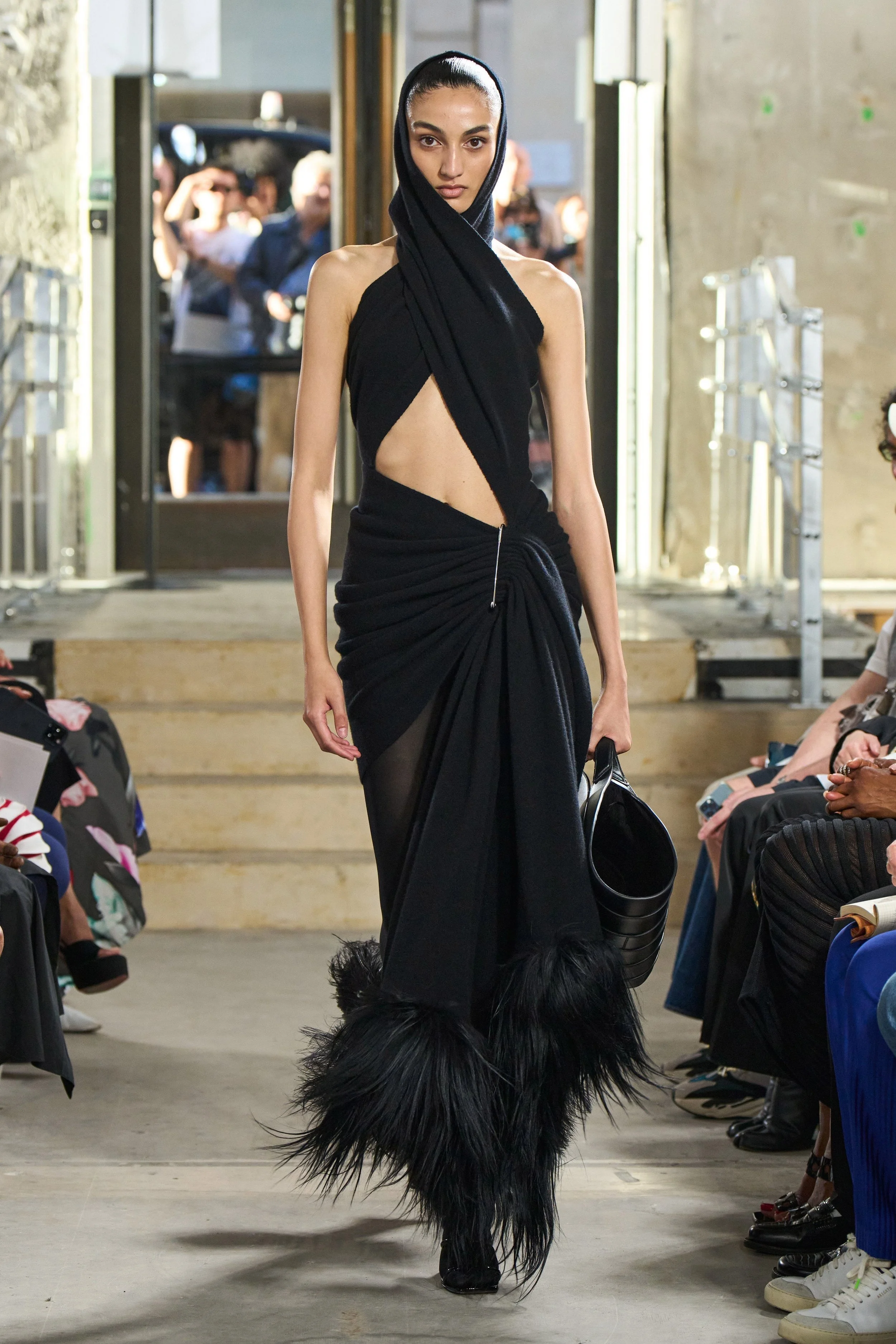 The collection further oversaw the joy of draping and ruching, something that the designer has begun analysing and experimenting more with, with a peculiar twist that wraps it all back to the 1980s and Azzedine Alaïa’s pioneership of celebrating women, crafting sculptures of confidence. Oversized, stacked pearl necklaces and protruding black feather heels were the touches of detail that sat atop draped inside-out denim skirts masterfully crafted to bring out the natural curves of the body. With Mulier’s work, the body is always the focal point of attention, whether in a meticulously structured oversized burgundy coat with gold finishing, or in an aqua light blue draped gown that protrudes upward into a black see-through bodysuit, one thing is clear - you are the main muse of your universe.
