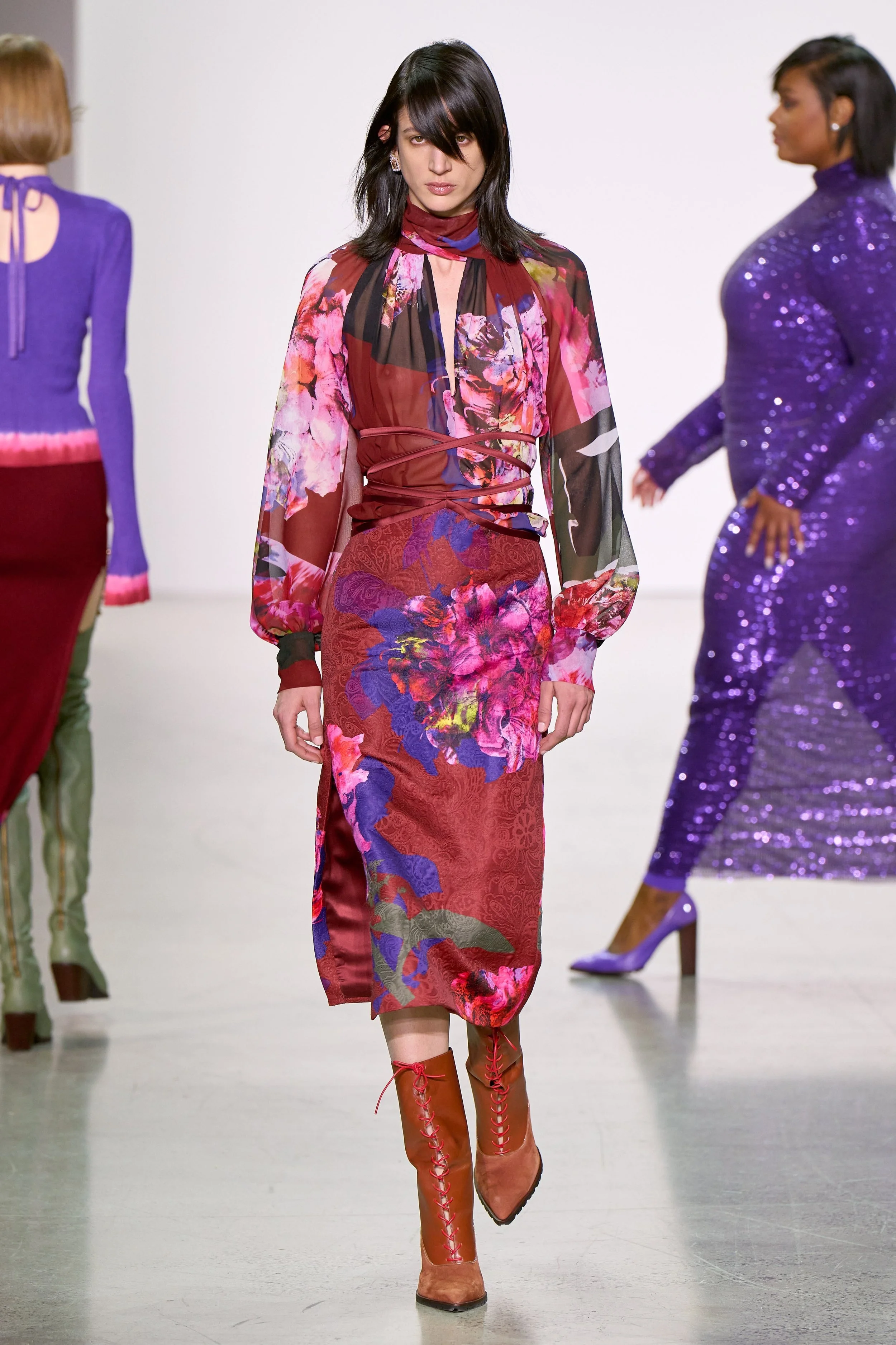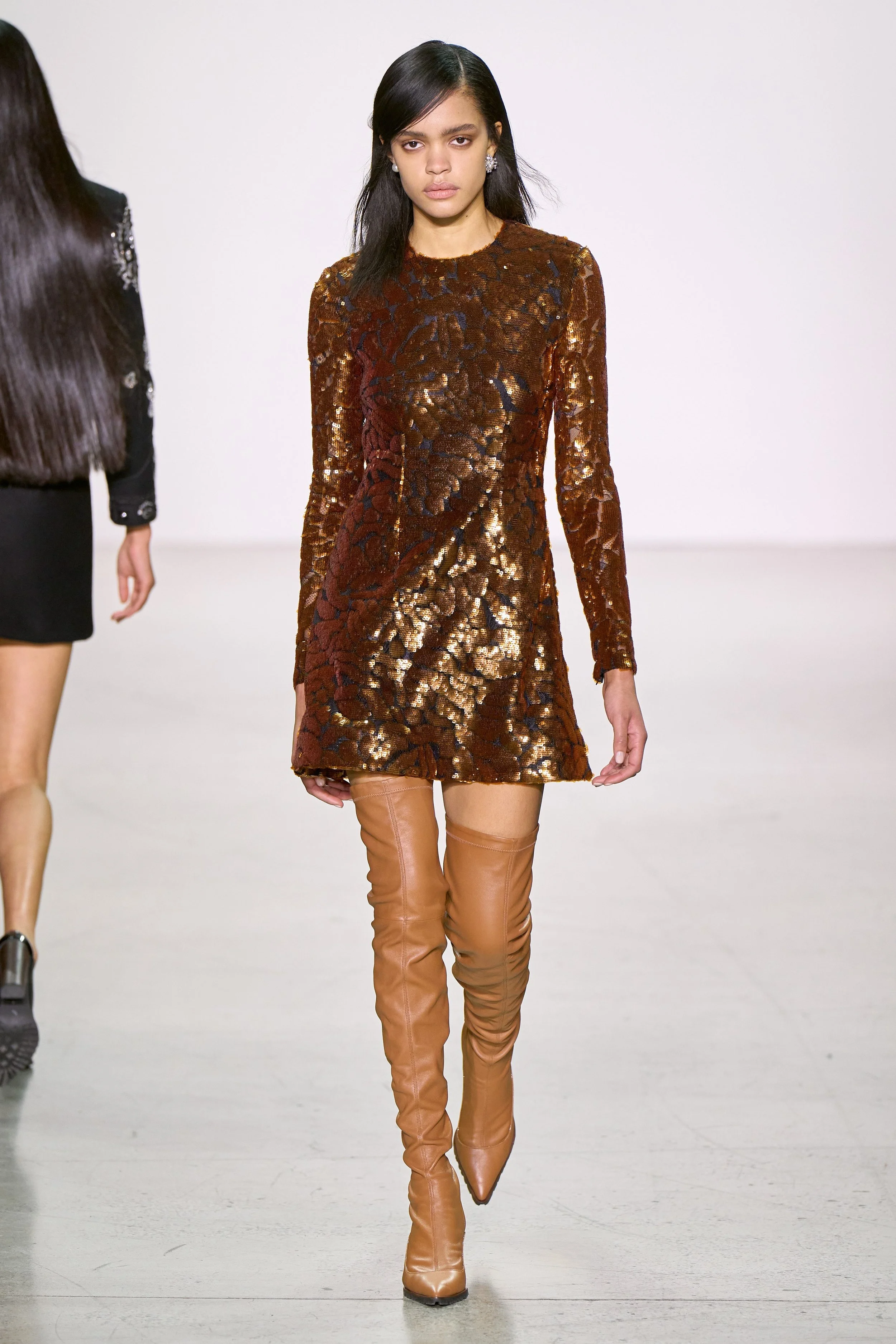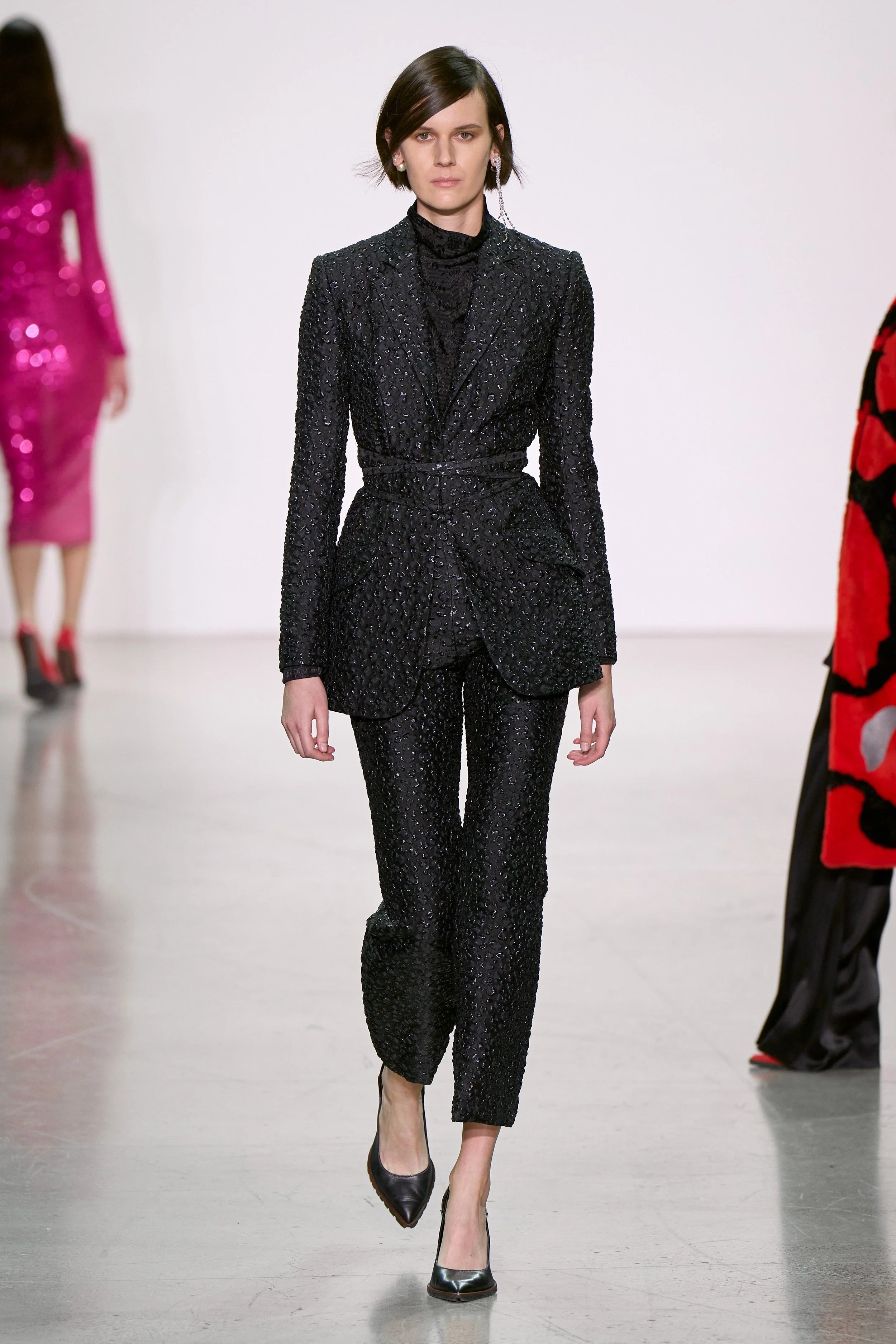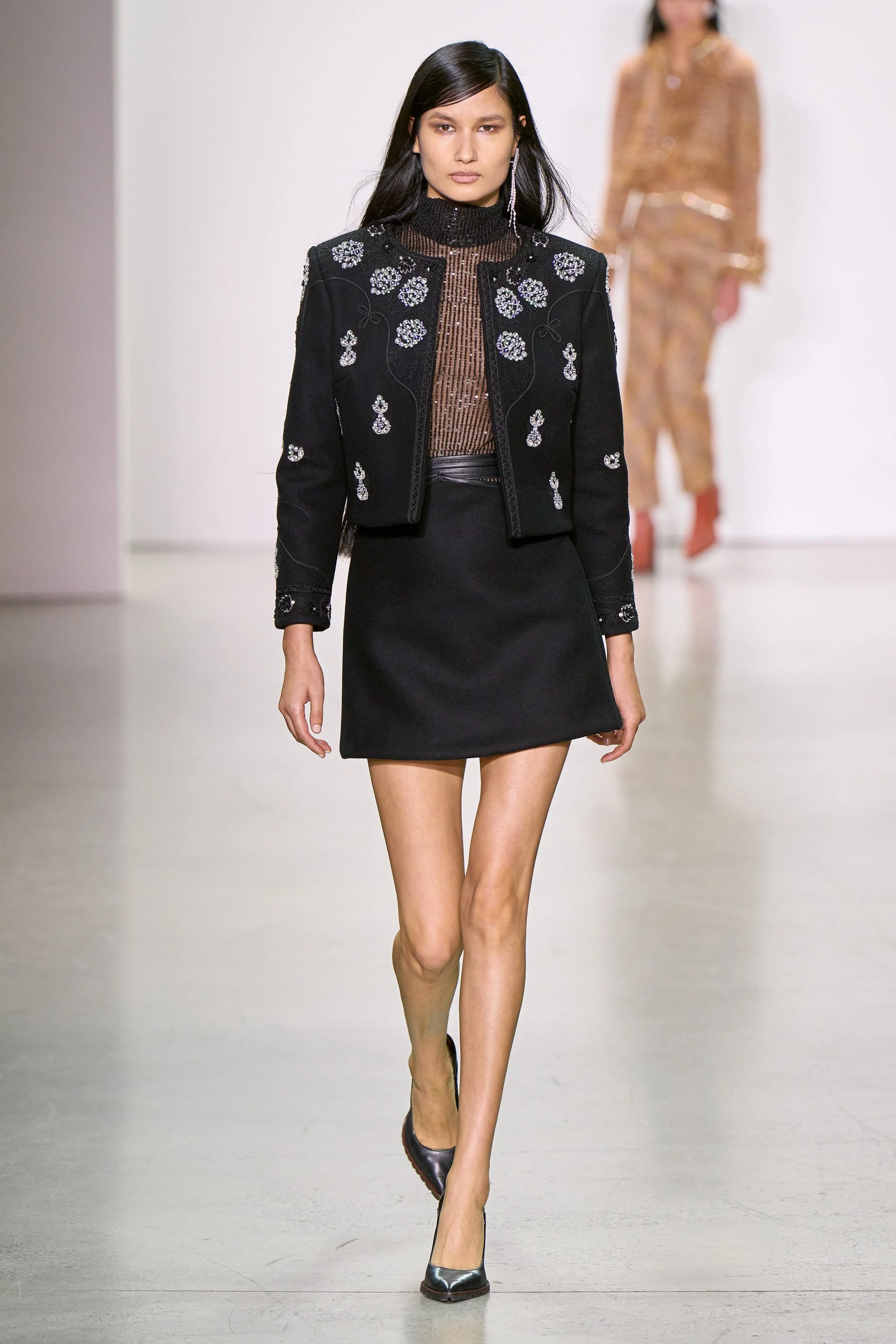Make that dreamers with active social lives ad great bodies, because for much of the collection, Gurung focused on evening looks with revealing cutouts inspired by the traditional choli blouse. Glamorous and high-heat, for sure, but the point would have registered as well in fewer variations; a little leather lacing and vibrant, high-shine satin go a long way. Conversely, a pair of saucy tweed day looks with waist-and-hip cutouts worked youthful charm, practicality be damned. Much of what wasn’t cut out was glitzed up in all-over, body-hugging sequins in notice-me shades – purple, hot pink, emerald green. Despite his preference for evening, Gurung showed a pair of a great looking coats, a tailored notched-collar camel with unfussy floral embroidery, and a stadium coat that he prettied up in a lovely rhododendron print inspired by the floral beauty of home.