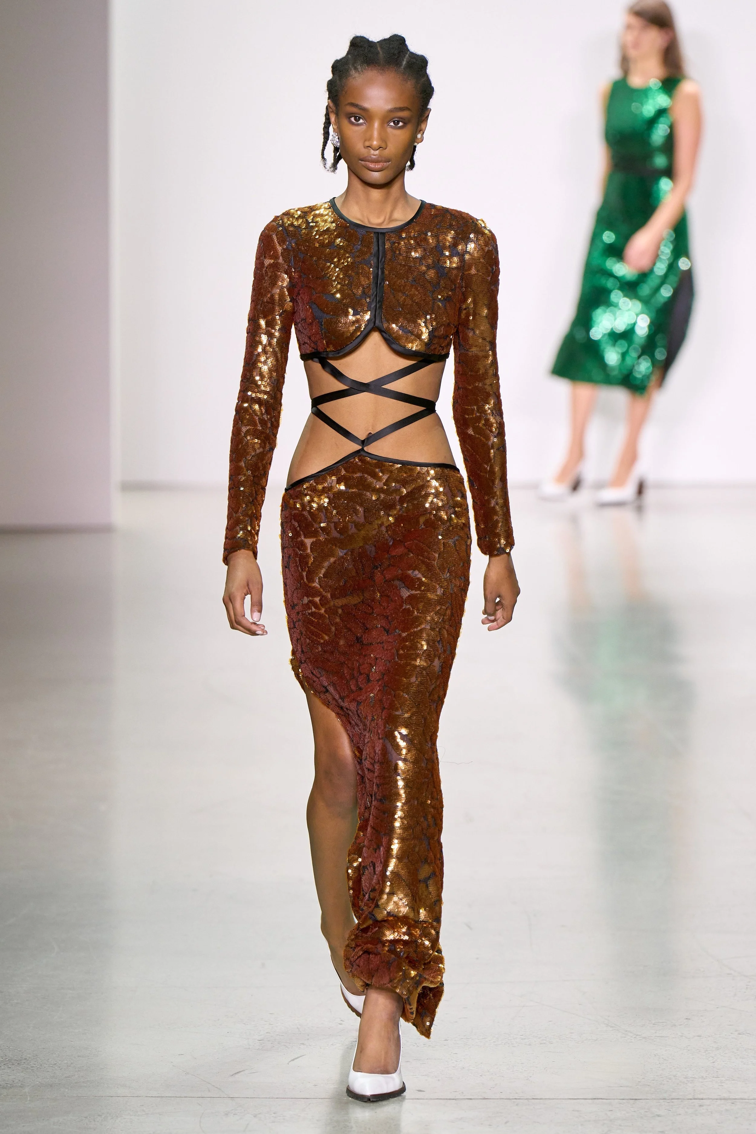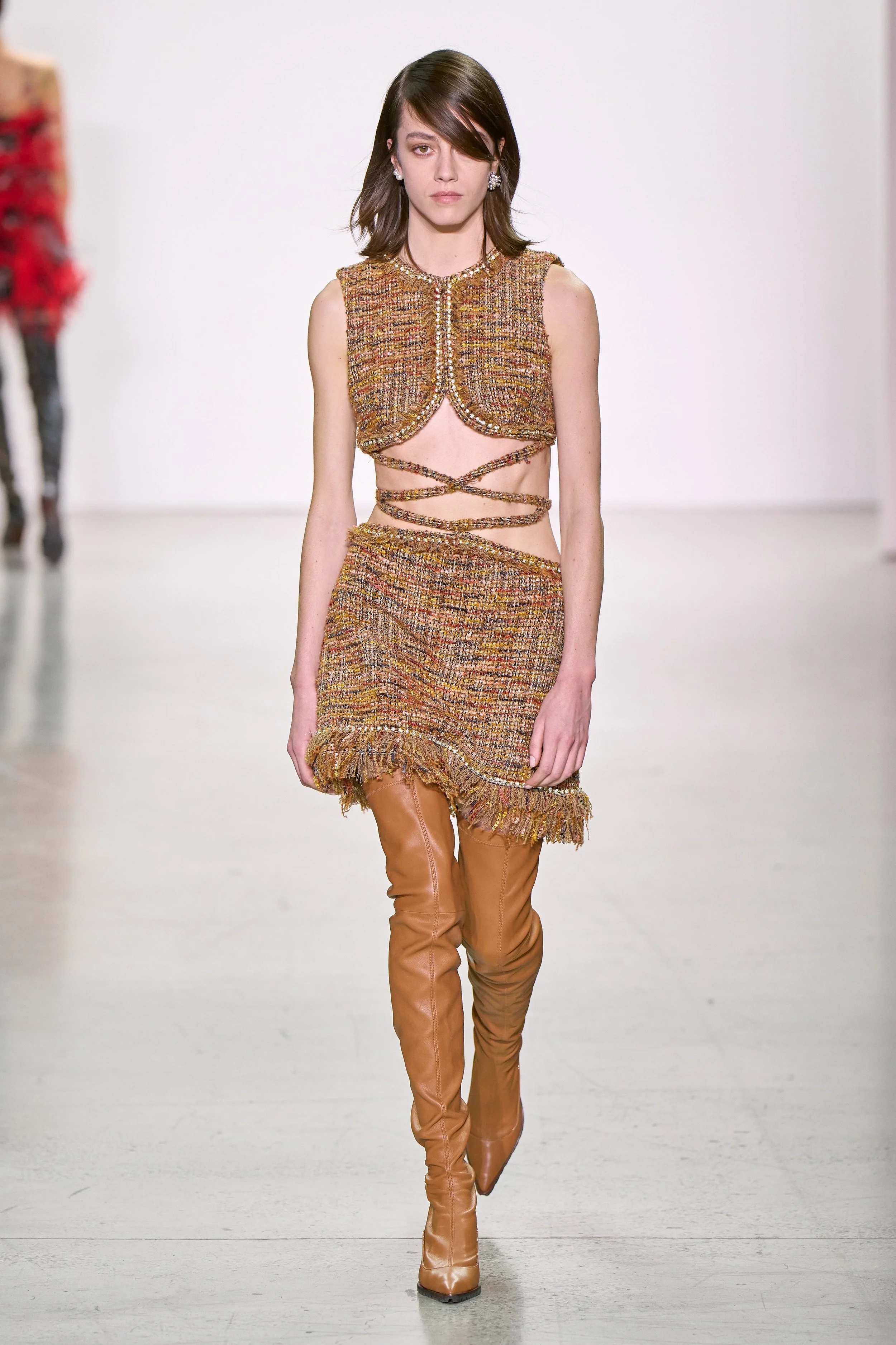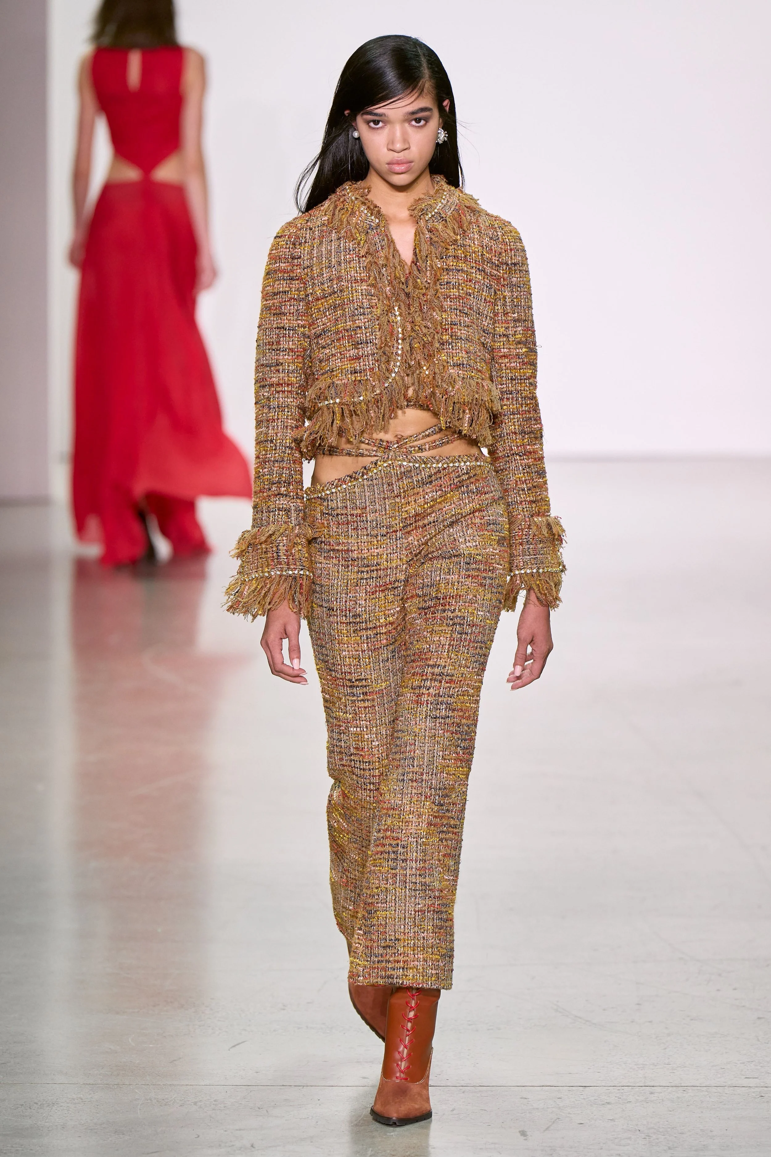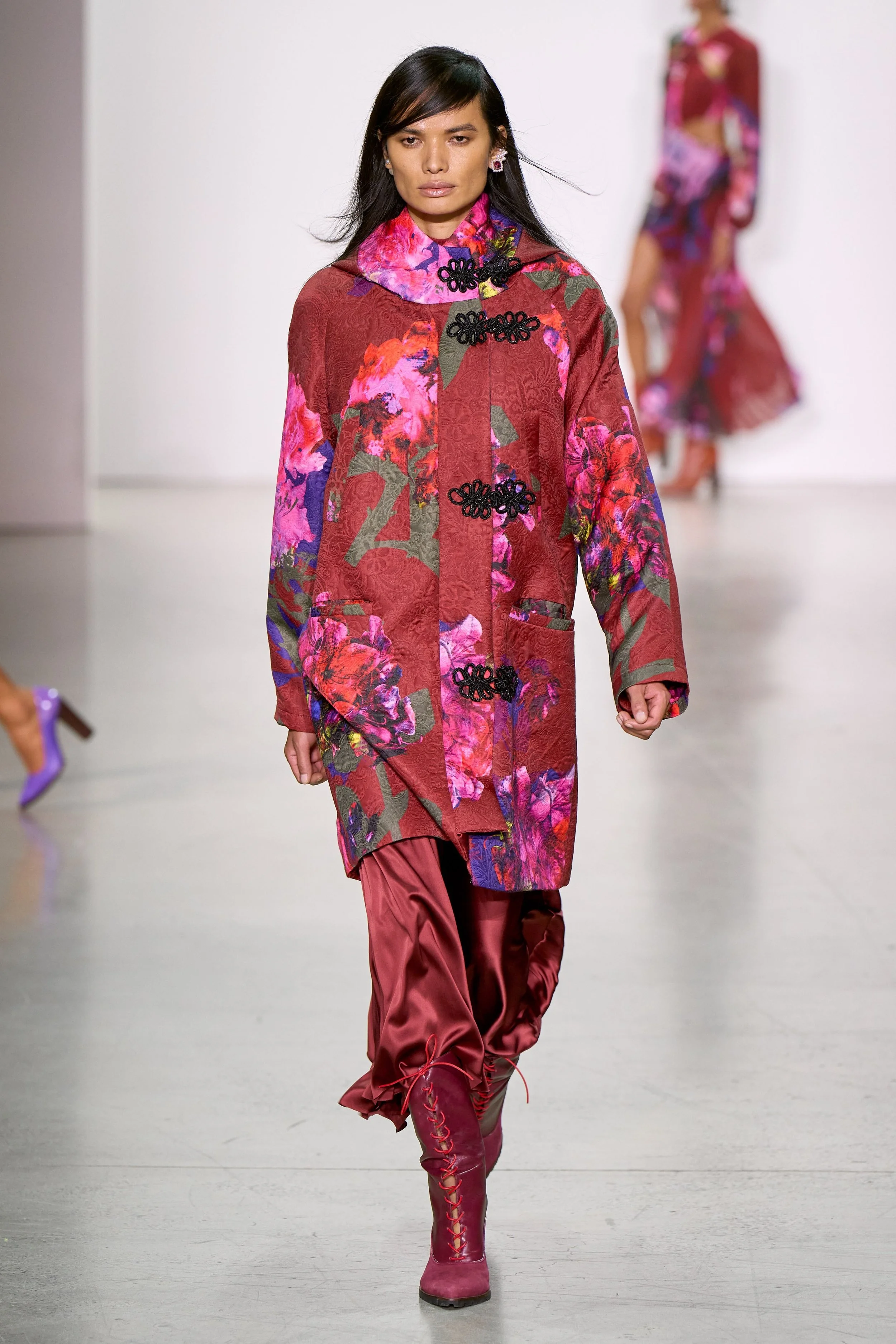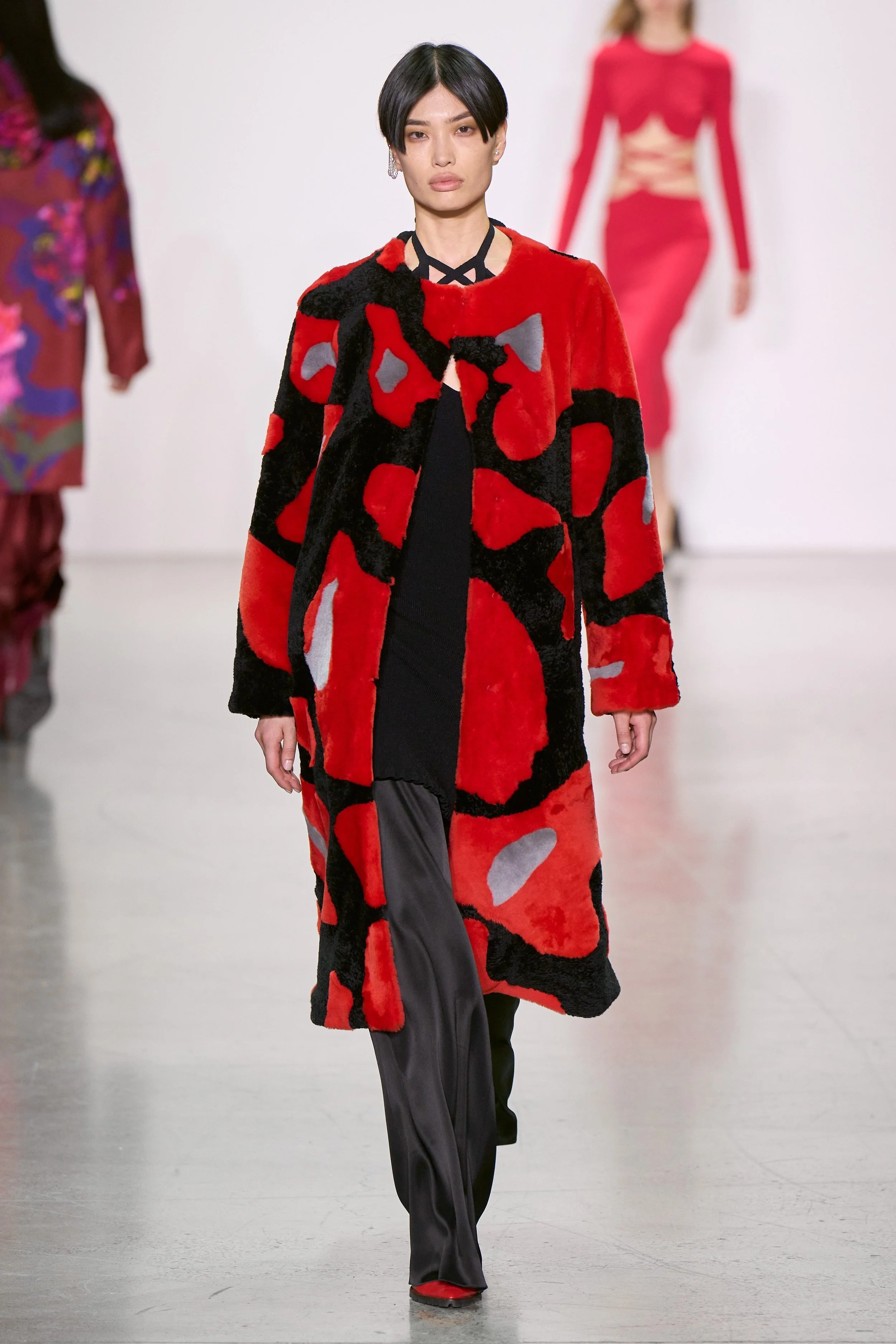 Make that dreamers with active social lives ad great bodies, because for much of the collection, Gurung focused on evening looks with revealing cutouts inspired by the traditional choli blouse. Glamorous and high-heat, for sure, but the point would have registered as well in fewer variations; a little leather lacing and vibrant, high-shine satin go a long way. Conversely, a pair of saucy tweed day looks with waist-and-hip cutouts worked youthful charm, practicality be damned. Much of what wasn’t cut out was glitzed up in all-over, body-hugging sequins in notice-me shades – purple, hot pink, emerald green. Despite his preference for evening, Gurung showed a pair of a great looking coats, a tailored notched-collar camel with unfussy floral embroidery, and a stadium coat that he prettied up in a lovely rhododendron print inspired by the floral beauty of home.