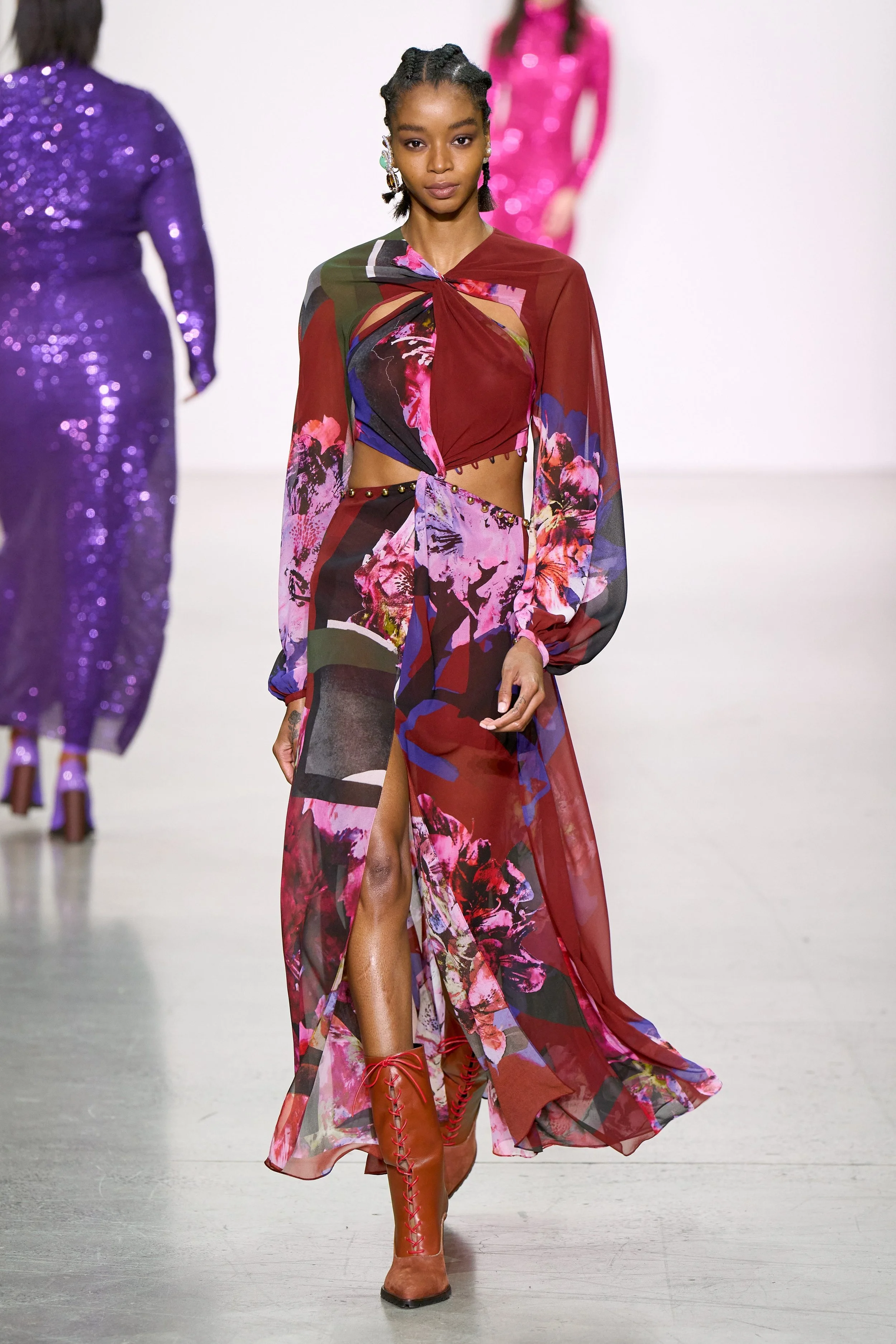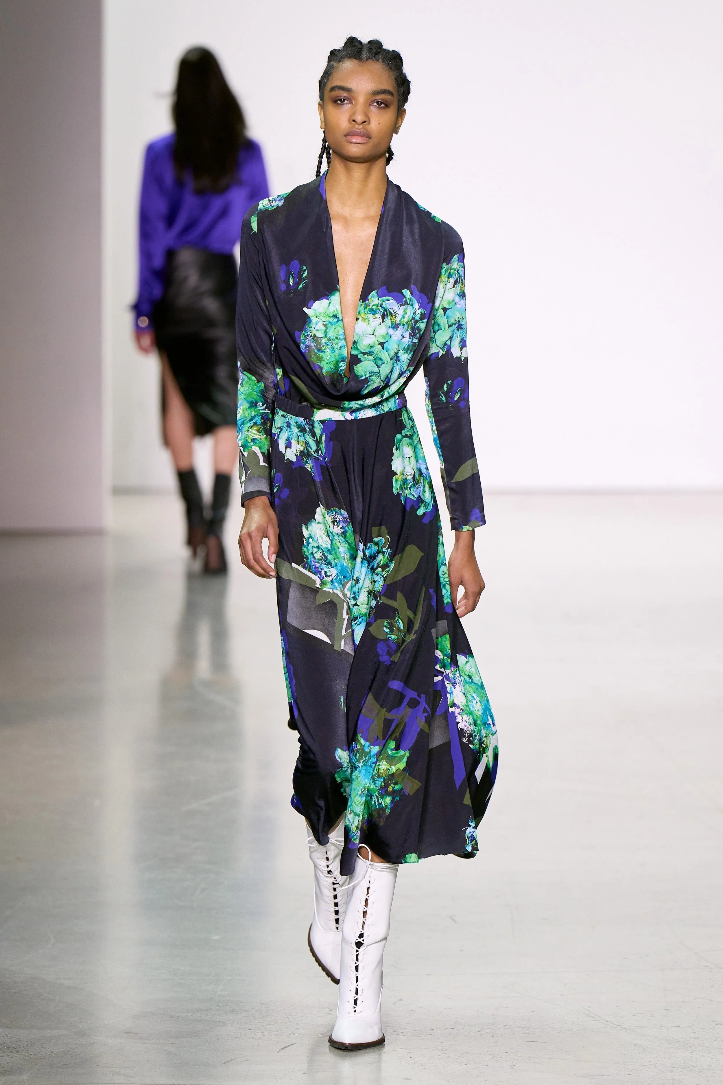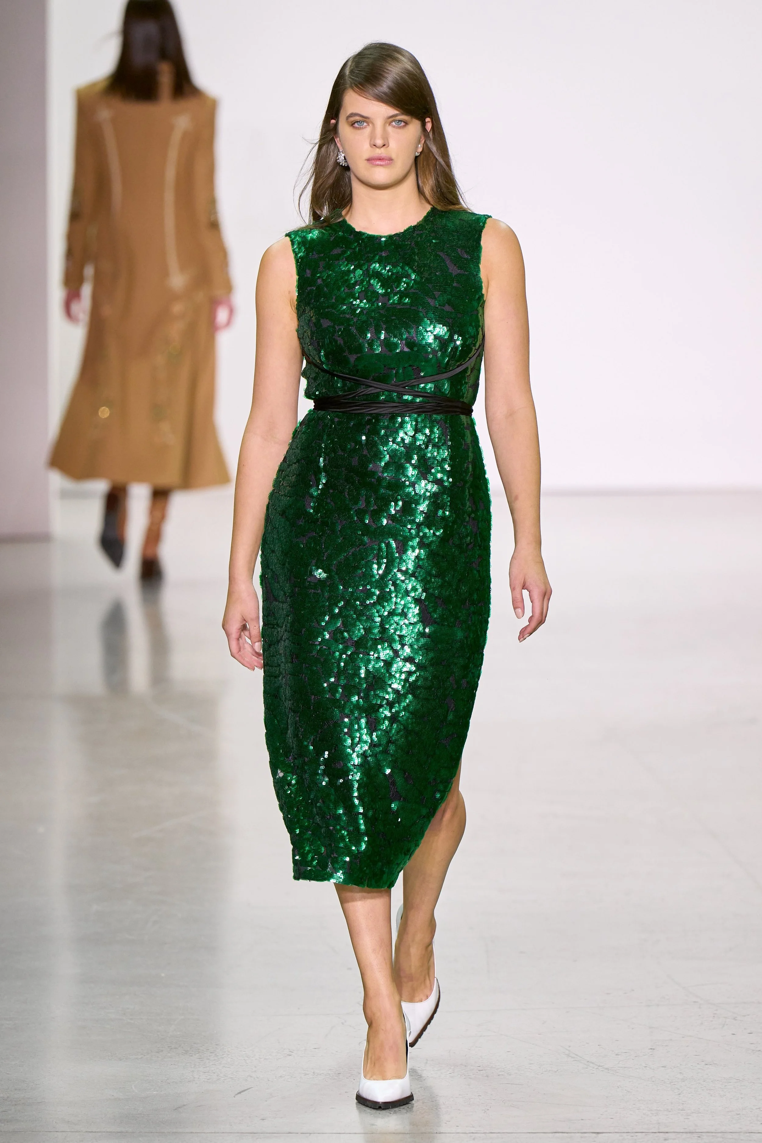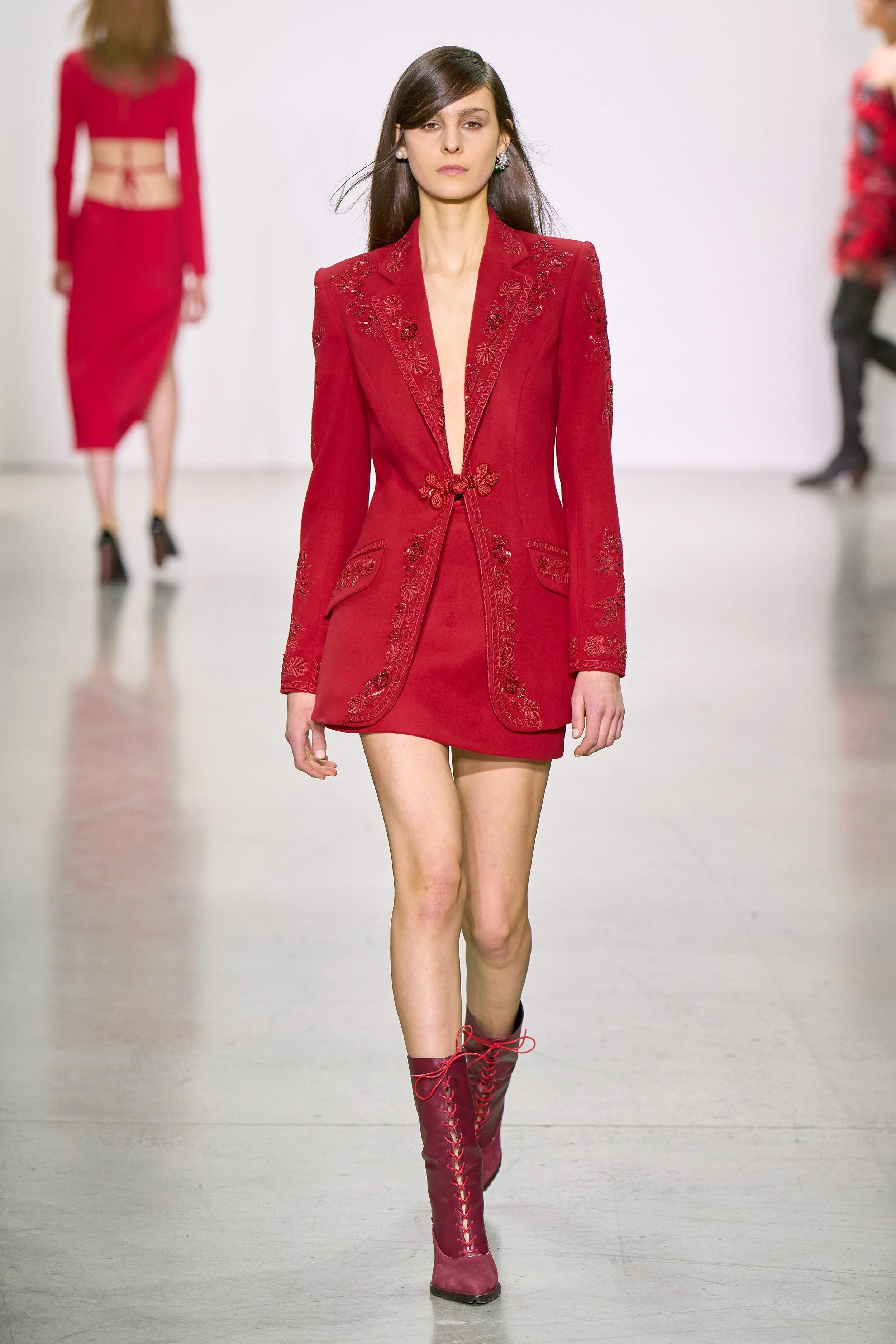 Make that dreamers with active social lives ad great bodies, because for much of the collection, Gurung focused on evening looks with revealing cutouts inspired by the traditional choli blouse. Glamorous and high-heat, for sure, but the point would have registered as well in fewer variations; a little leather lacing and vibrant, high-shine satin go a long way. Conversely, a pair of saucy tweed day looks with waist-and-hip cutouts worked youthful charm, practicality be damned. Much of what wasn’t cut out was glitzed up in all-over, body-hugging sequins in notice-me shades – purple, hot pink, emerald green. Despite his preference for evening, Gurung showed a pair of a great looking coats, a tailored notched-collar camel with unfussy floral embroidery, and a stadium coat that he prettied up in a lovely rhododendron print inspired by the floral beauty of home.