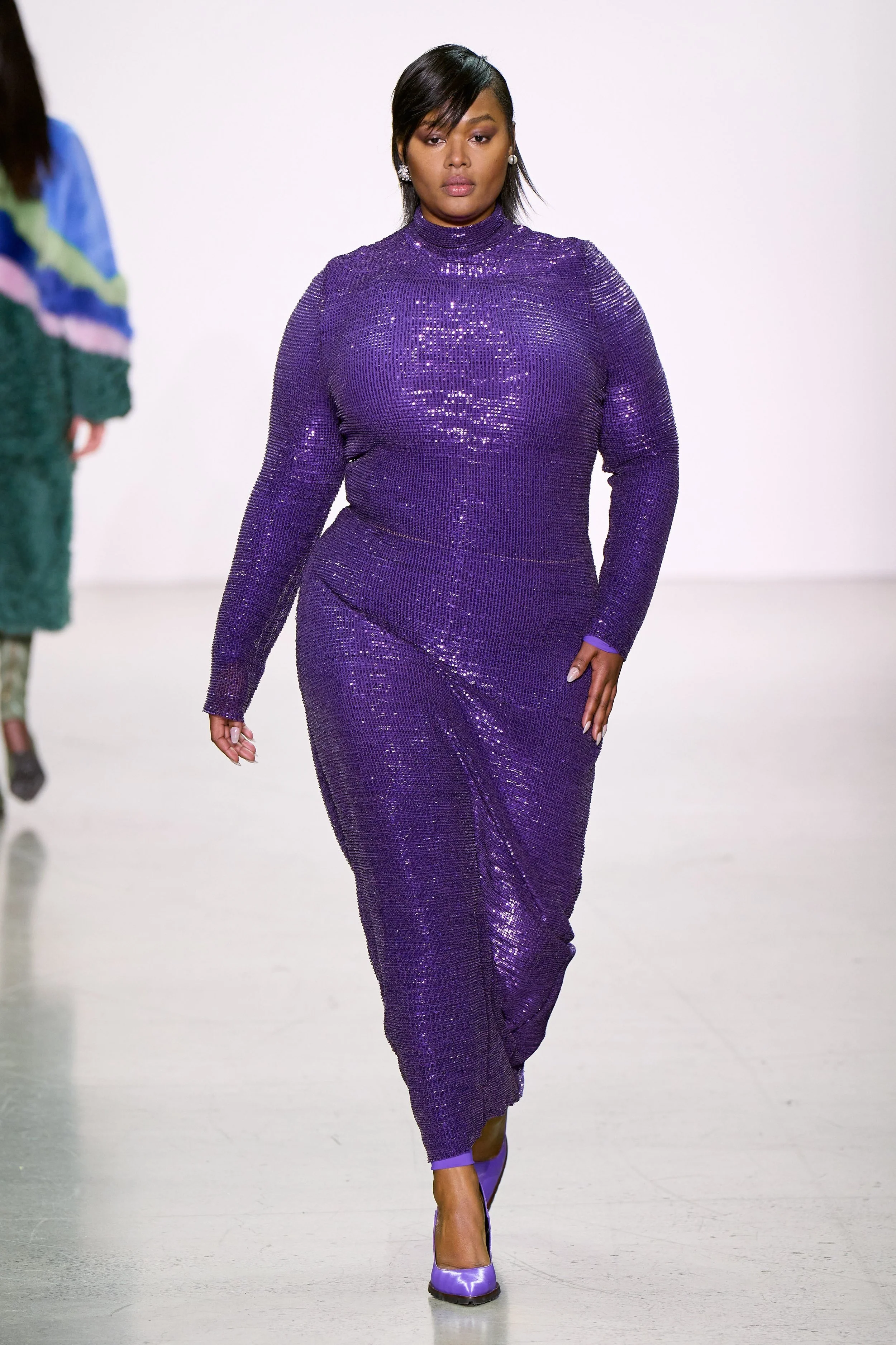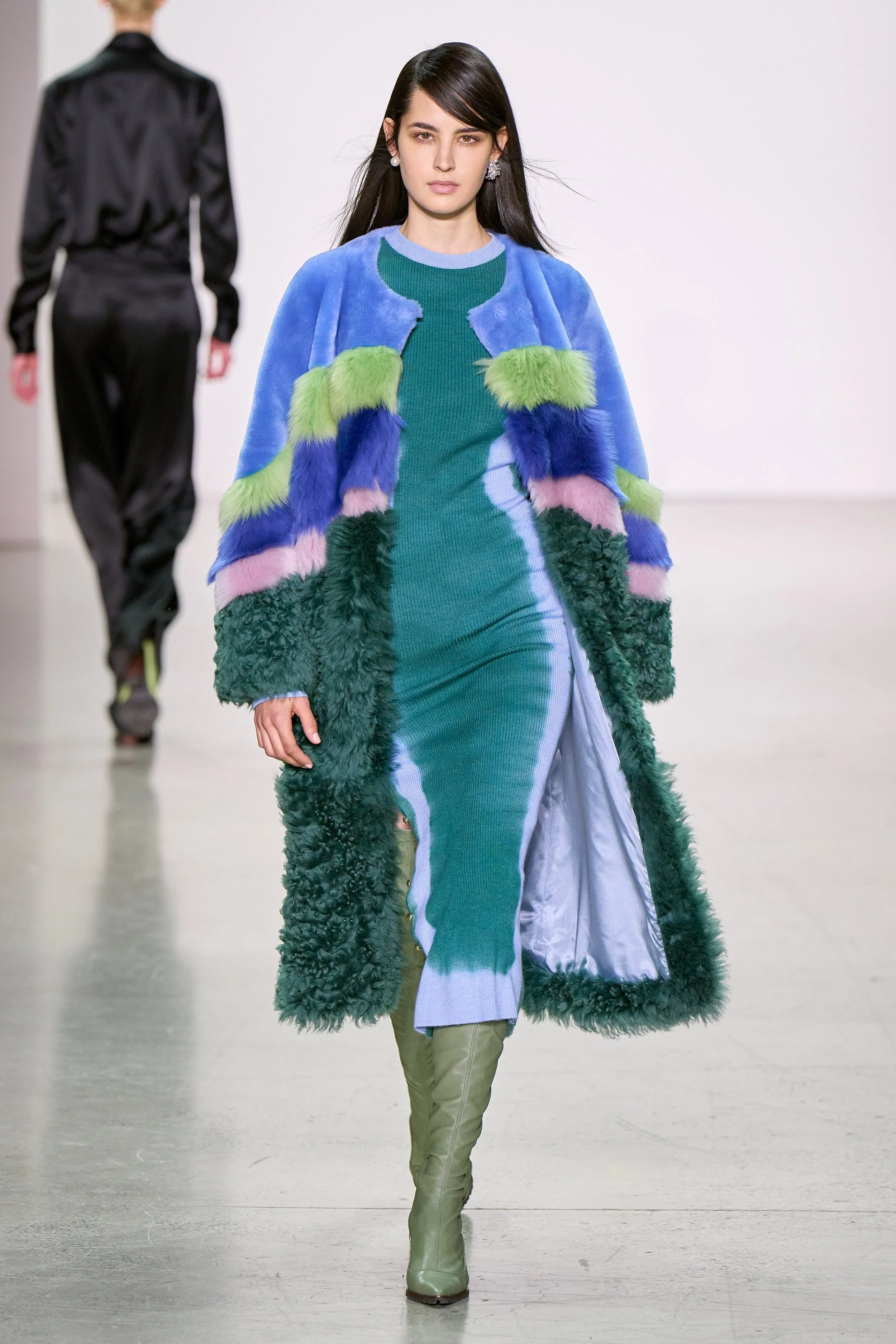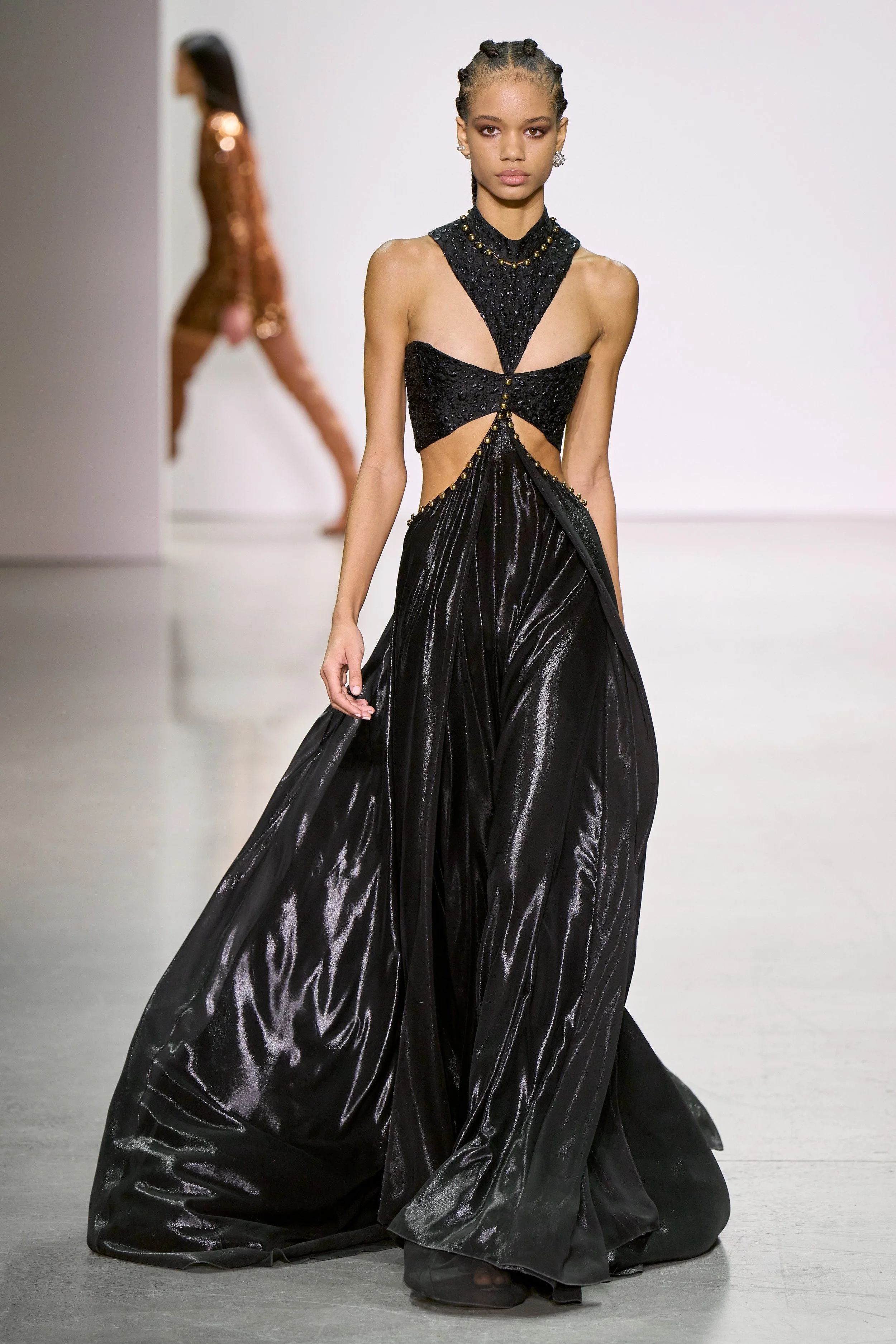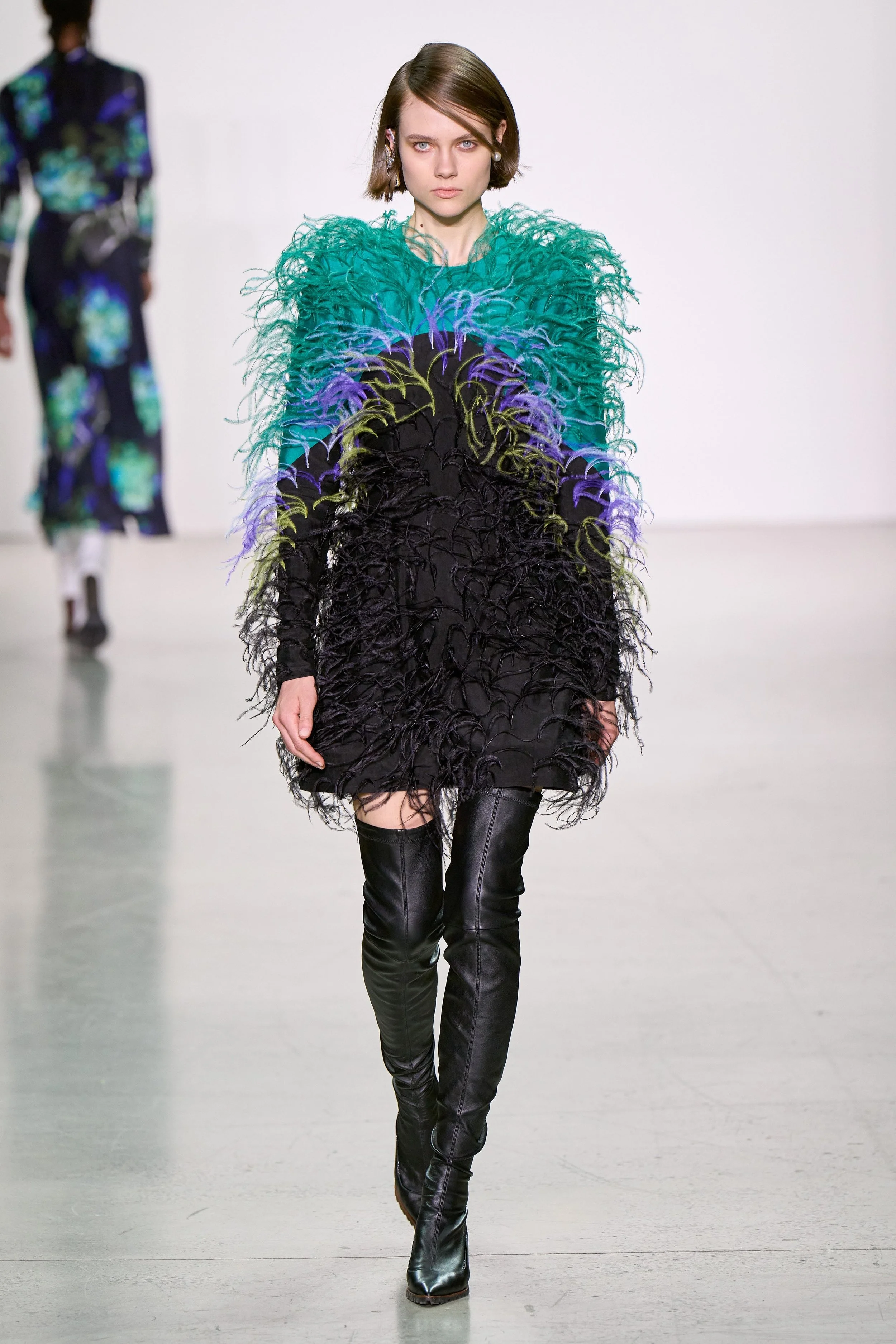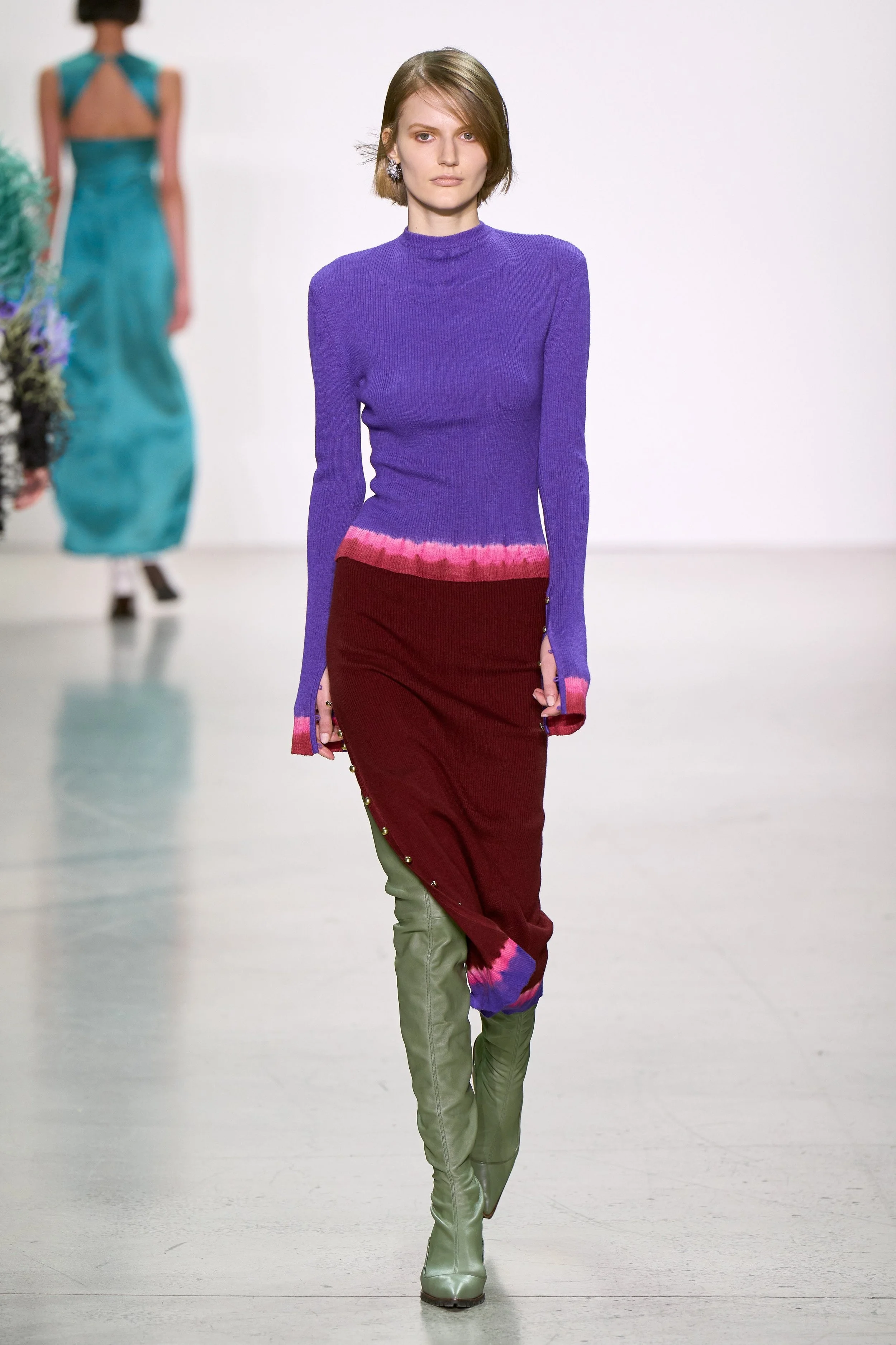 Make that dreamers with active social lives ad great bodies, because for much of the collection, Gurung focused on evening looks with revealing cutouts inspired by the traditional choli blouse. Glamorous and high-heat, for sure, but the point would have registered as well in fewer variations; a little leather lacing and vibrant, high-shine satin go a long way. Conversely, a pair of saucy tweed day looks with waist-and-hip cutouts worked youthful charm, practicality be damned. Much of what wasn’t cut out was glitzed up in all-over, body-hugging sequins in notice-me shades – purple, hot pink, emerald green. Despite his preference for evening, Gurung showed a pair of a great looking coats, a tailored notched-collar camel with unfussy floral embroidery, and a stadium coat that he prettied up in a lovely rhododendron print inspired by the floral beauty of home.