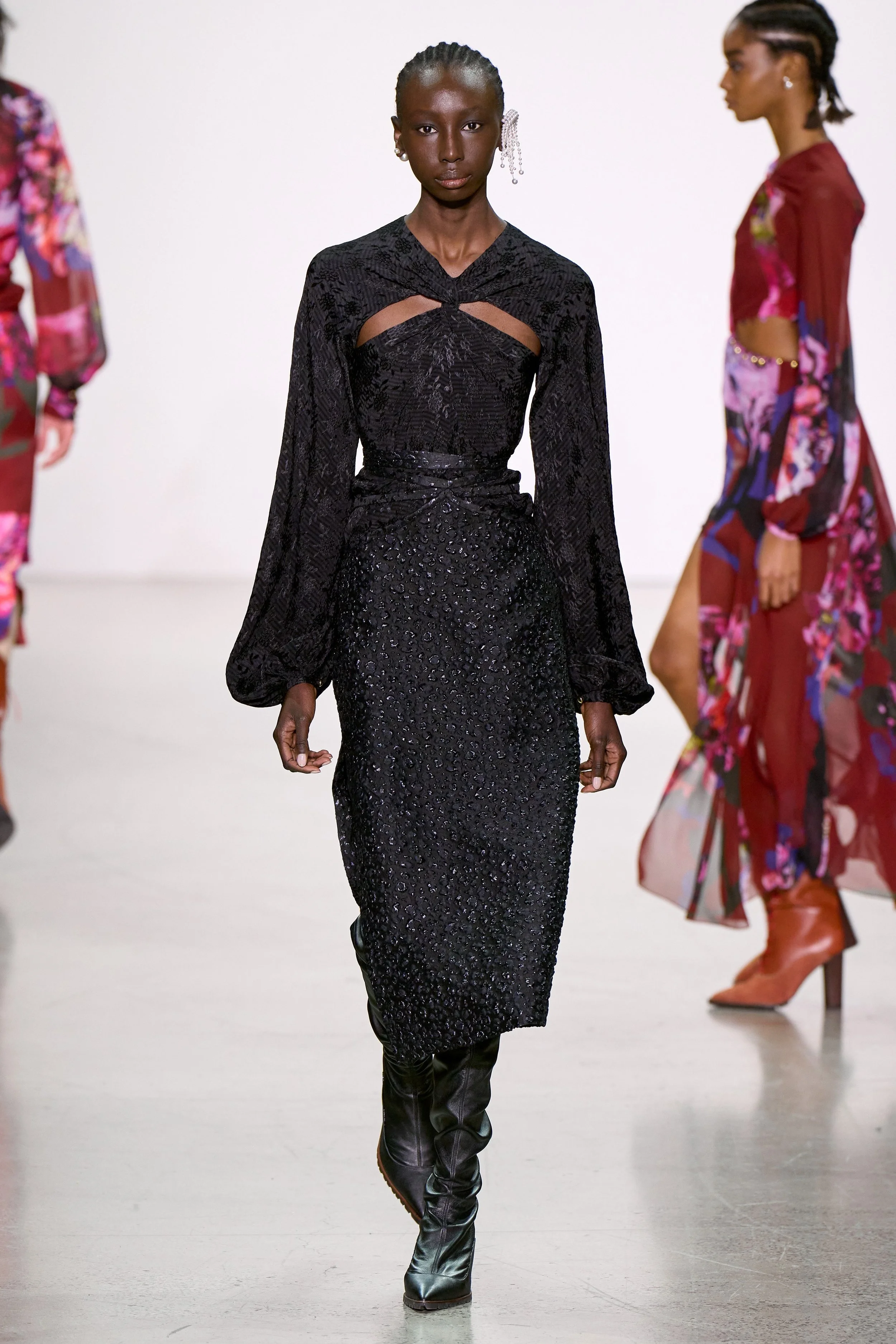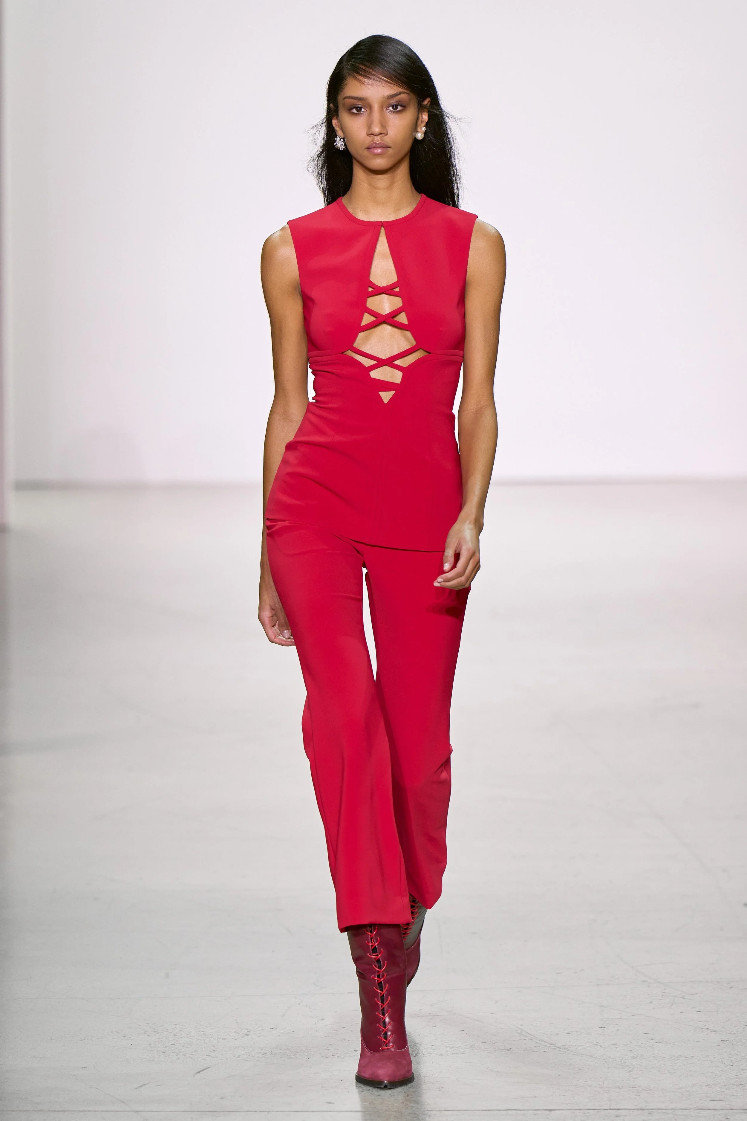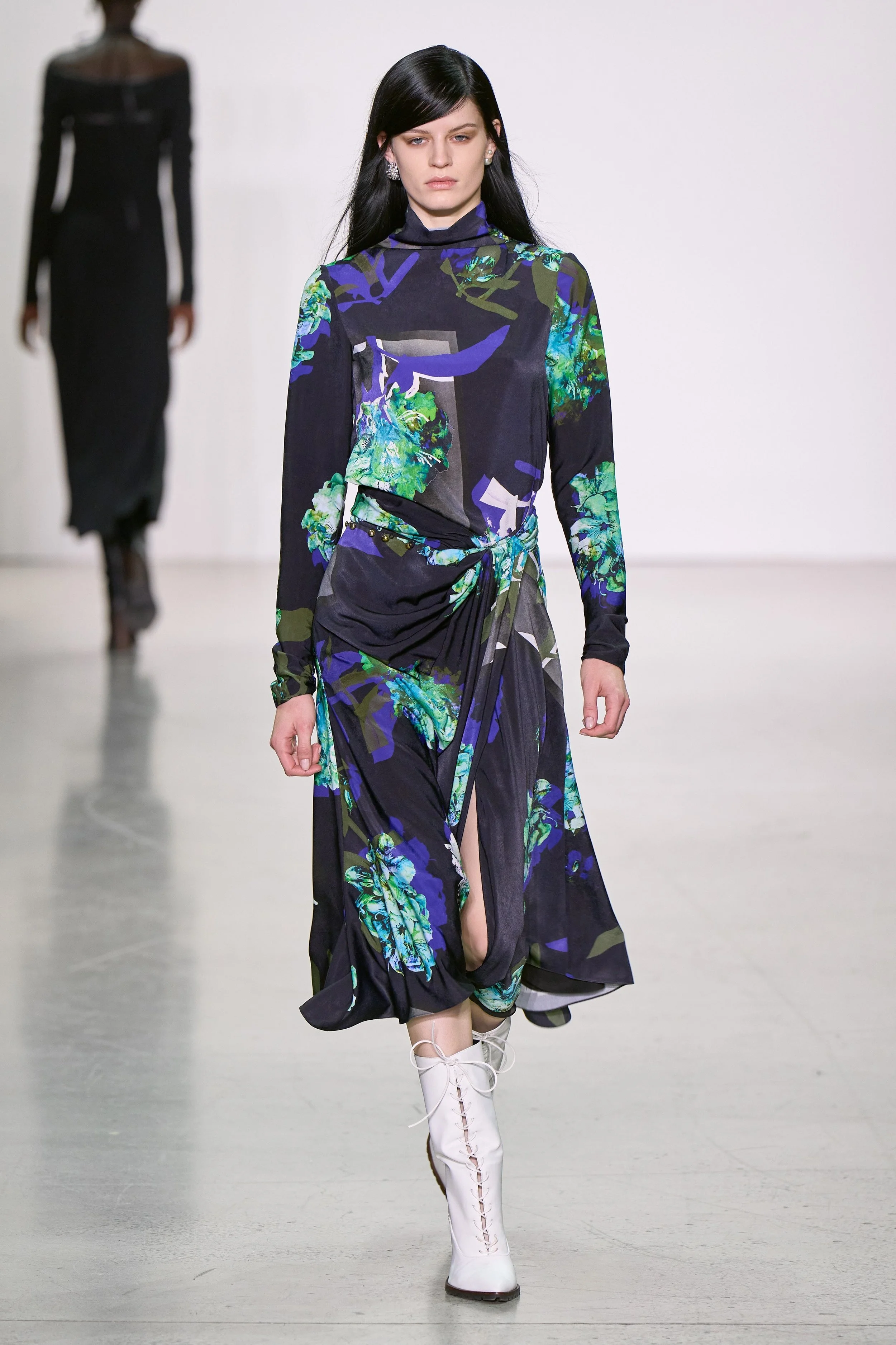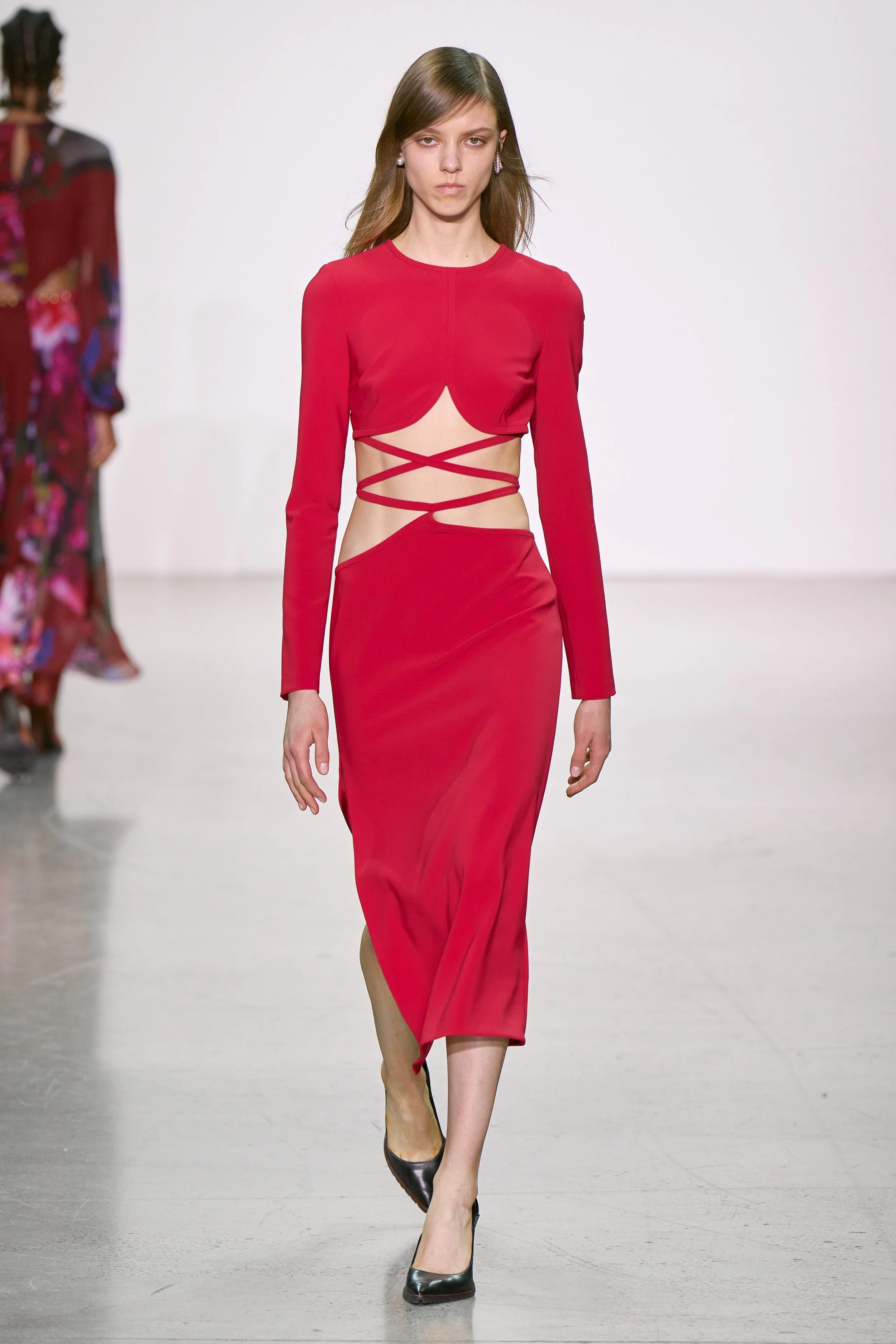 Make that dreamers with active social lives ad great bodies, because for much of the collection, Gurung focused on evening looks with revealing cutouts inspired by the traditional choli blouse. Glamorous and high-heat, for sure, but the point would have registered as well in fewer variations; a little leather lacing and vibrant, high-shine satin go a long way. Conversely, a pair of saucy tweed day looks with waist-and-hip cutouts worked youthful charm, practicality be damned. Much of what wasn’t cut out was glitzed up in all-over, body-hugging sequins in notice-me shades – purple, hot pink, emerald green. Despite his preference for evening, Gurung showed a pair of a great looking coats, a tailored notched-collar camel with unfussy floral embroidery, and a stadium coat that he prettied up in a lovely rhododendron print inspired by the floral beauty of home.