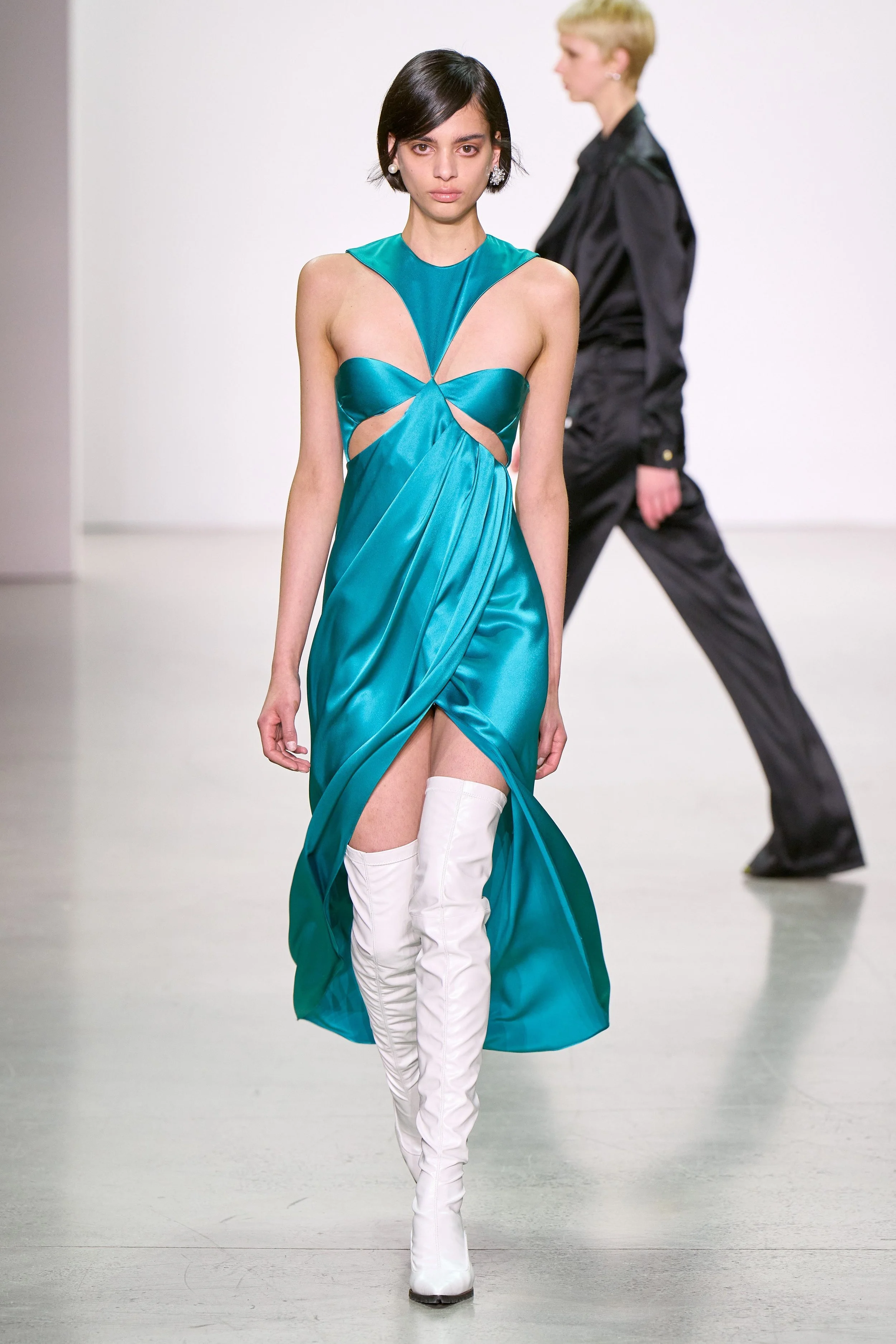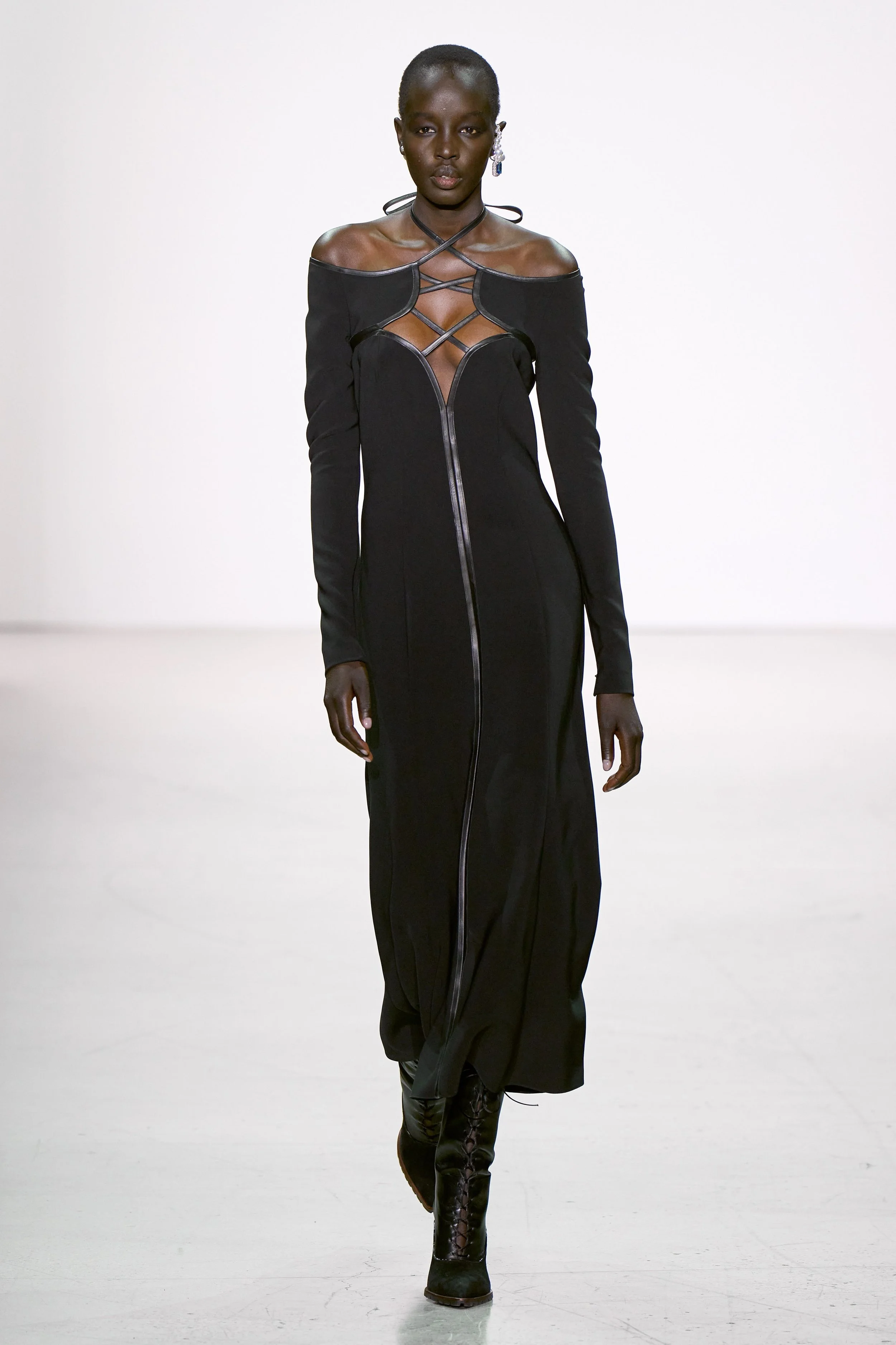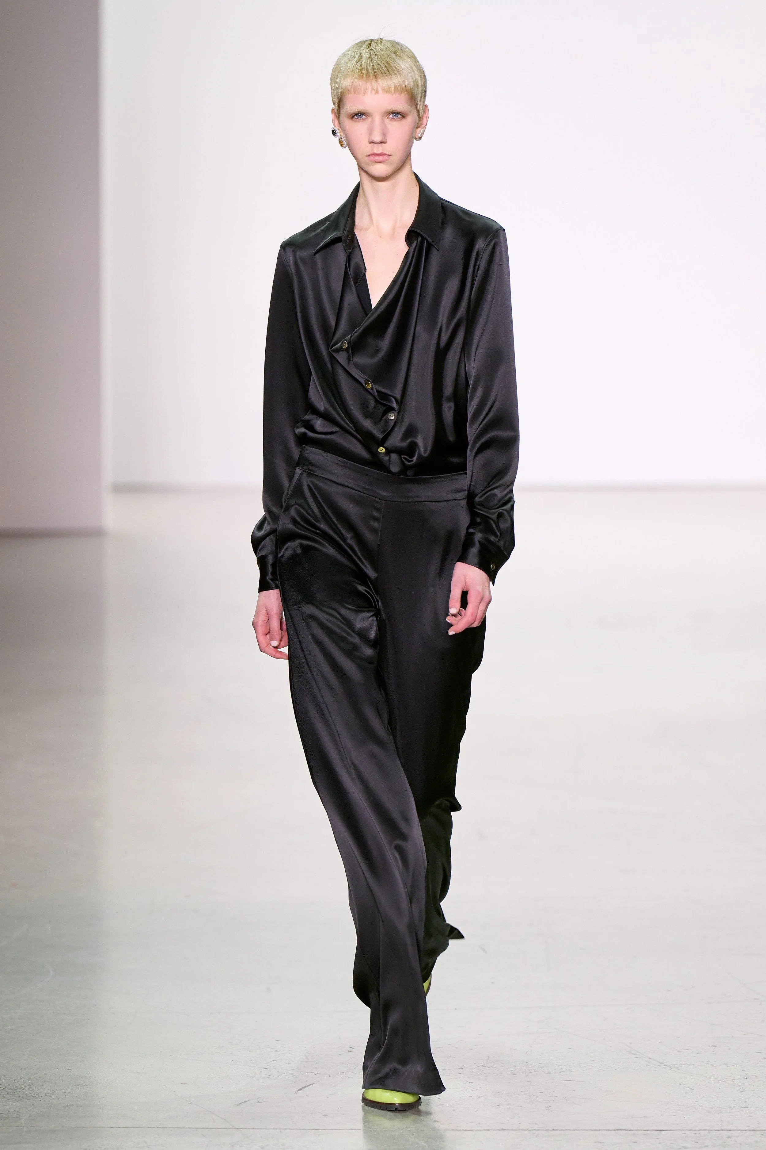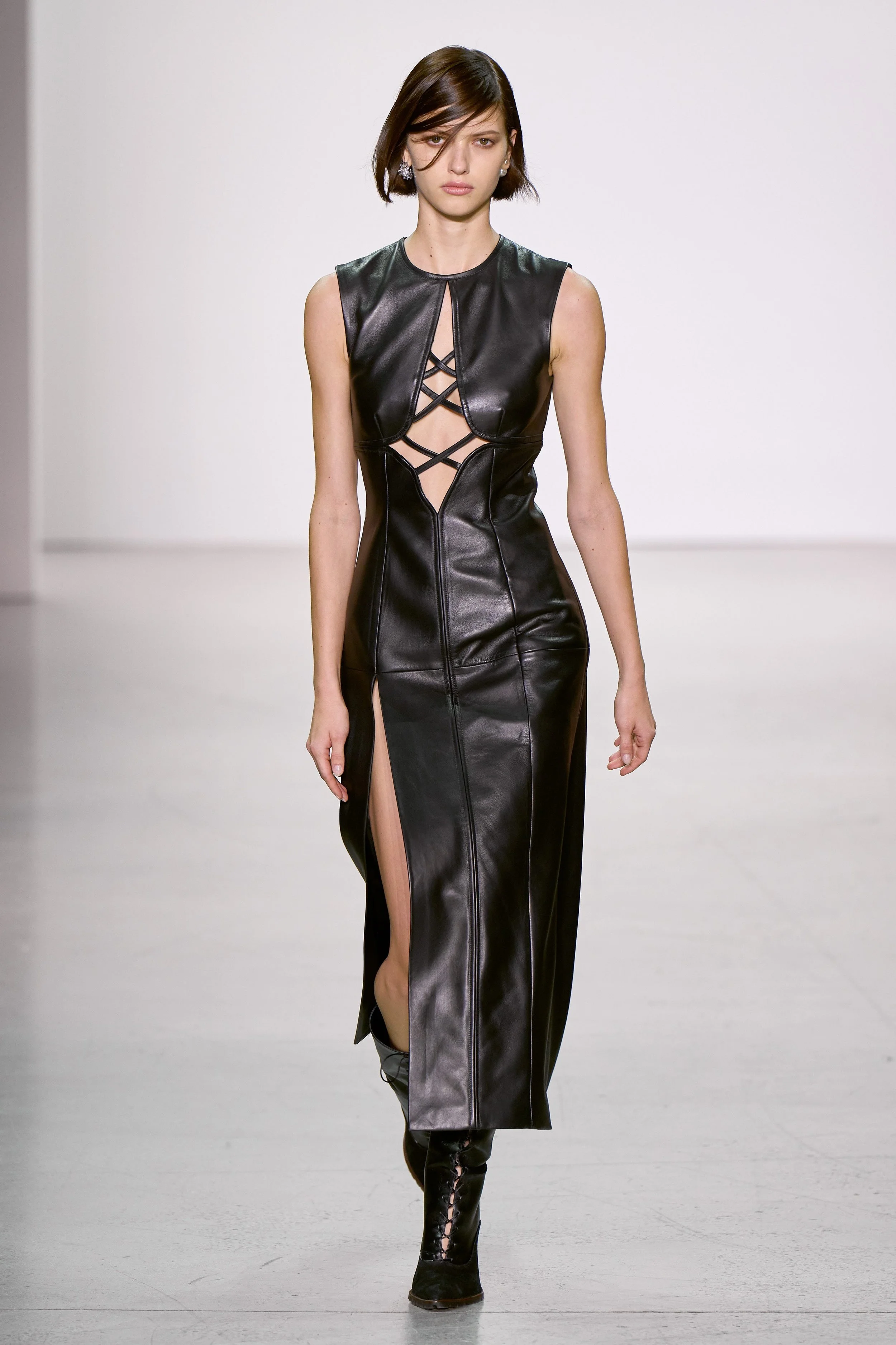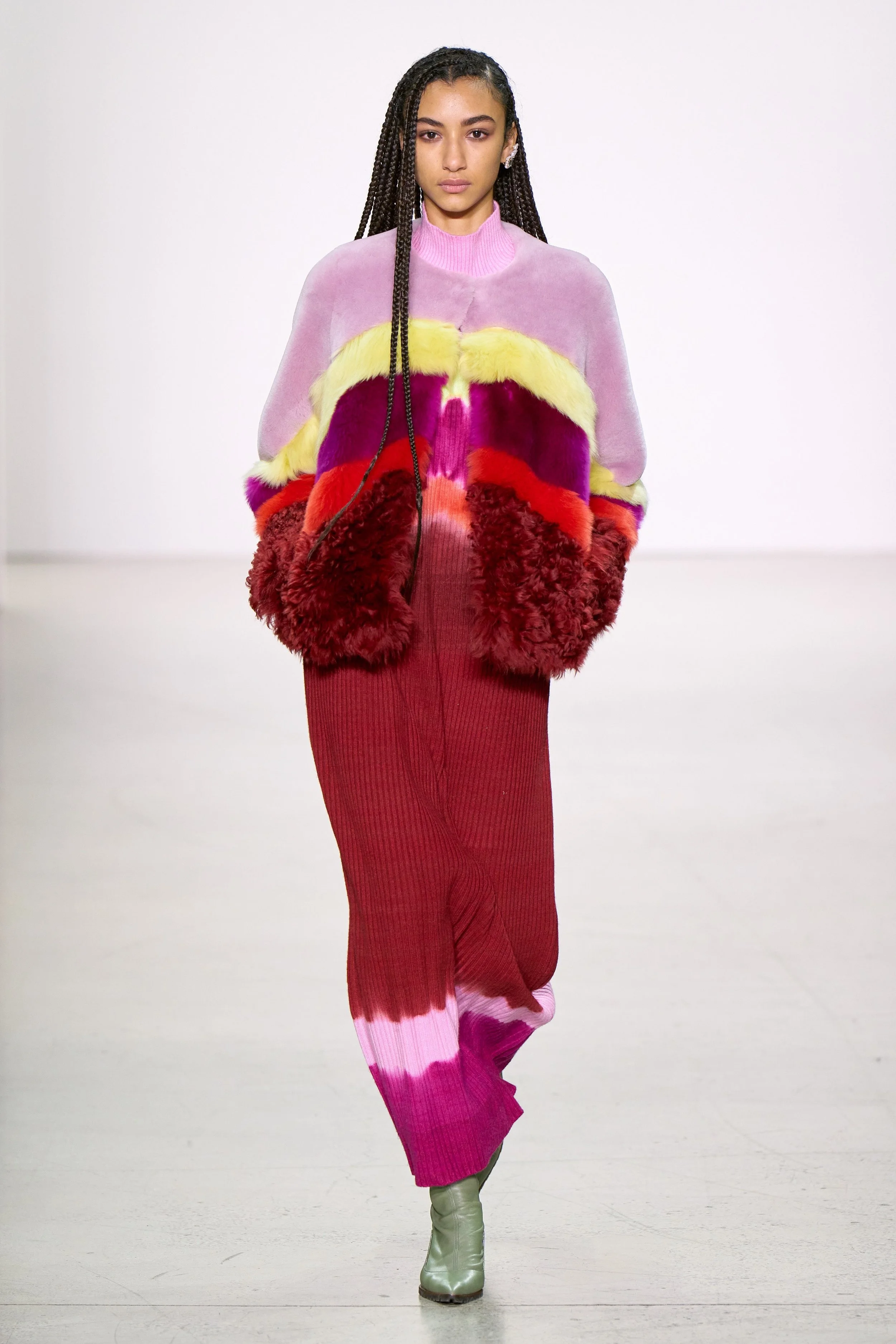 Make that dreamers with active social lives ad great bodies, because for much of the collection, Gurung focused on evening looks with revealing cutouts inspired by the traditional choli blouse. Glamorous and high-heat, for sure, but the point would have registered as well in fewer variations; a little leather lacing and vibrant, high-shine satin go a long way. Conversely, a pair of saucy tweed day looks with waist-and-hip cutouts worked youthful charm, practicality be damned. Much of what wasn’t cut out was glitzed up in all-over, body-hugging sequins in notice-me shades – purple, hot pink, emerald green. Despite his preference for evening, Gurung showed a pair of a great looking coats, a tailored notched-collar camel with unfussy floral embroidery, and a stadium coat that he prettied up in a lovely rhododendron print inspired by the floral beauty of home.