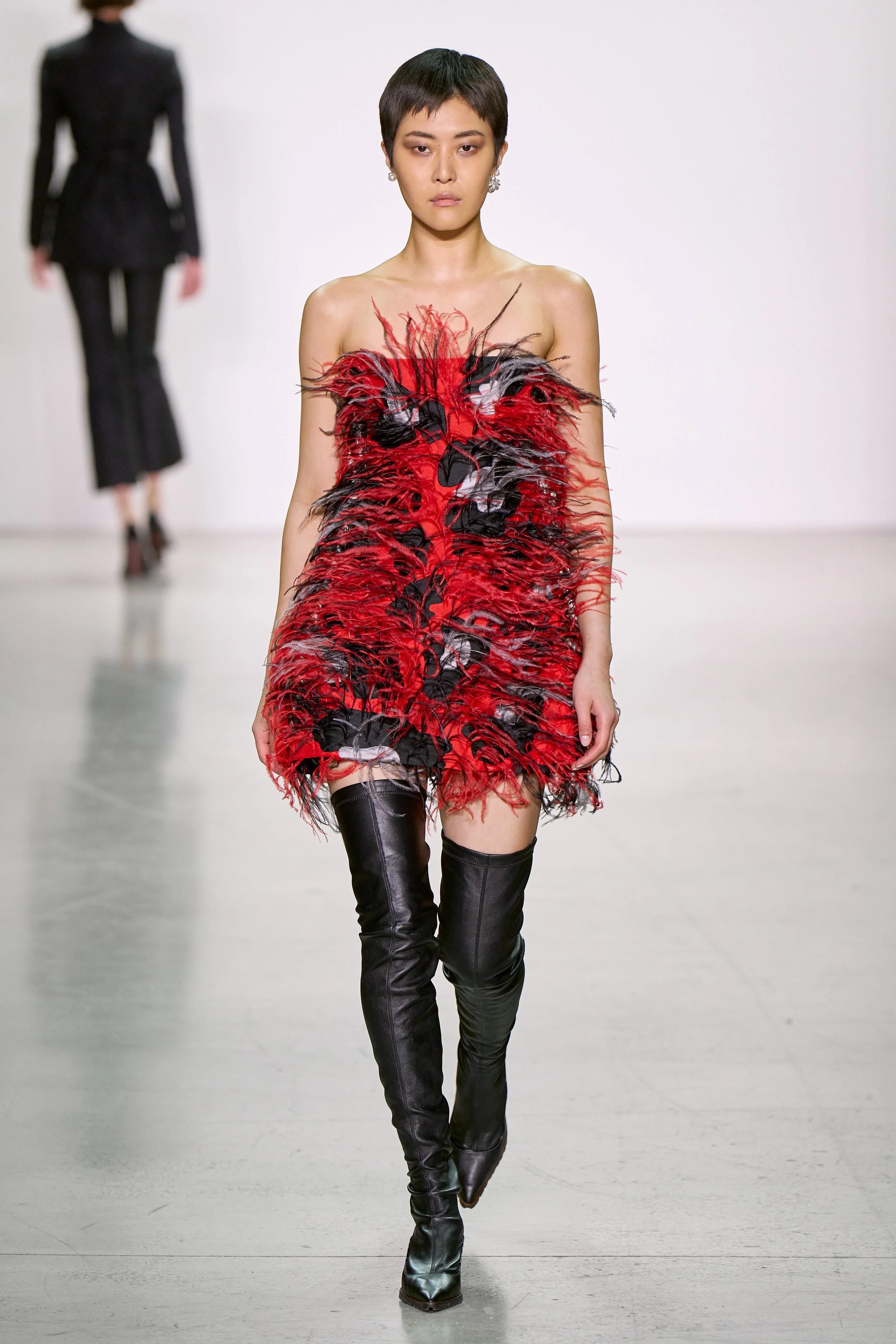 The COVID pandemic has kept Gurung away from his homeland for “a few years,” and he misses it terribly. Yet while he has often celebrated the country on his runway, this time out he did so with difference, in a reverie in which he reenvisioned Nepal’s village women “in a cosmopolitan New York full of impossible dreamers.”