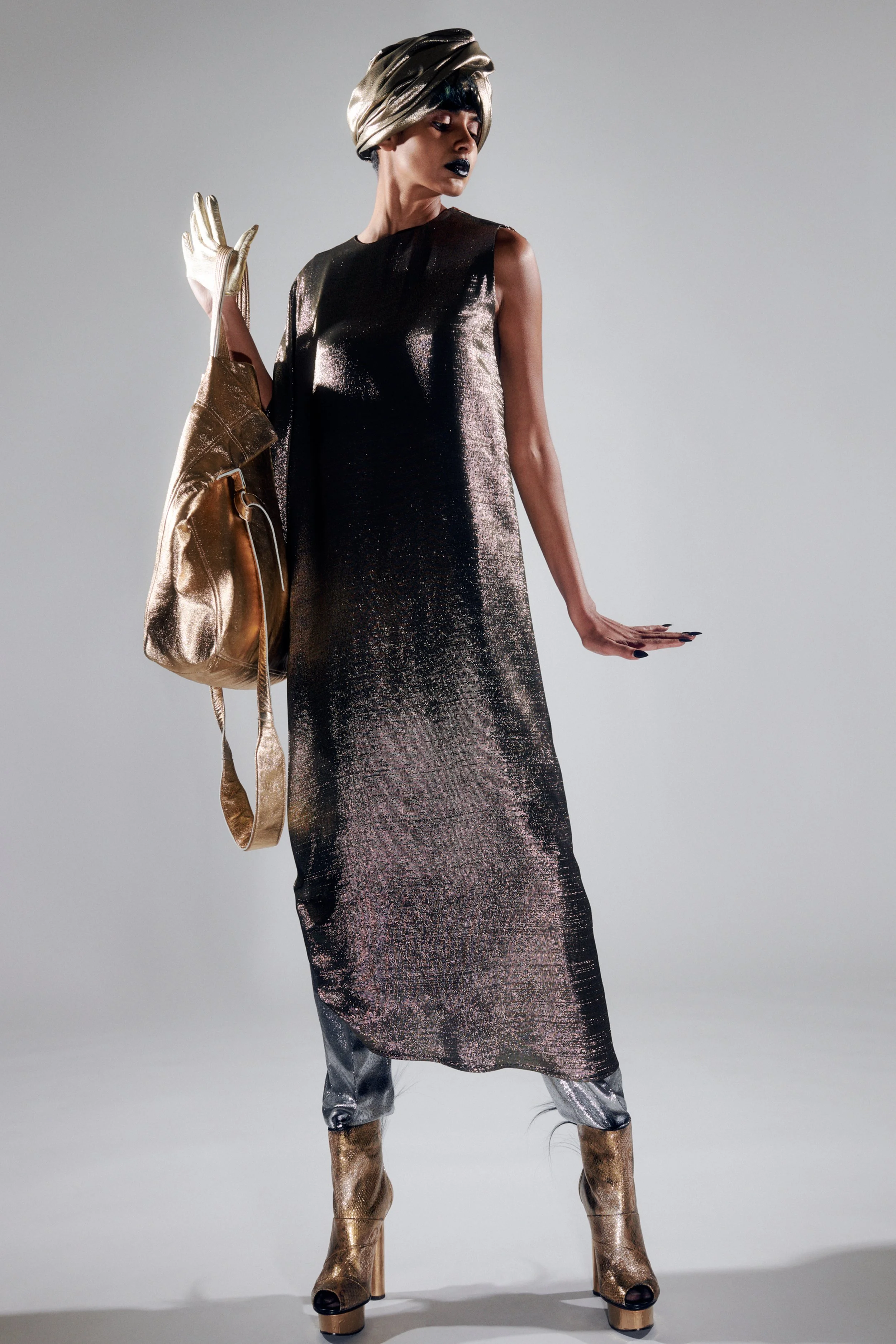 The looks featured an array of techniques from applique and embellishing to draping and weaving, all representing the different hats the RVDK woman wears in her life as she embodies the extravagance, fragility and other fragments of the human personality. Opening the presentation, Pat can be seen in a scrumptiously sculpted tuxedo black gown with an emphasis on the power shoulders. The looks then morph into colourful hand-painted gowns and glass stained sculptural skirts matched with leather bandeau tops. The amalgamation of wide, sharp silhouettes with minimal bandeau-like tops truly defines the layers to one’s personality - sometimes we feel dark, romantic and powerful in life, other times we just want to have fun and let loose.