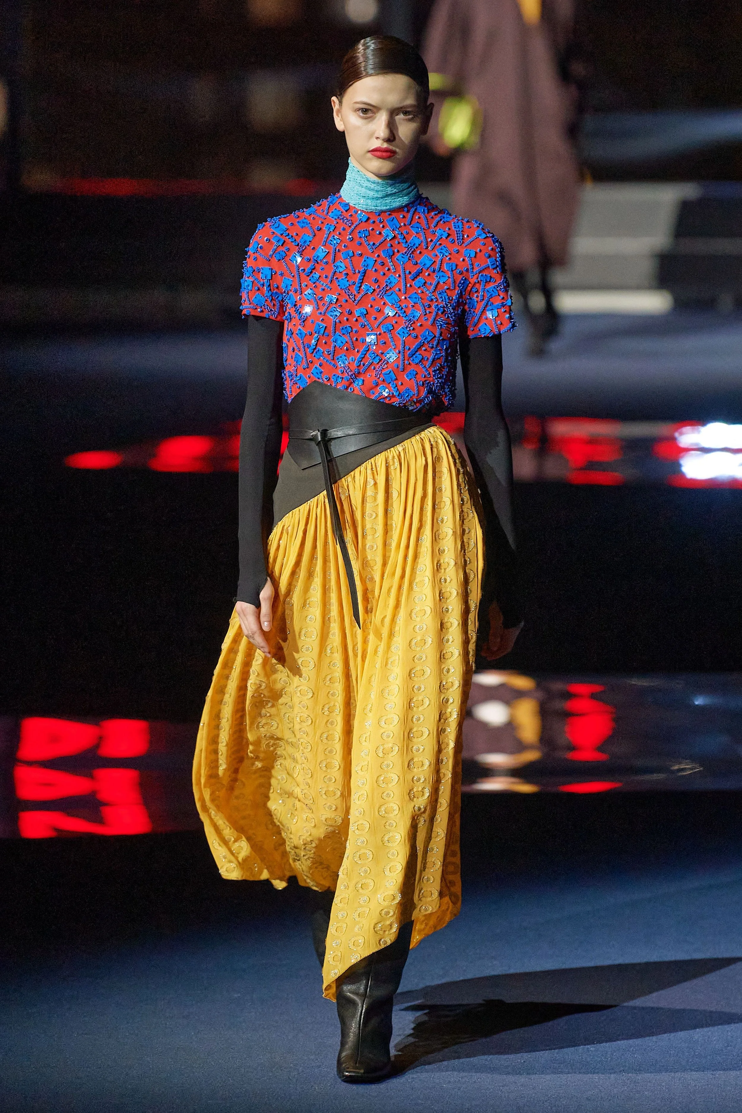 In her program notes, Burch acknowledged a “heightened sense of luxury,” but the difference didn’t stop there. She was inspired by New York’s “unique characters” whom she viewed through the “lens of shape, geometry, color and convertibility.” She utilized those elements to create pieces that will aid women in expressing their individuality with a new level or sophistication. Outerwear was a focus, often in roomy, colorful toppers, or long jackets cinched with deep belts over full skirts. There were athletic and retro references, the latter including pleated trousers, the versatility of which Burch flaunted in takes registering from working-woman chic to ultra-sporty. She inserted an artful current with interesting tailoring, for example, the mannish suit reimagined with a strapless jacket and single wide chiffon strap, and jeweled T-shirts layered atop skinny turtlenecks and full skirts.