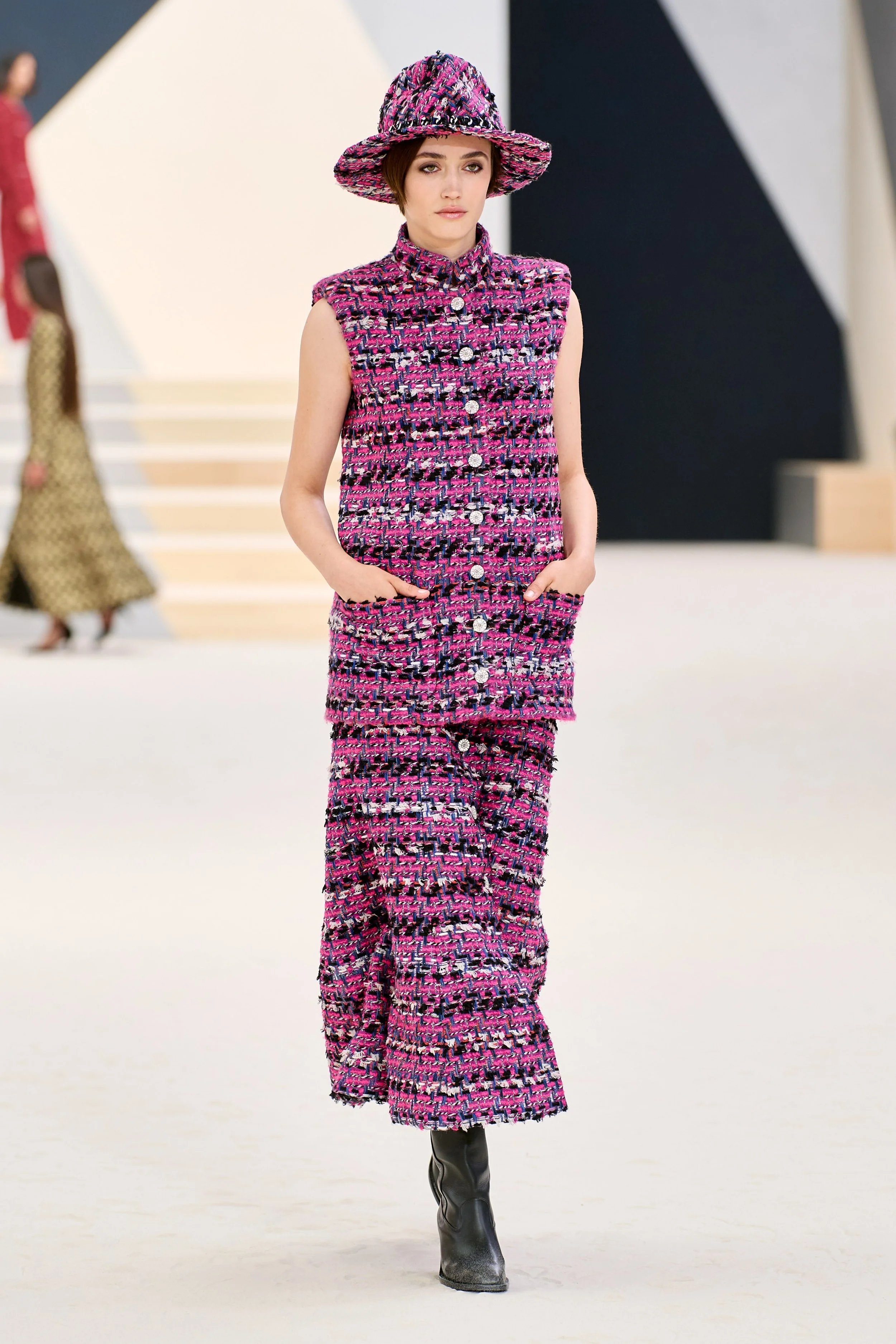 With a powerhouse of artisans and craftspeople, Viard brought out an array of movement onto the sandy catwalk, opening with a grass green two-piece skirt suit, with a redefined cropped silhouette, merging timelessness into the future. Following, we witnessed a colour story that transformed the signature monochromatics of tweed, by bringing dashes of colourful detail such as a pink camellia embroidered top underneath a sandy beige tweed set, glistening with pink and blue details reminiscent of the reflection of stones.