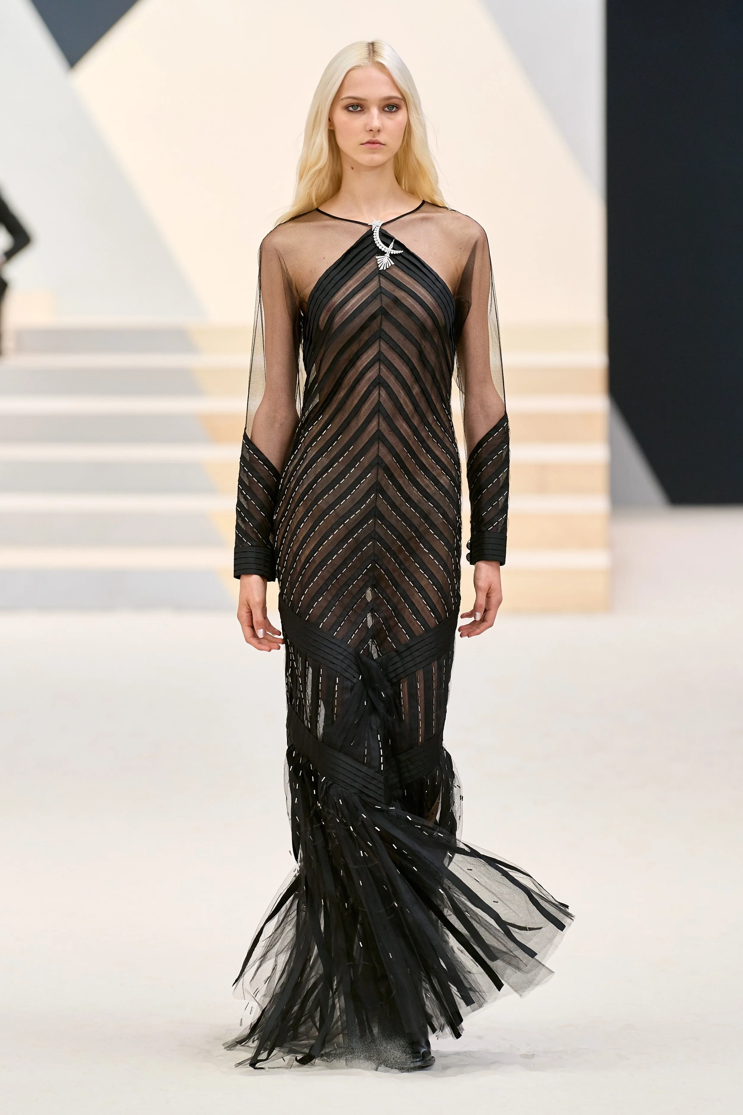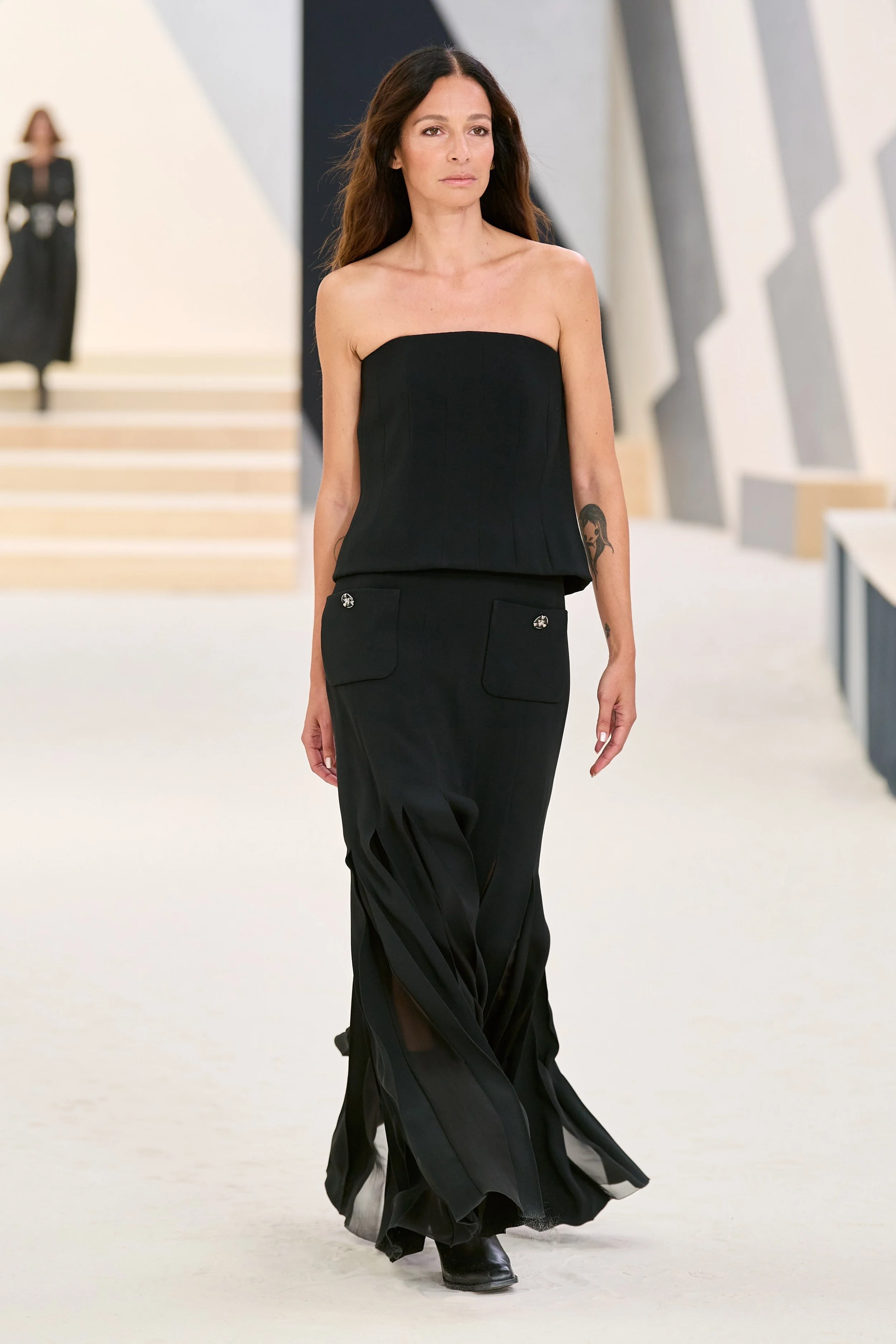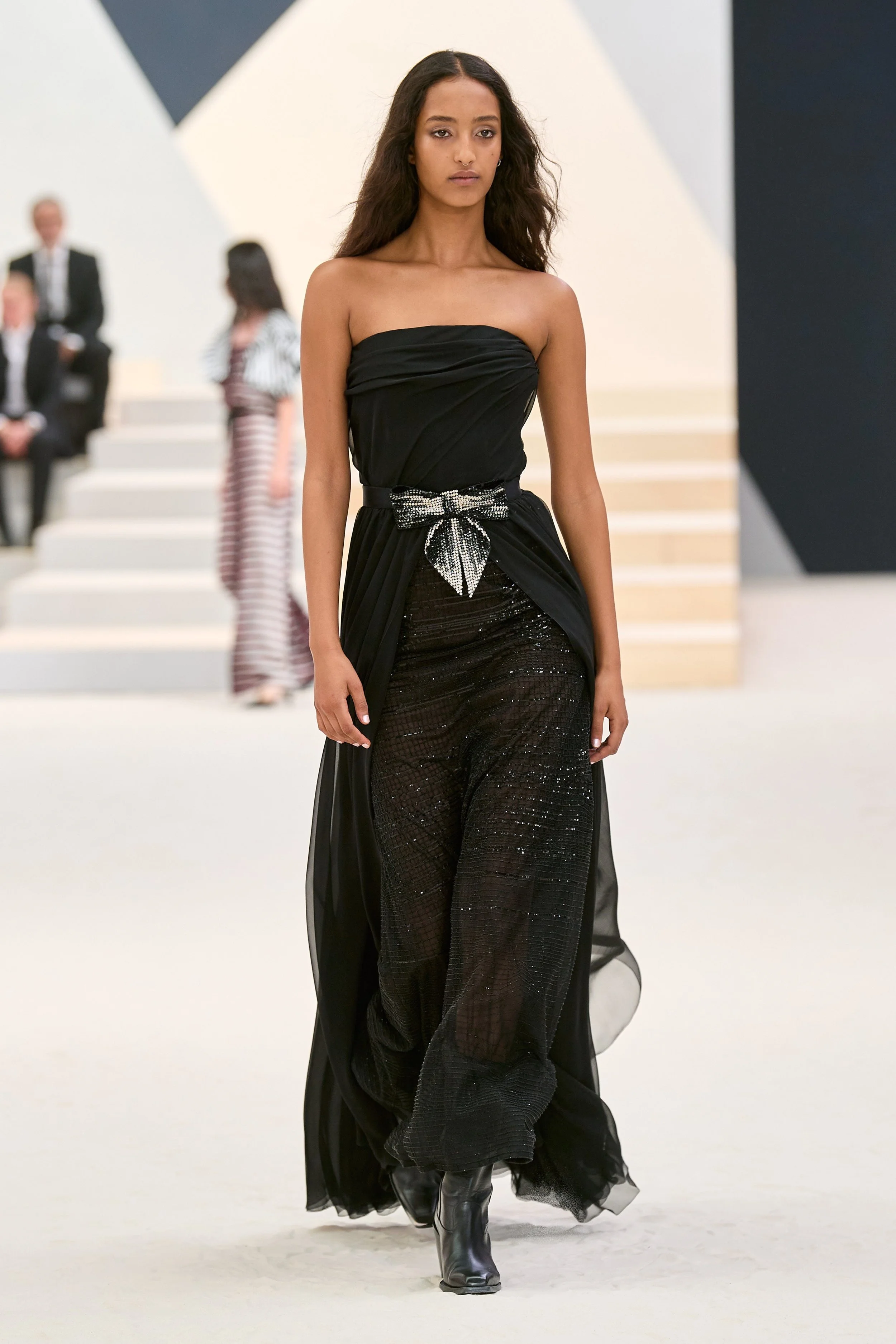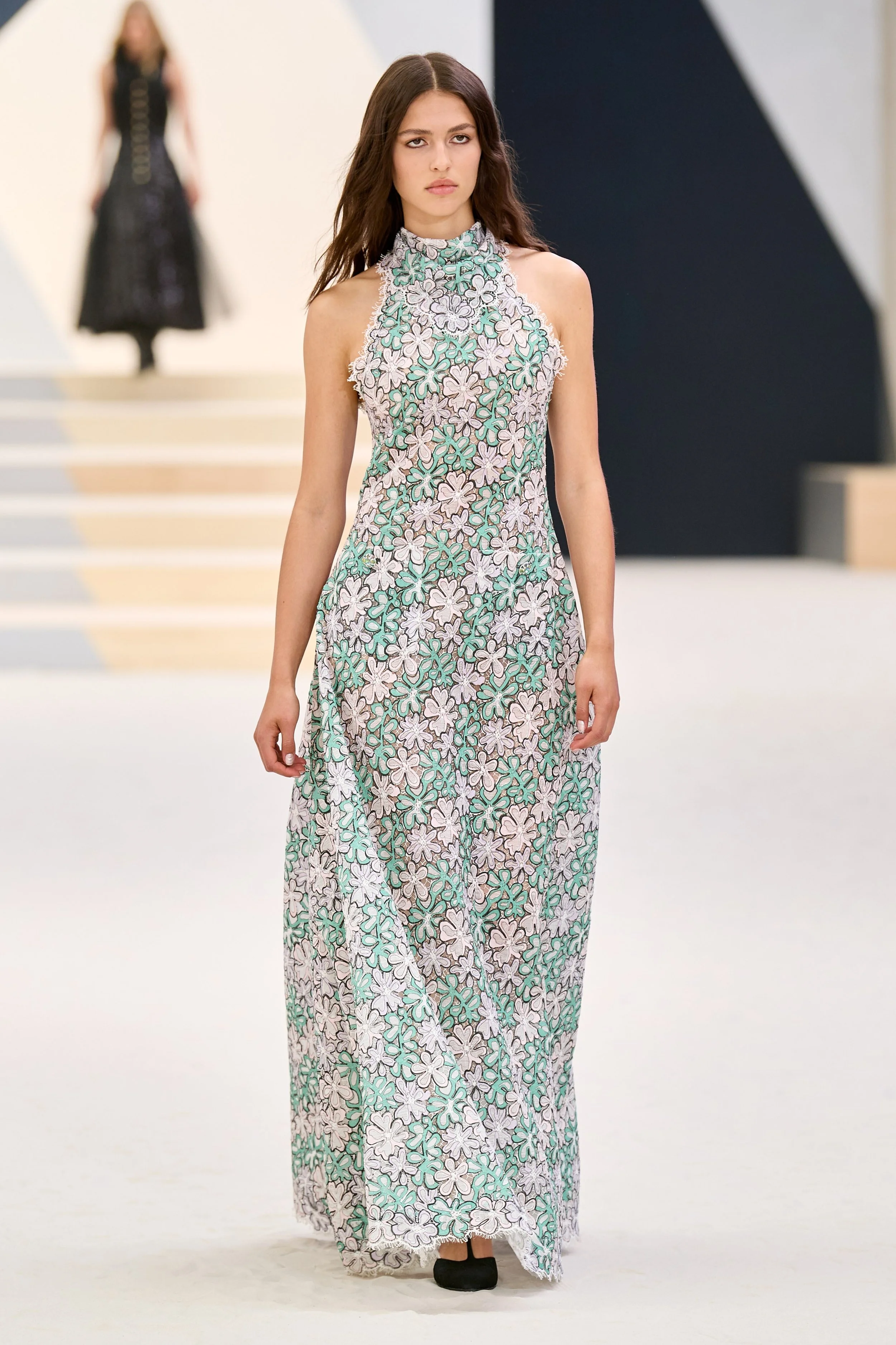 Quietly experimenting further, Virginie Viard brought various shades of green to the forefront with collarbone-highlighting gowns and two-piece suits, protruding into pleated sculptures at the bottom, enhancing the subtle storyboard of hidden detail that is a Viard signature. Further fuelling her love for reinvention, the final looks of the collection brought in multiple techniques of stoning and dazzling embellishment into A-line silhouettes with layers and layers of tulle and organza concocted with stones, jewels, sequins and pearls, delicately hand-placed for the ultimate celebration of the Chanel legacy - bold, beautiful and openly bountiful to the future.